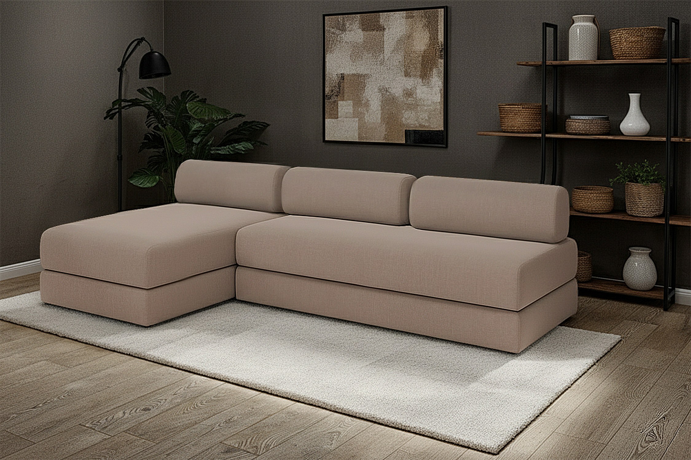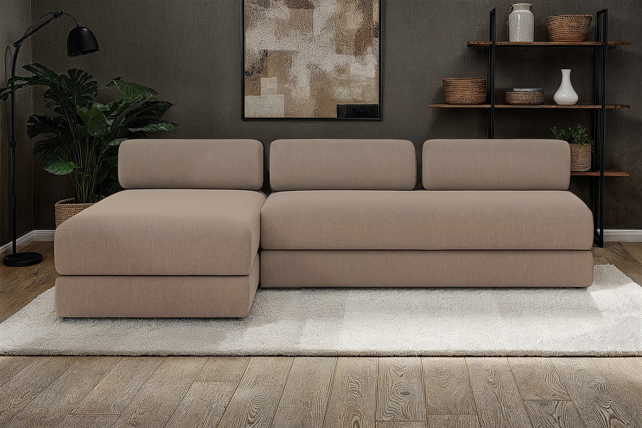 Canapé d'angle modulable et convertible 6 places - Tissu lisse - Marron