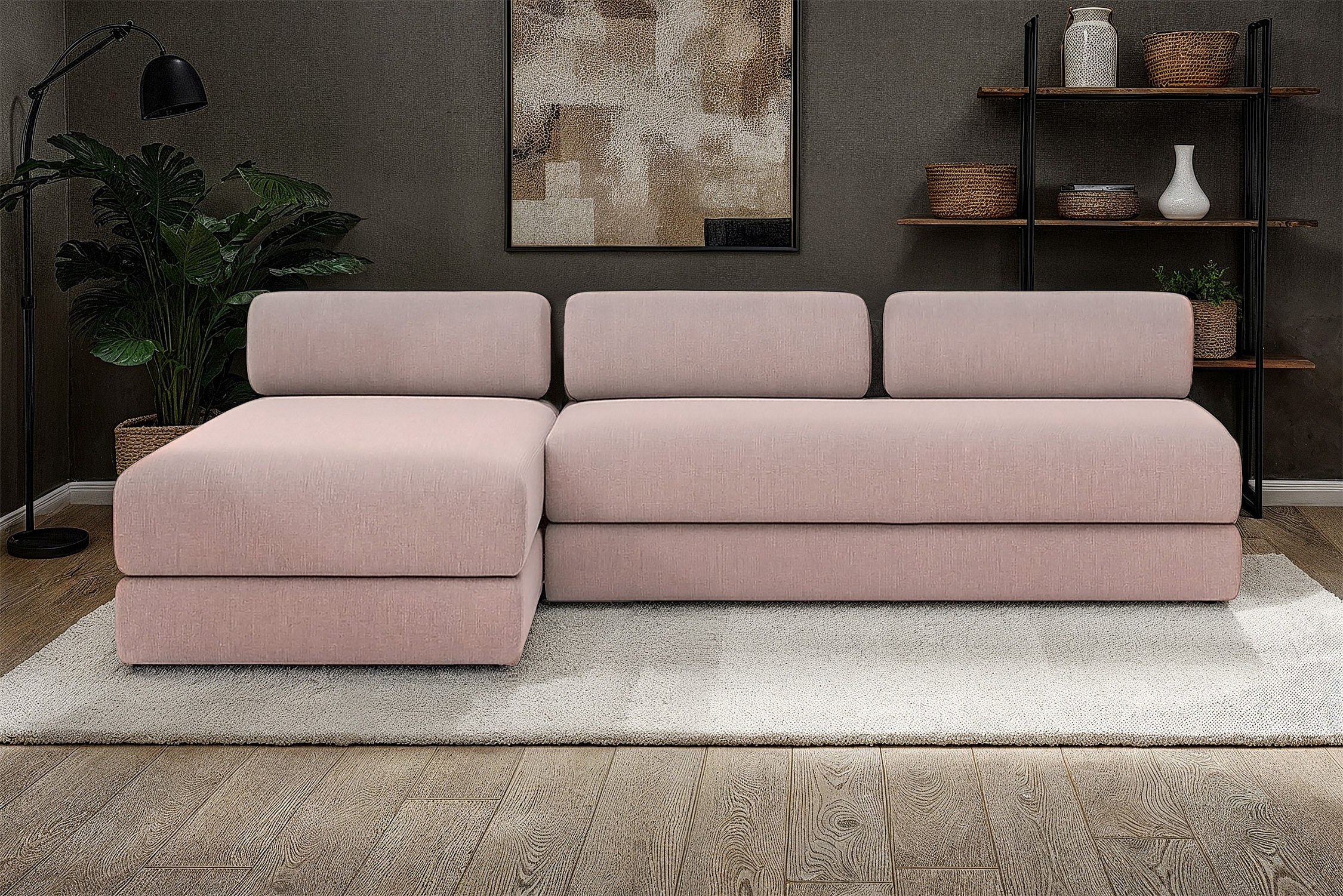 Canapé d'angle modulable et convertible 6 places - Tissu lisse - Rose