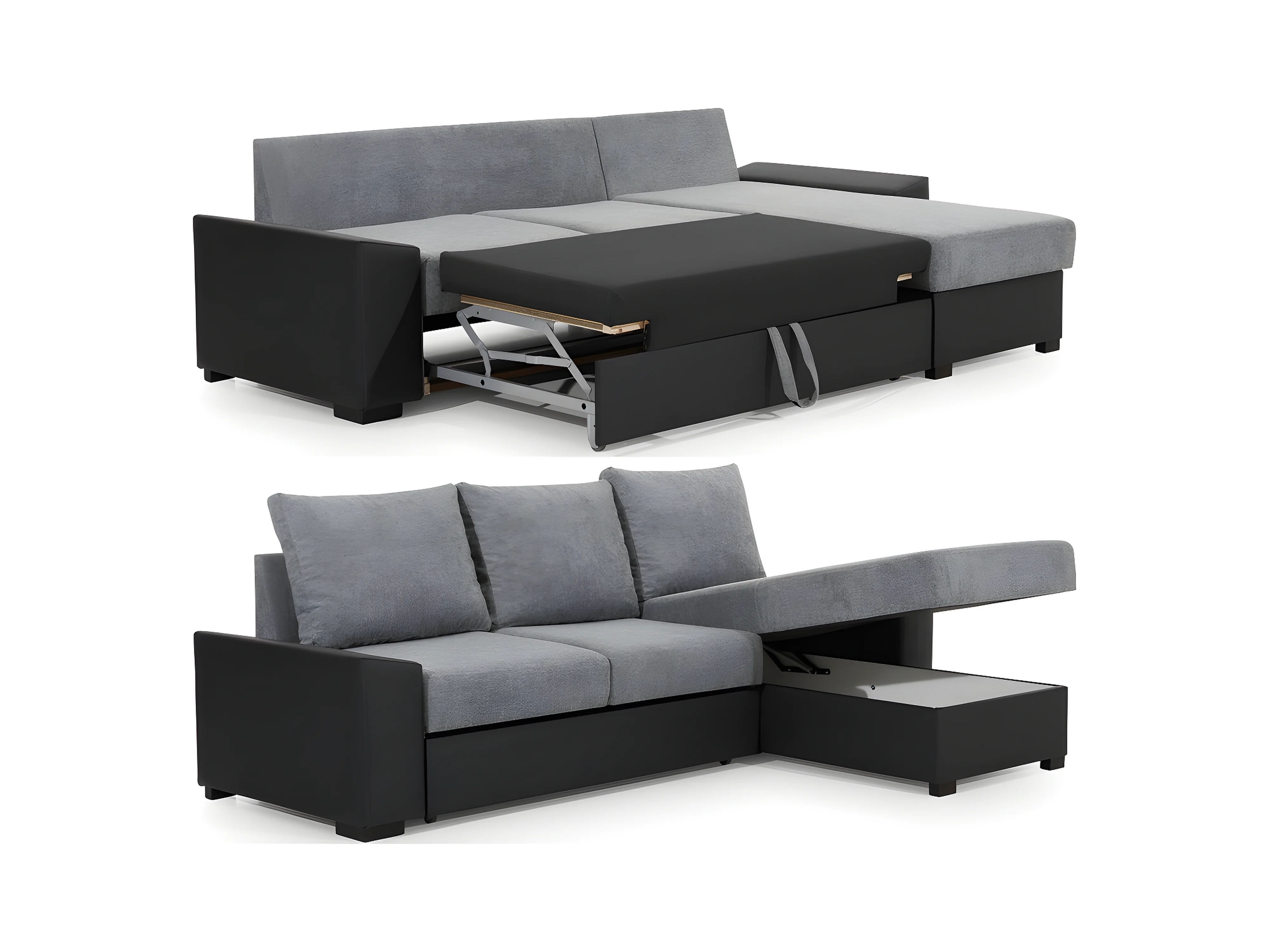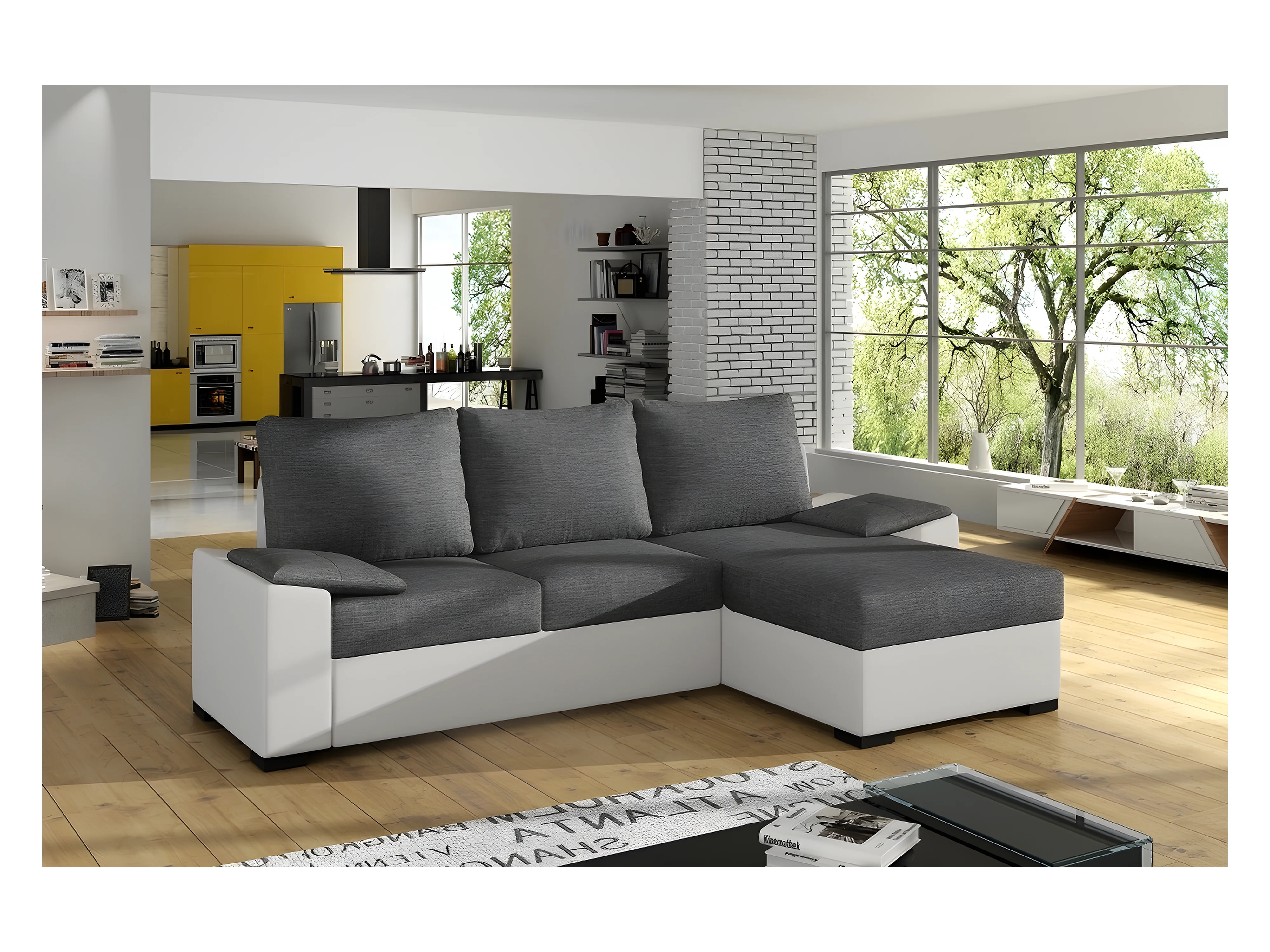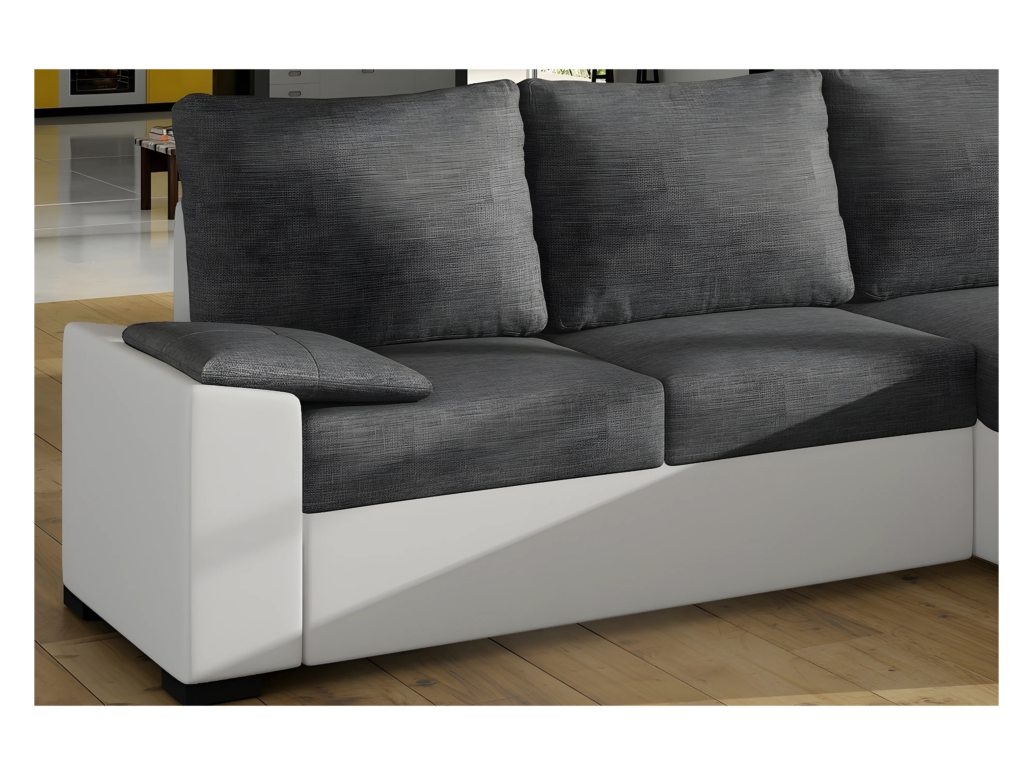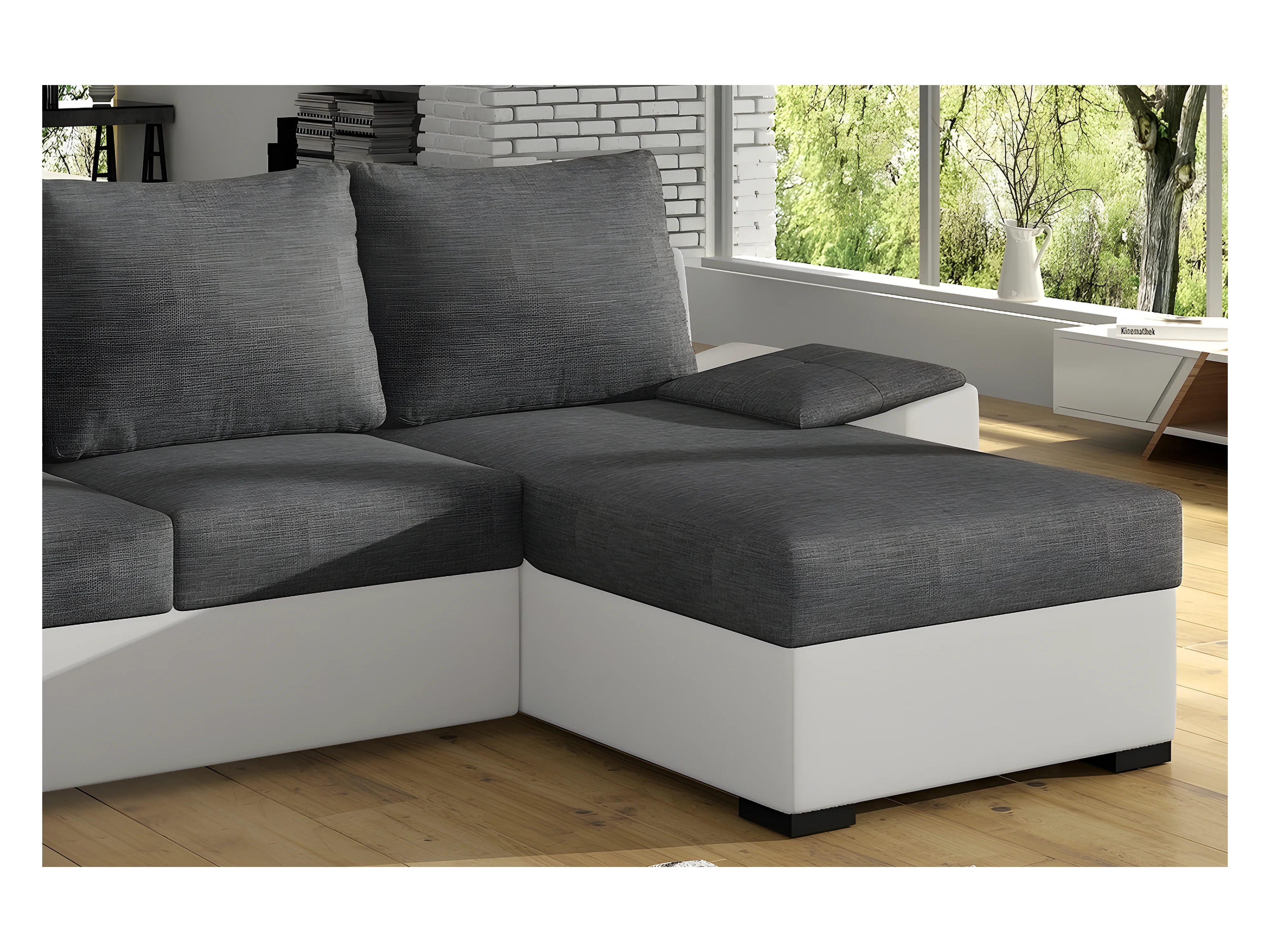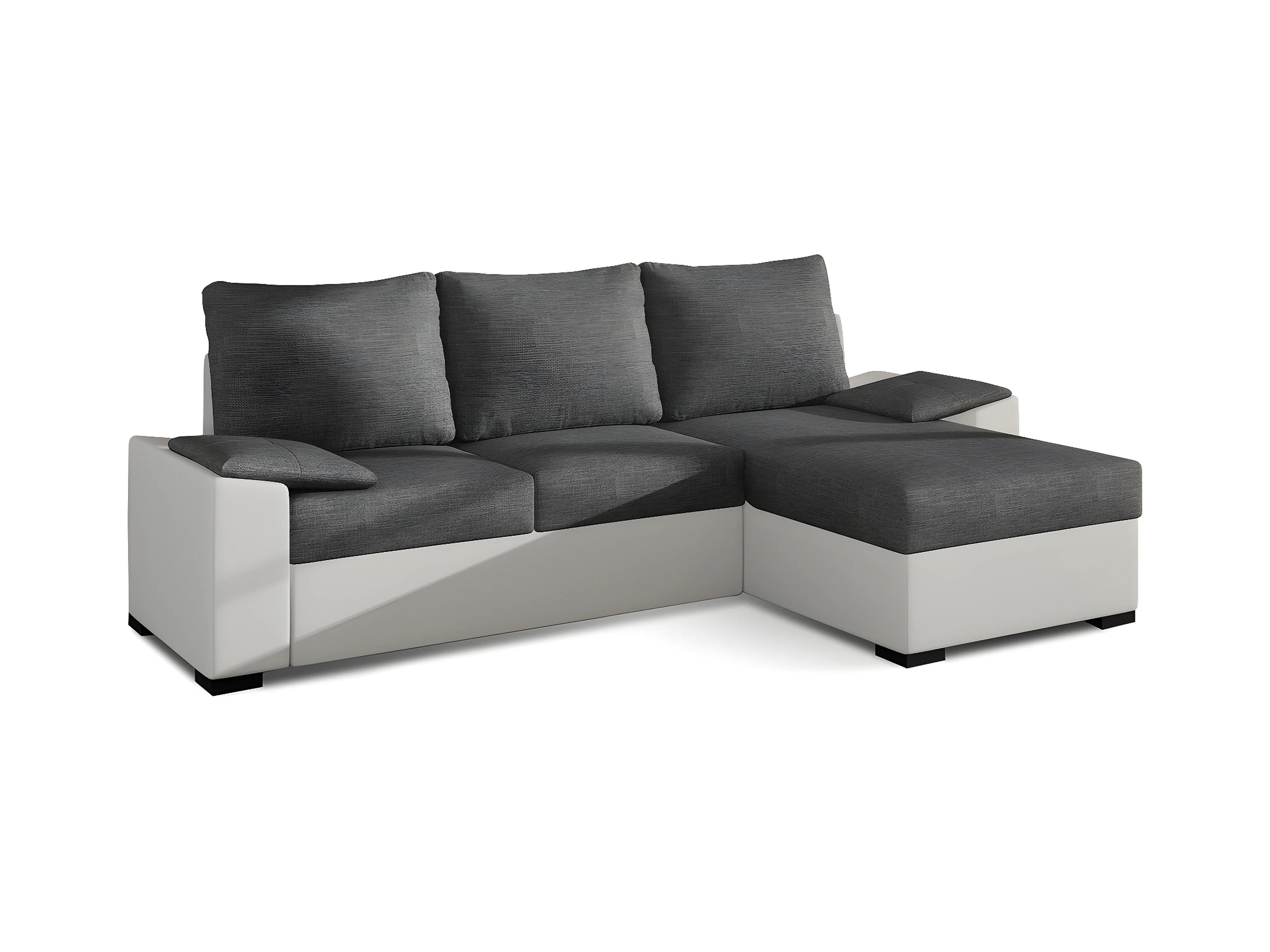 Canapé d'angle convertible en tissu gris et simili blanc, angle droit (vu de face), LUCAS