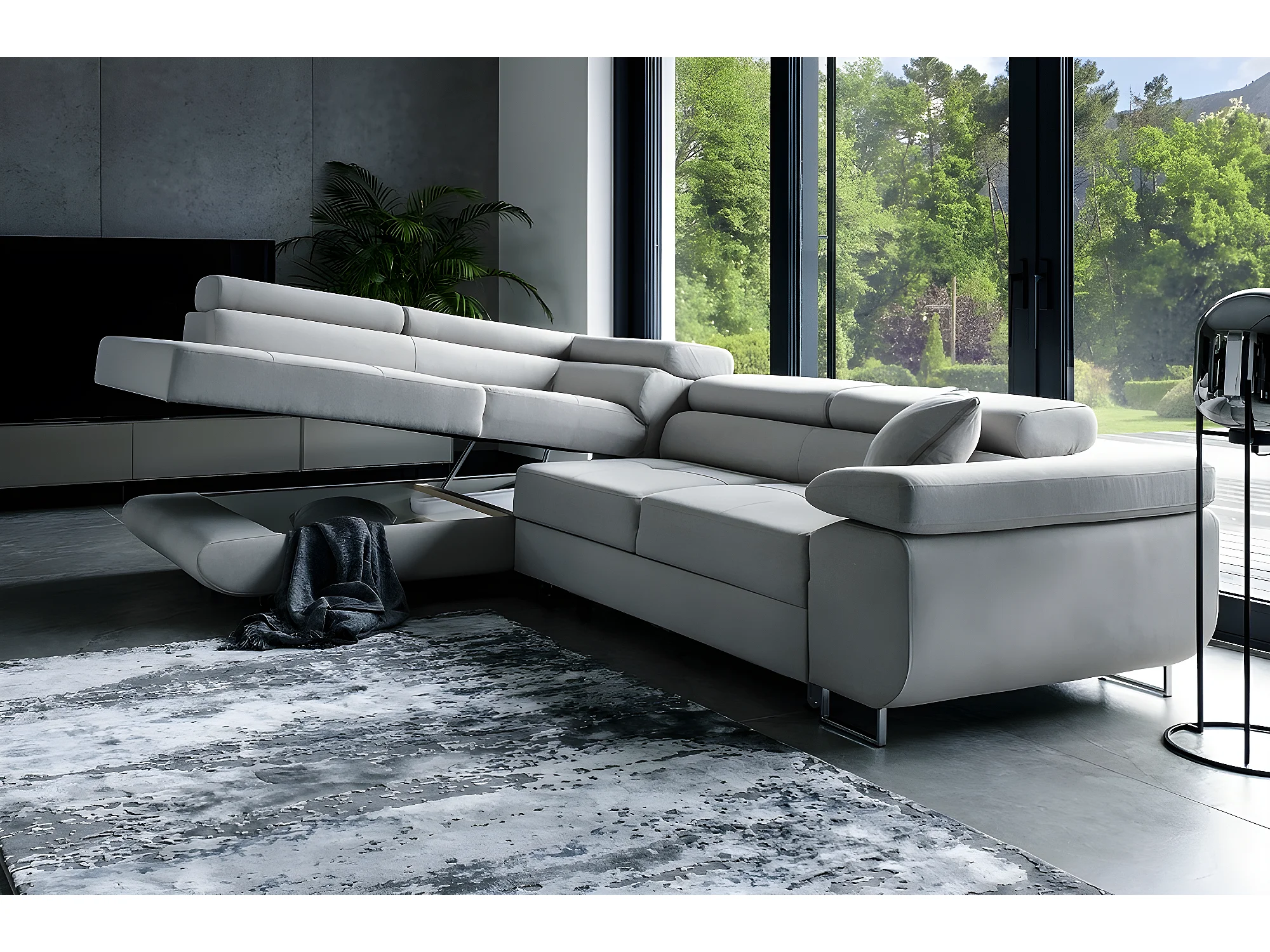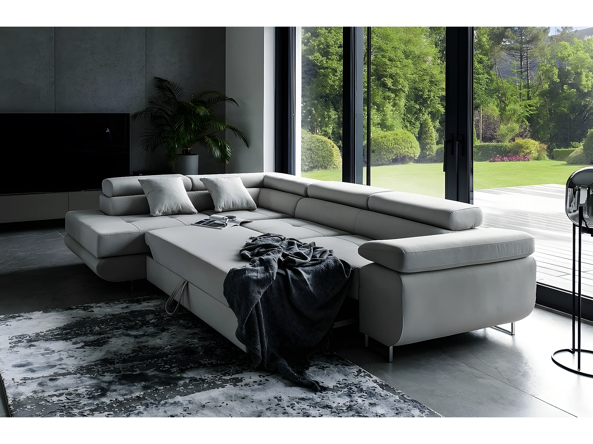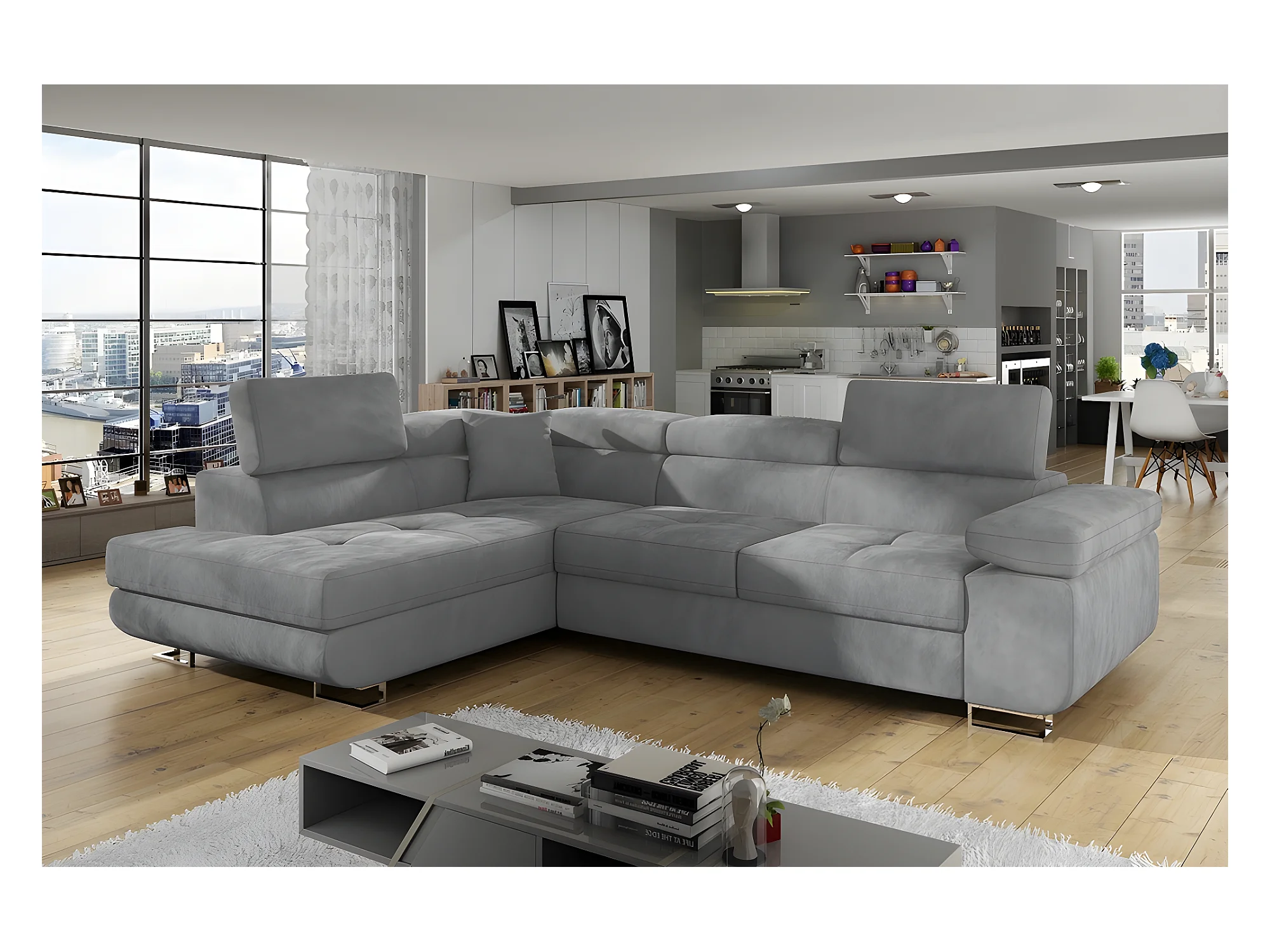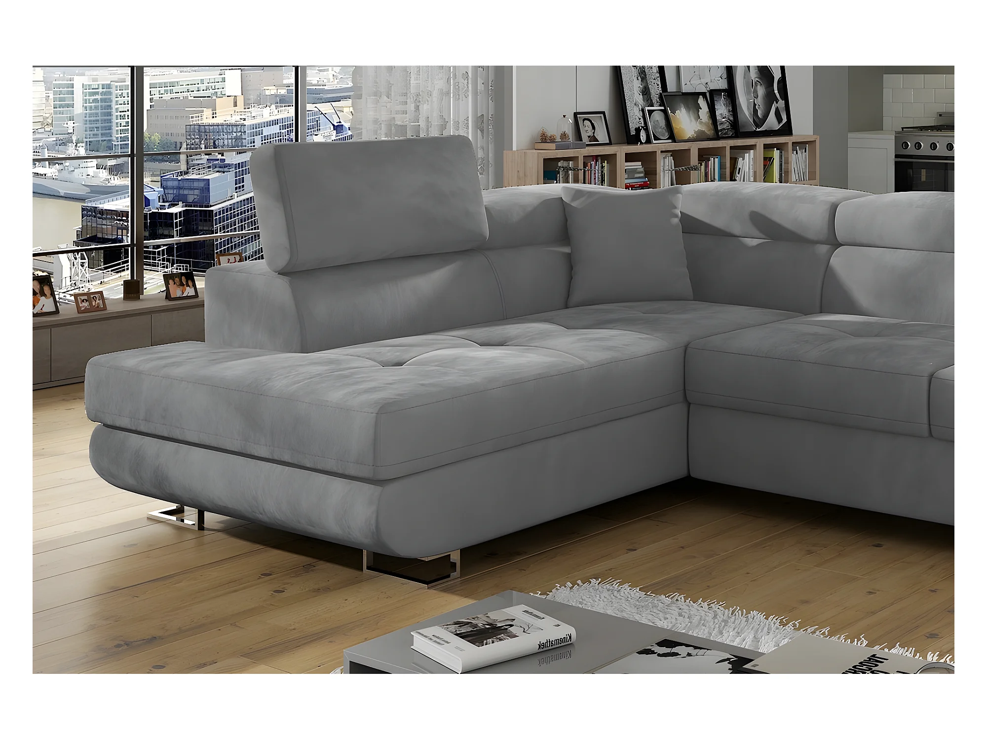 Canapé d'angle convertible en tissu luxe 5 places, avec coffre, gris clair, angle gauche (vu de face), ANNECY VELOURS