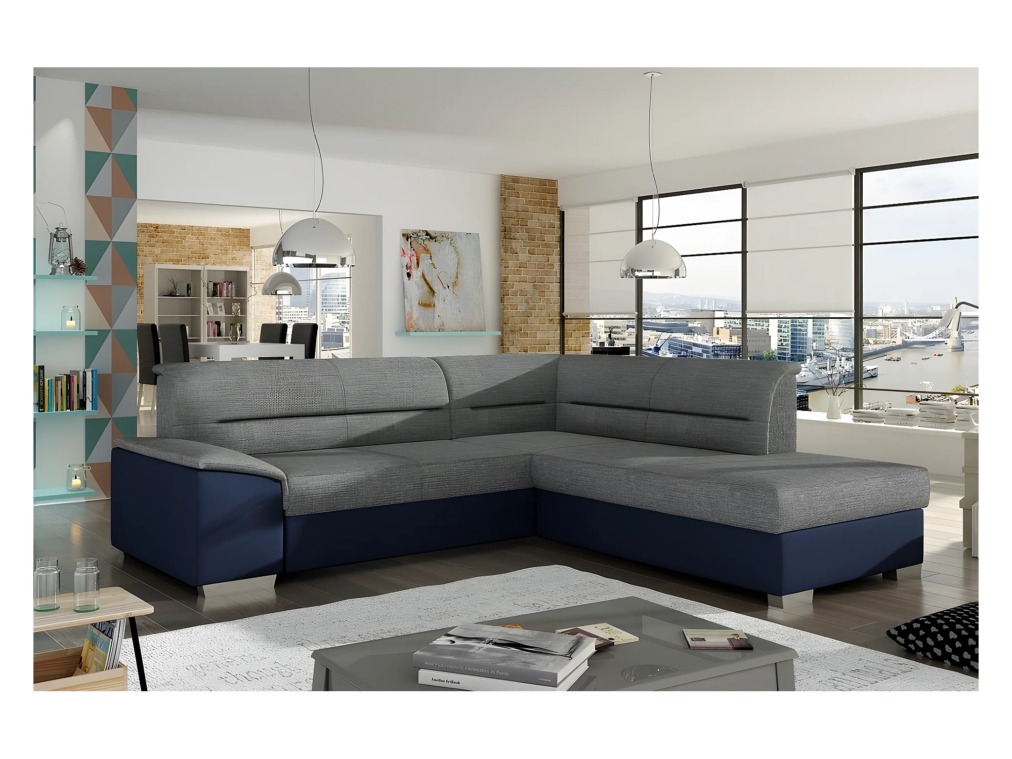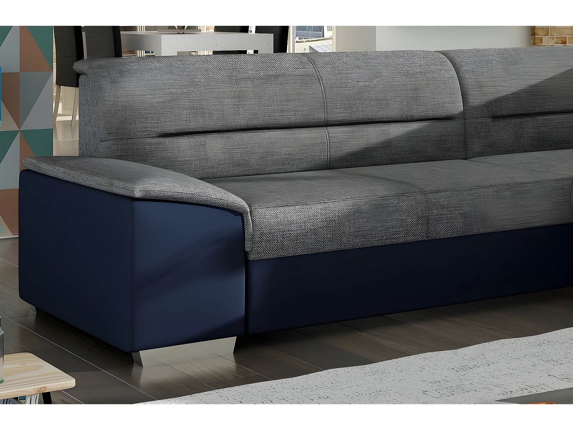 Canapé d'angle convertible en tissu luxe gris et simili cuir bleu, 5 places, avec coffre, angle droit (vu de face), VERTU MIX