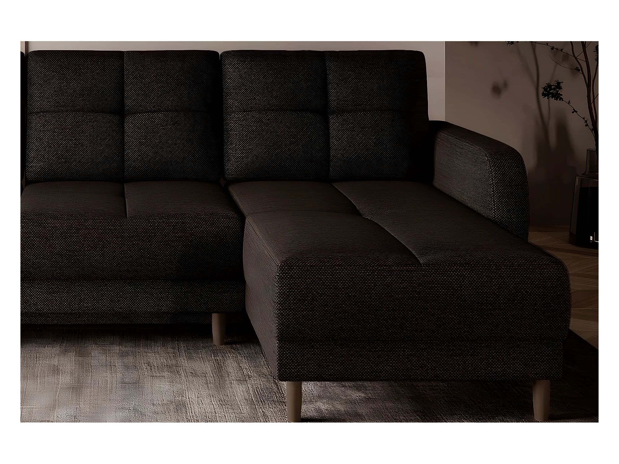 Canapé d'angle convertible en tissu luxe, rangement - chocolat, angle droit (vu de face), ROXANE