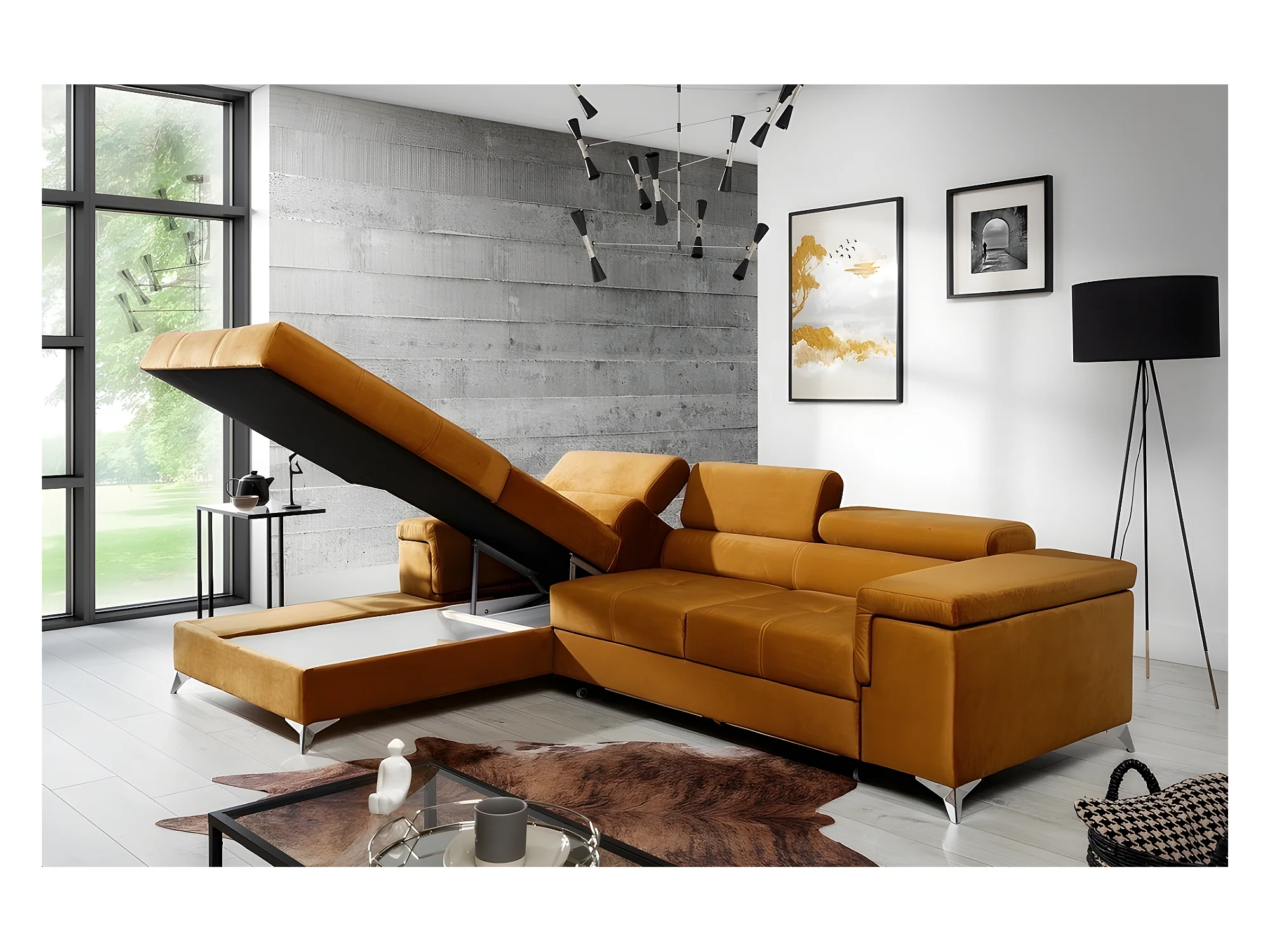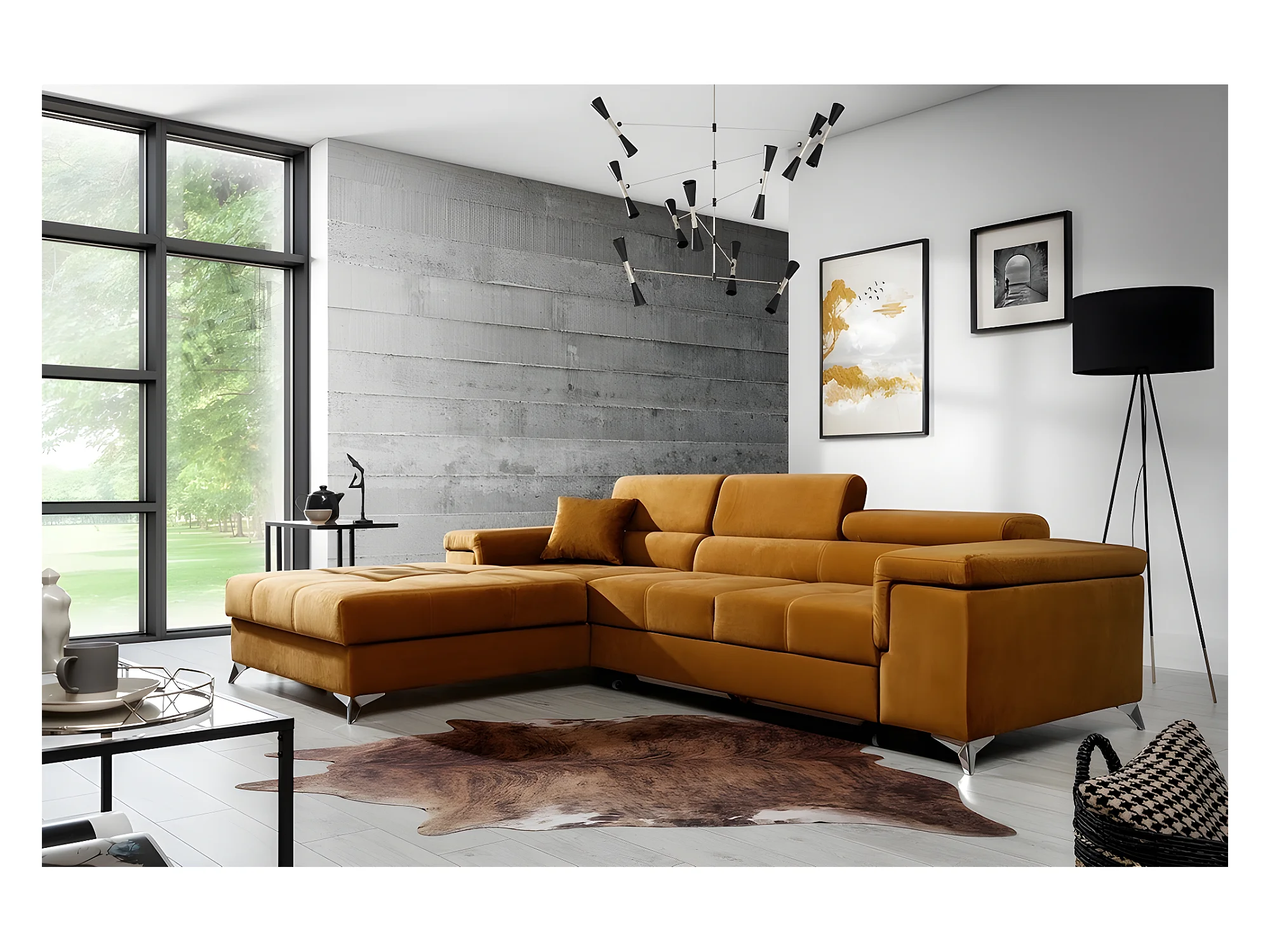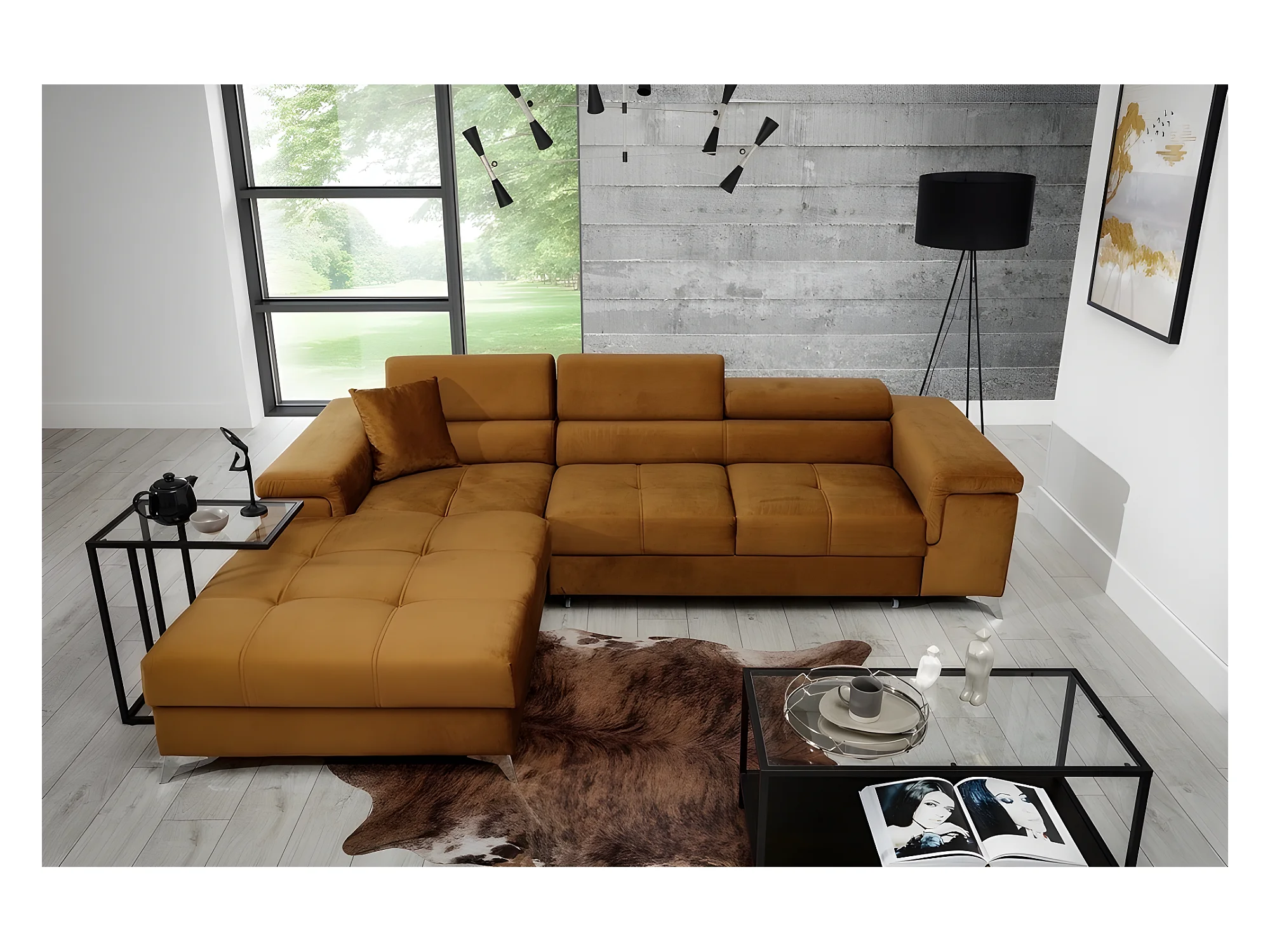 Canapé d'angle convertible en tissu velours luxe 5 places, RICHARD, couleur moutarde, angle gauche