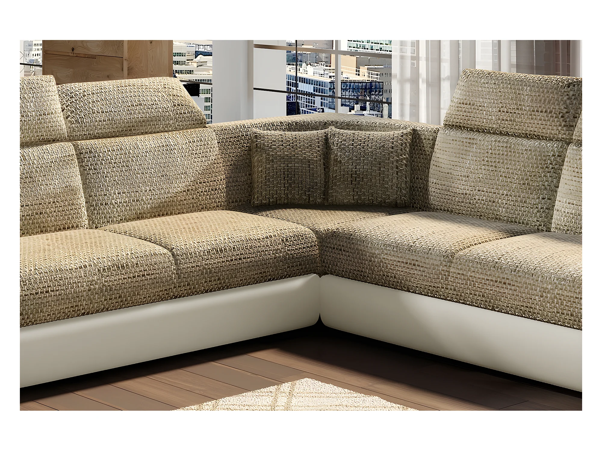 Canapé d'angle - convertible - FELIPE - en tissu beige et simili cuir écru, 5/6 places