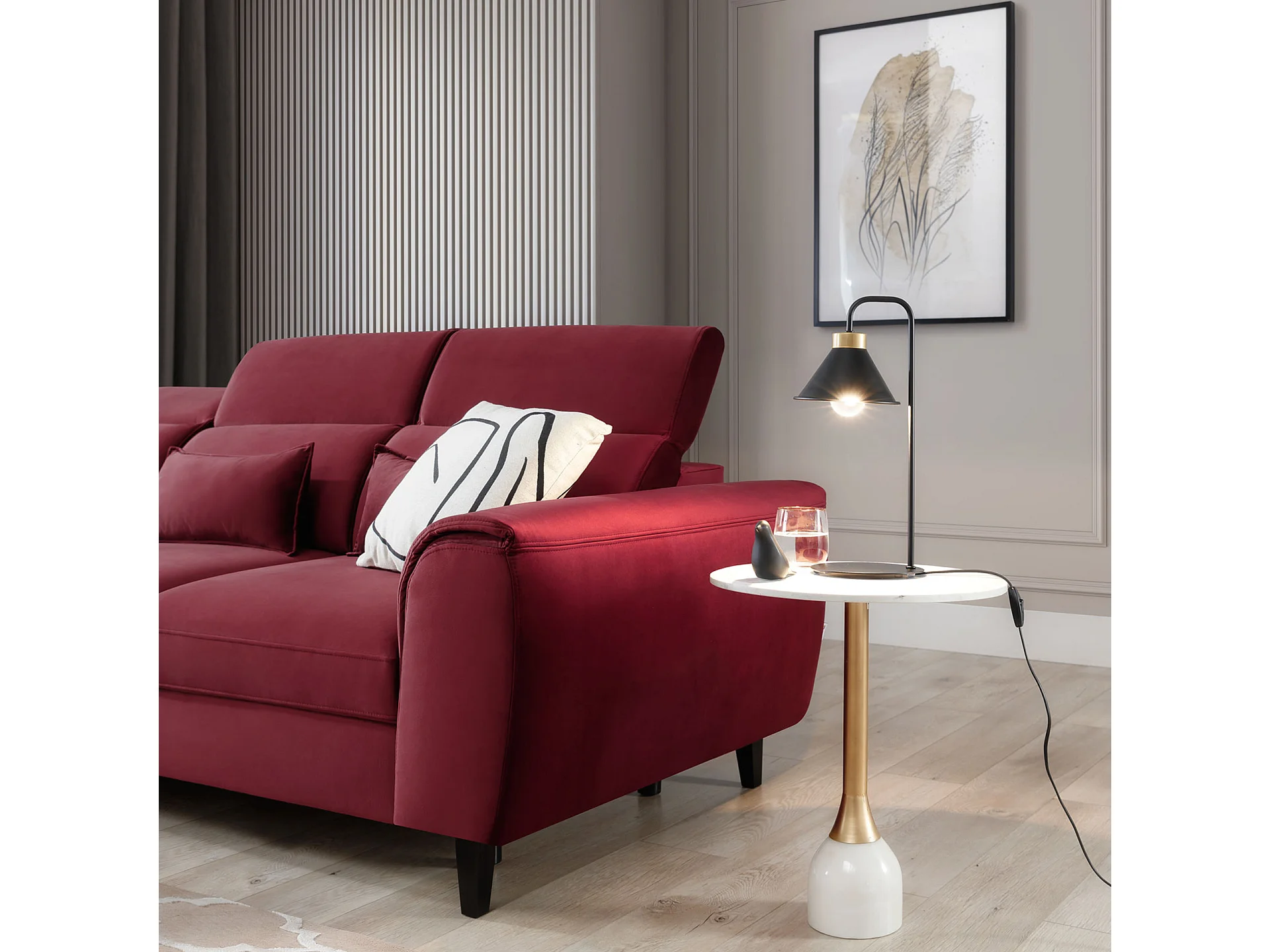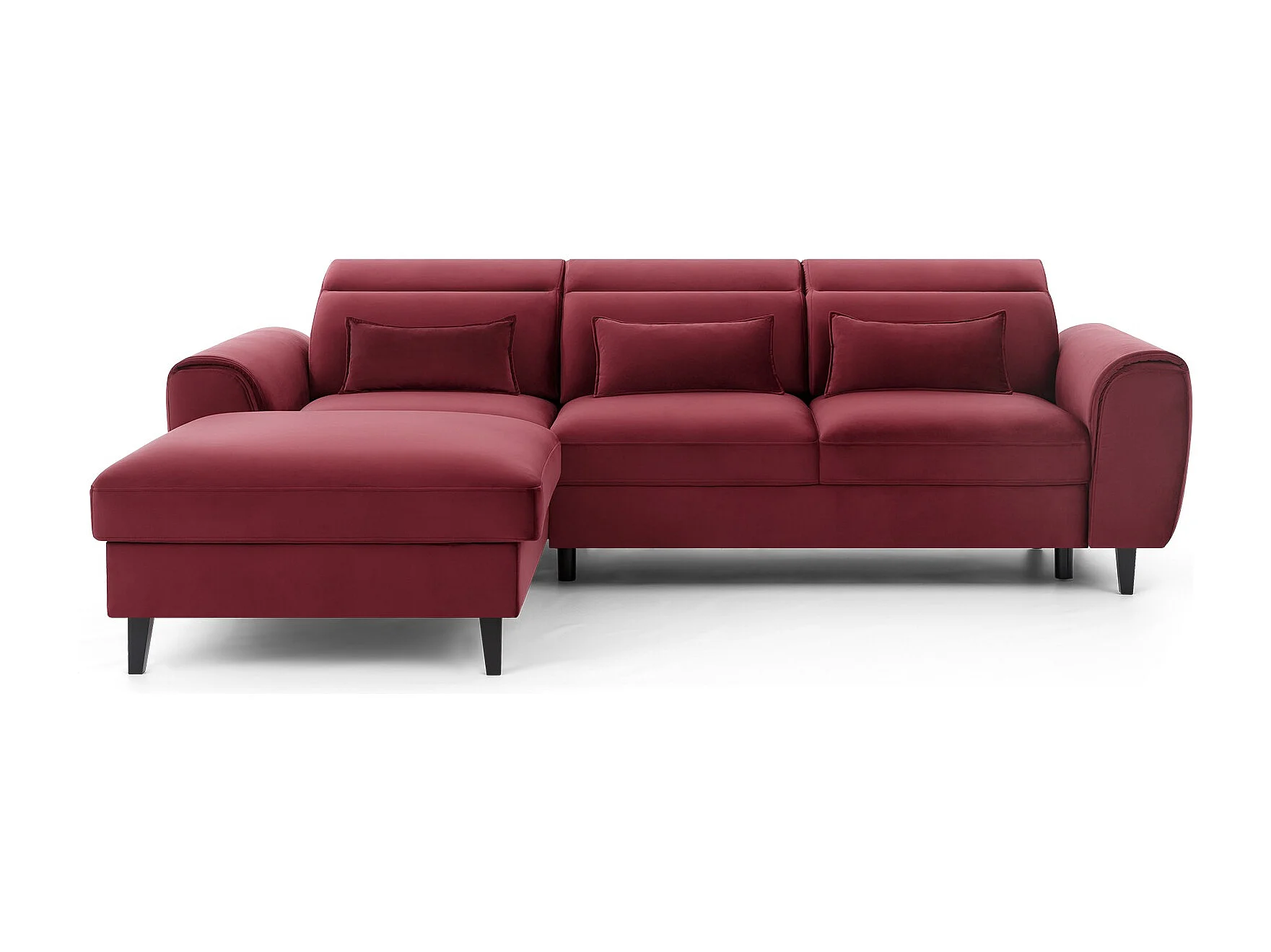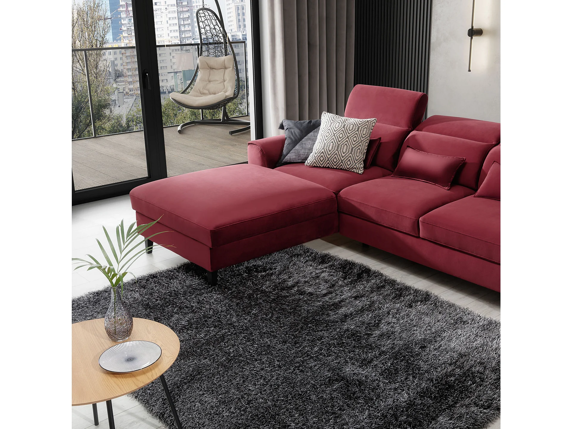 Canapé d'angle convertible velours appuis-tête réglables ASTORIA - Coffre et pieds bois noir-Rouge cerise-angle gauche