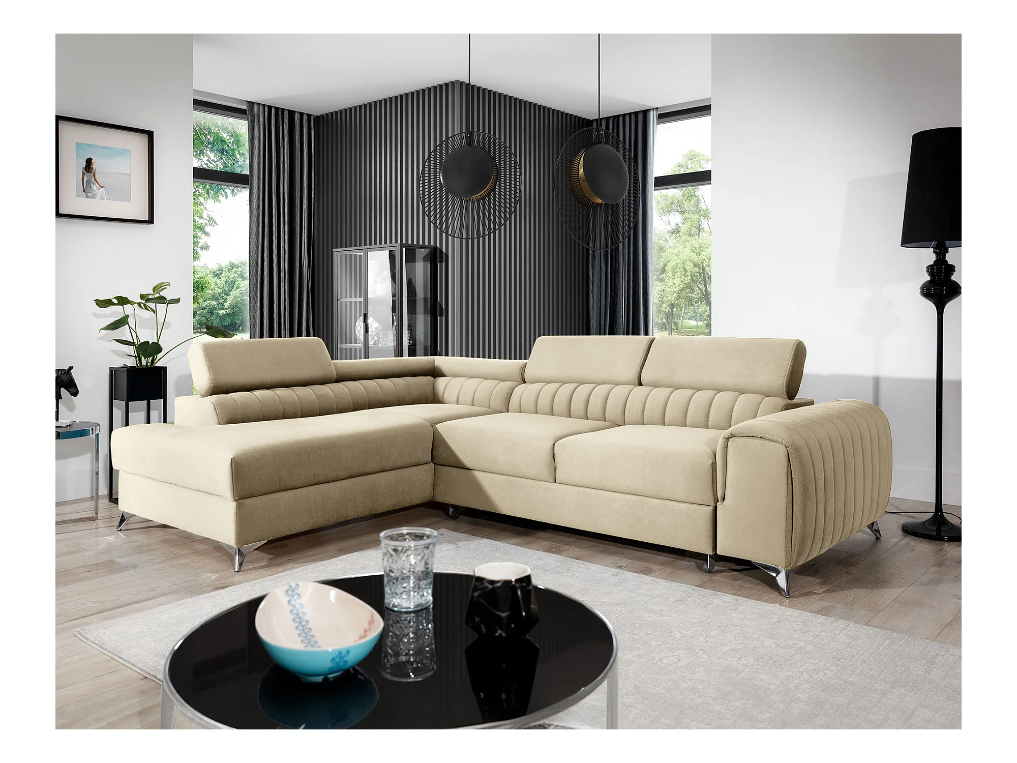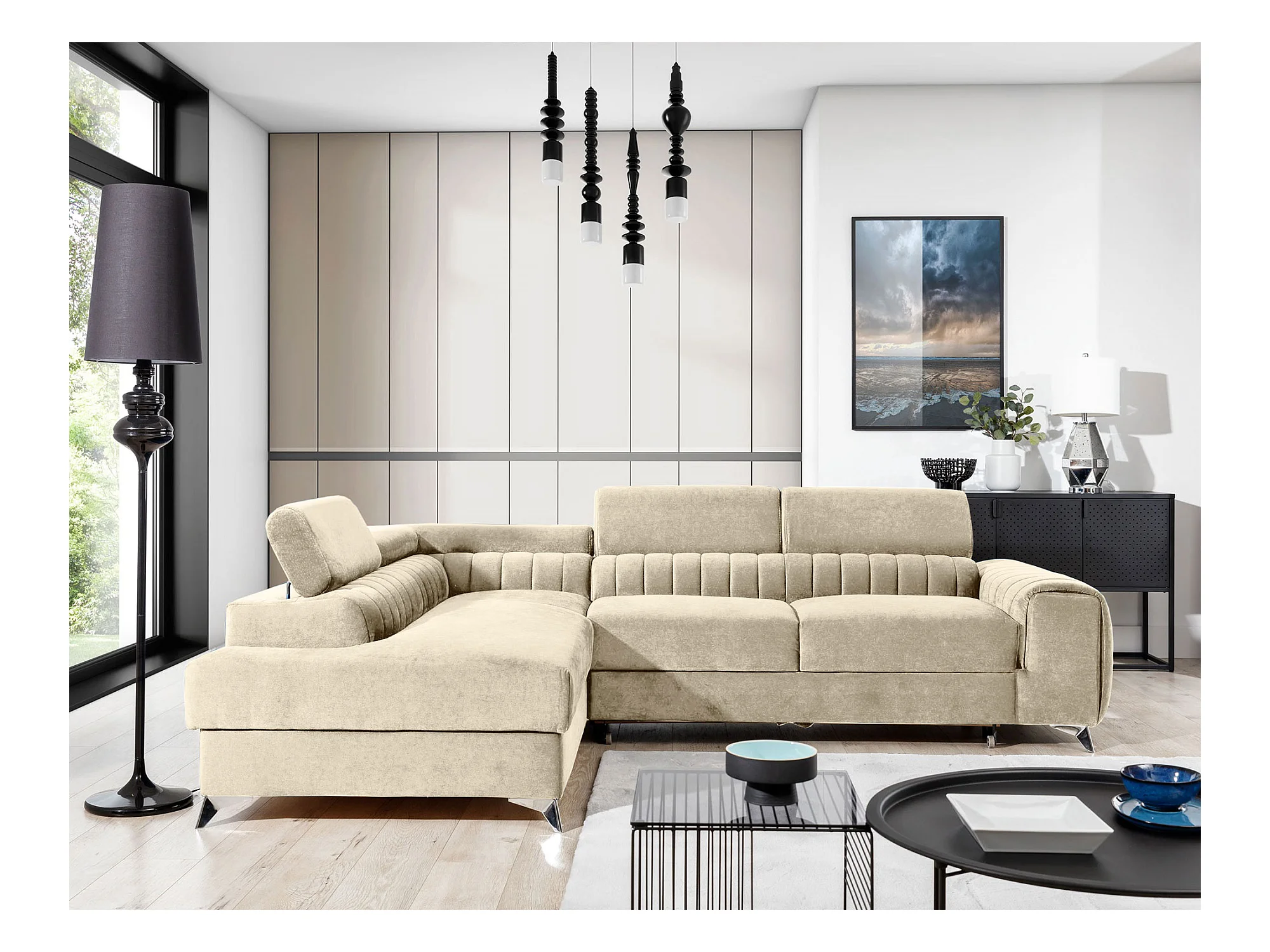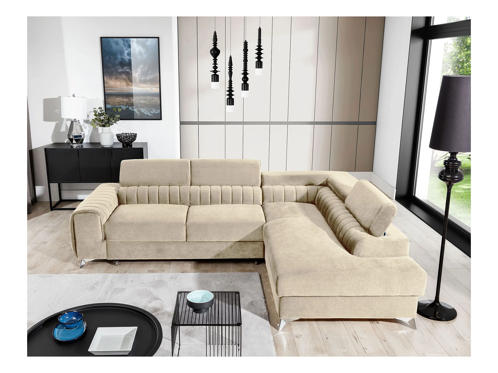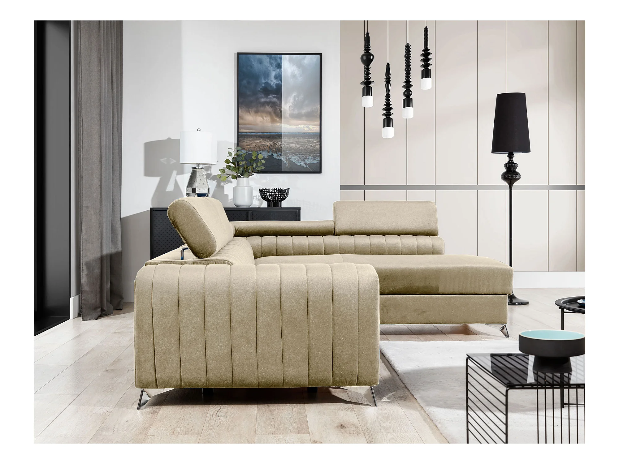 Canapé d'angle convertible velours appuis-tête réglables LOZA - Coffre et pieds acier chromé-Crème-angle gauche