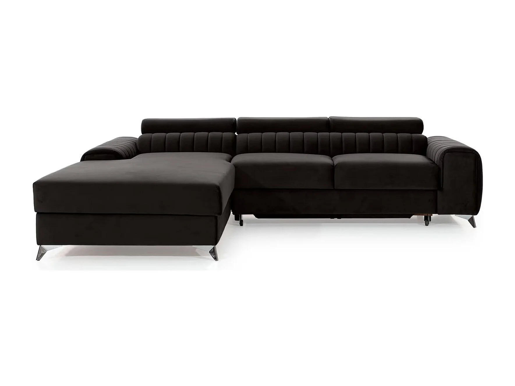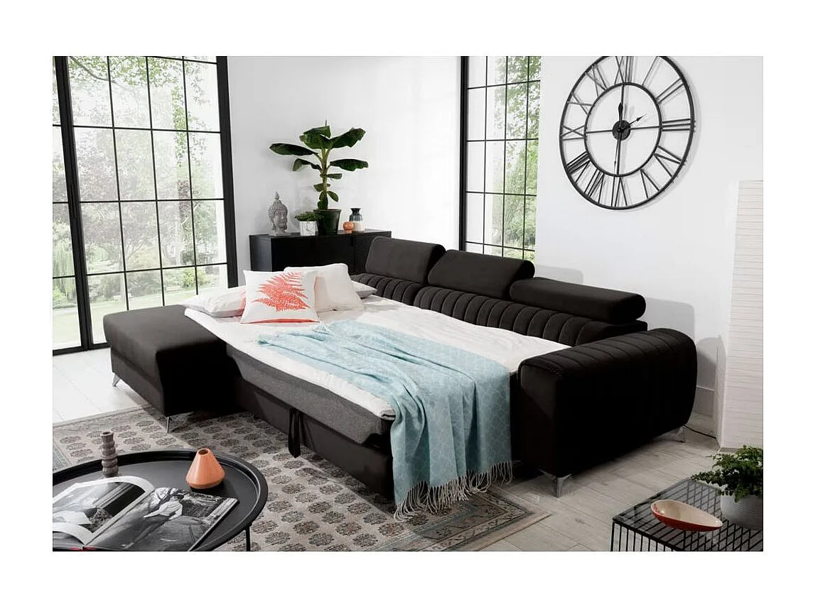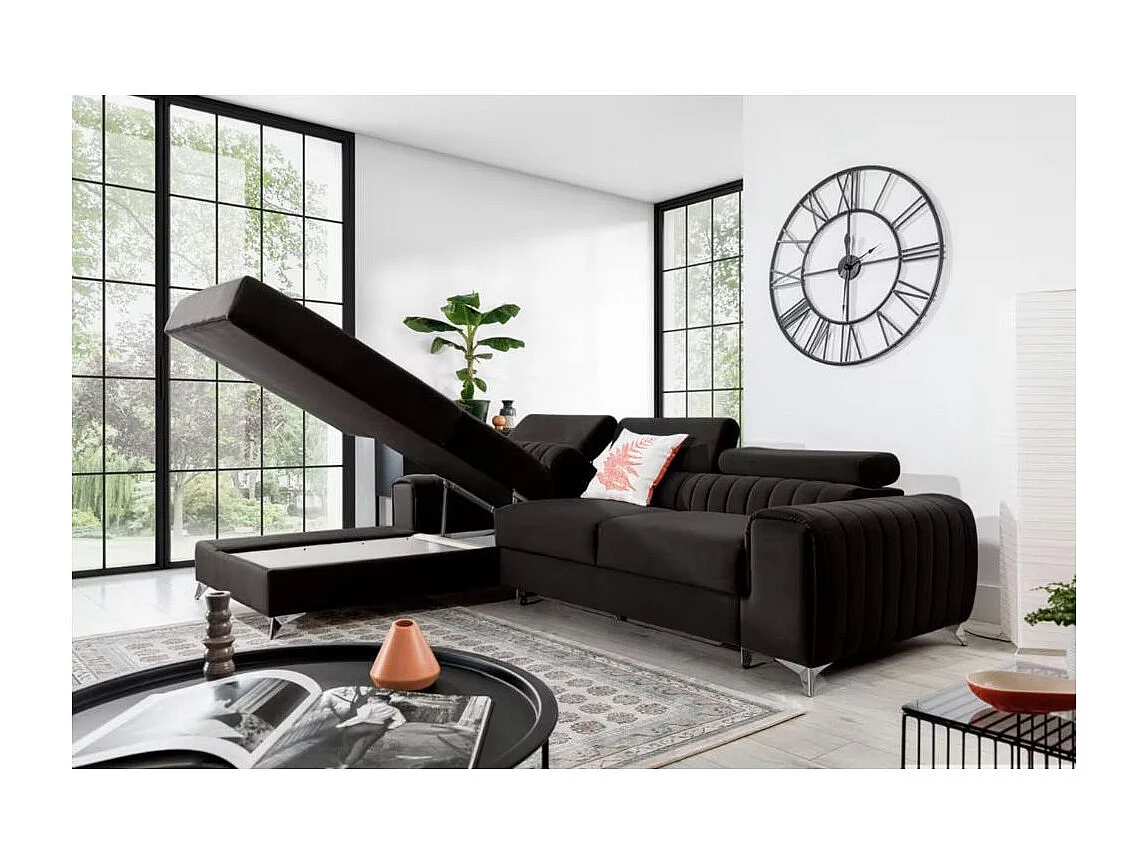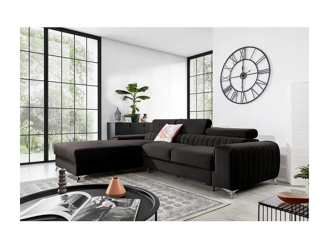 Canapé d'angle convertible velours têtière réglables GRENKY - Coffre, pieds acier chromé-Gris anthracite-angle gauche