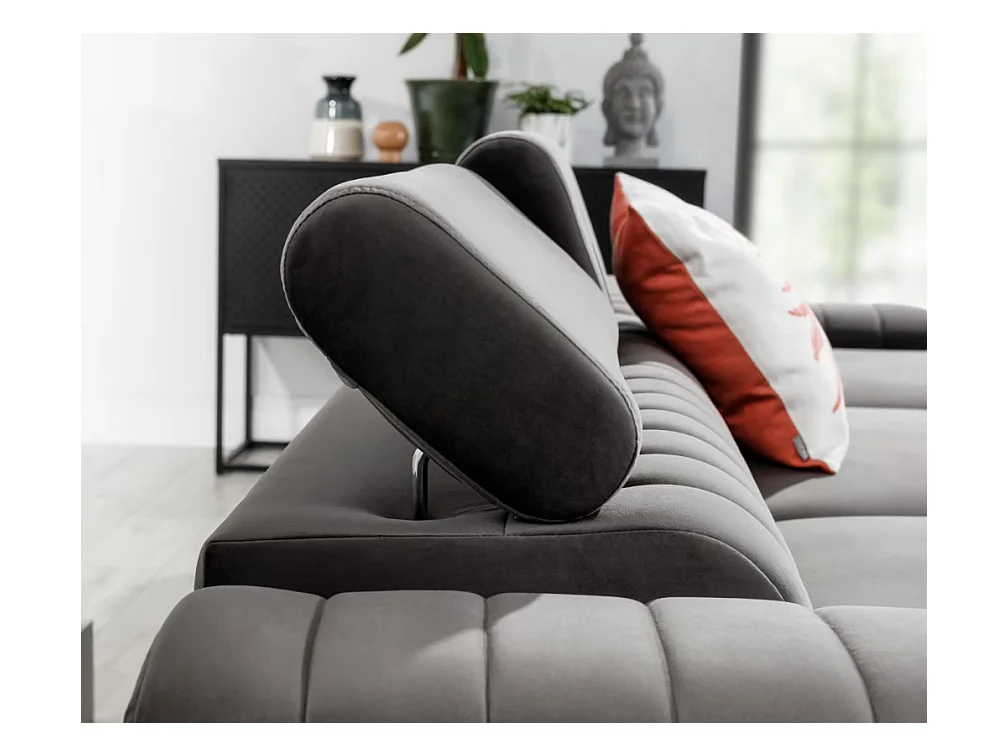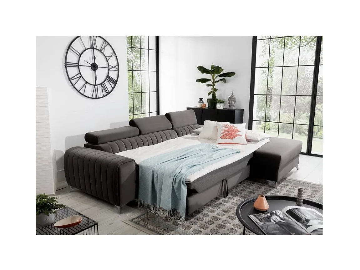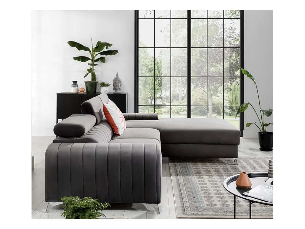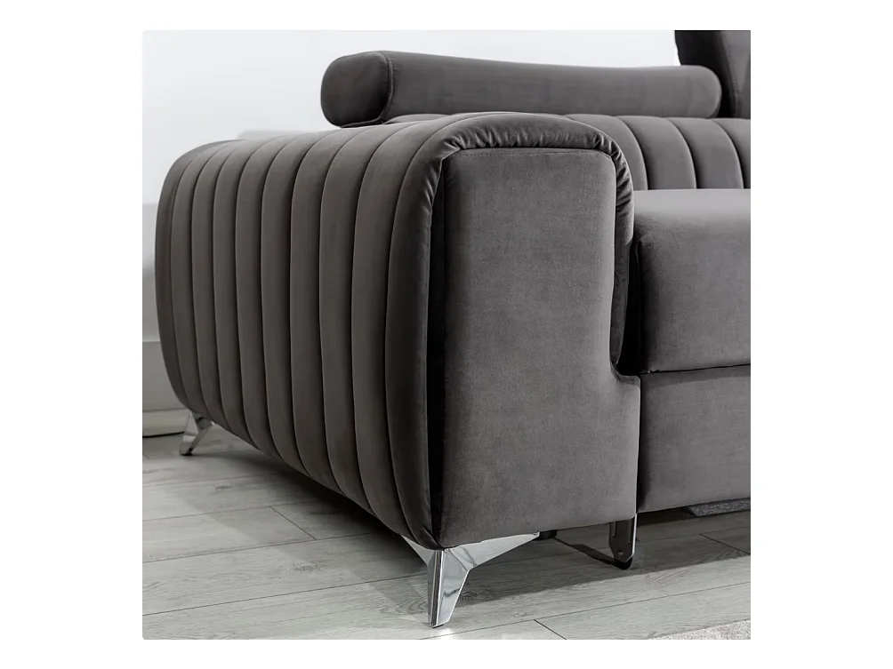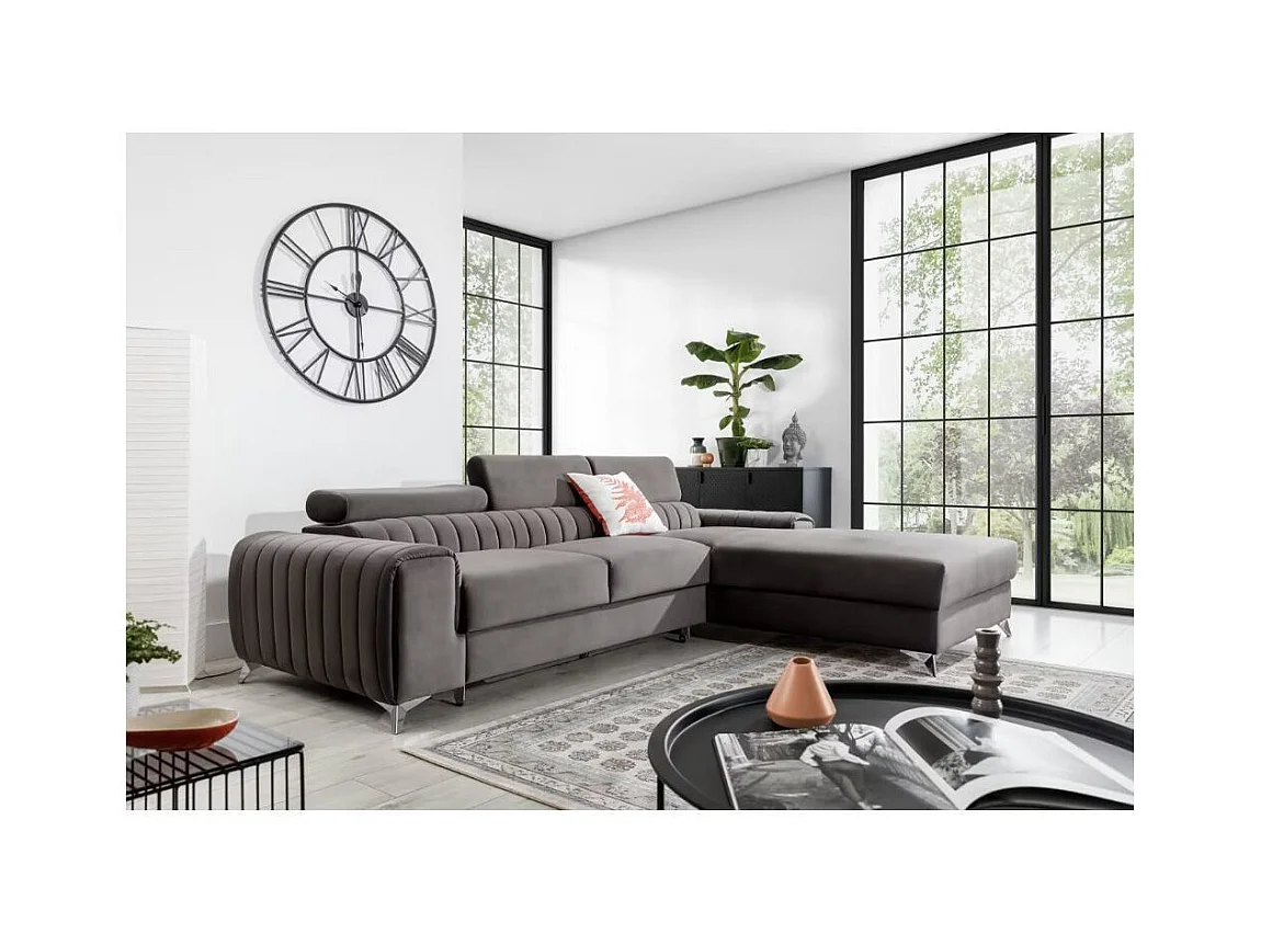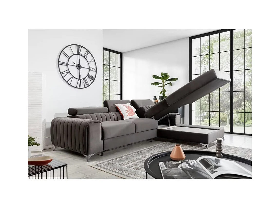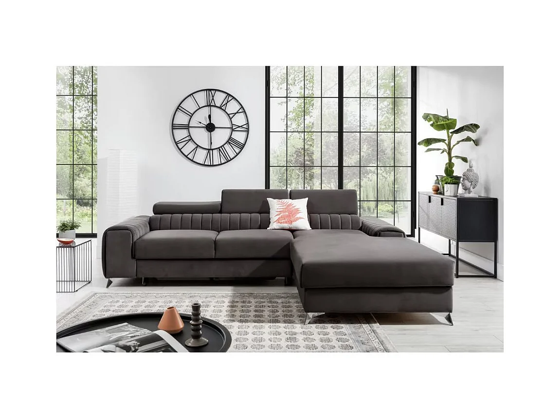 Canapé d'angle convertible velours têtière réglables GRENKY - Coffre, pieds acier chromé-Gris taupe-angle droit