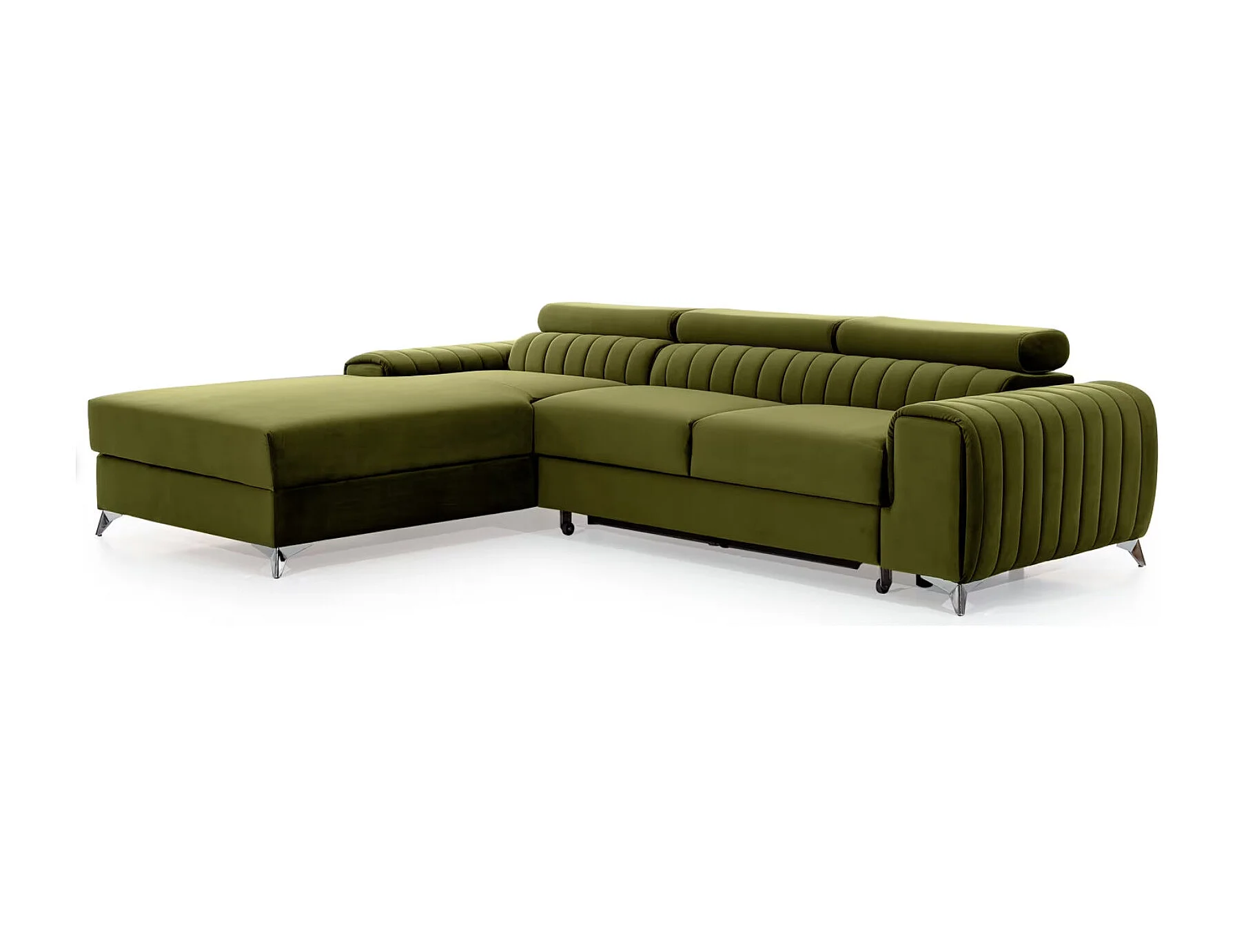 Canapé d'angle convertible velours têtière réglables GRENKY - Coffre, pieds acier chromé-Vert olive-angle gauche