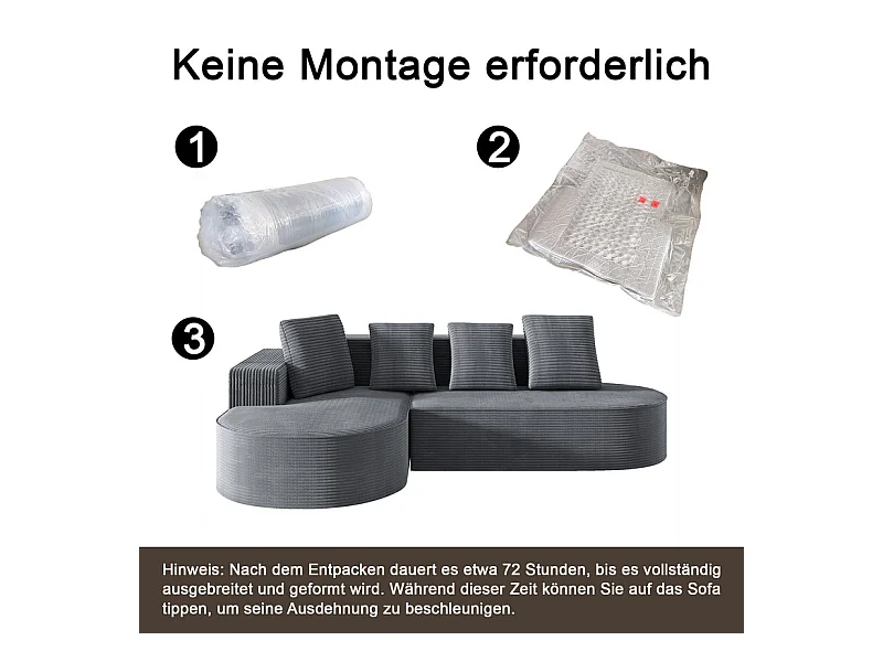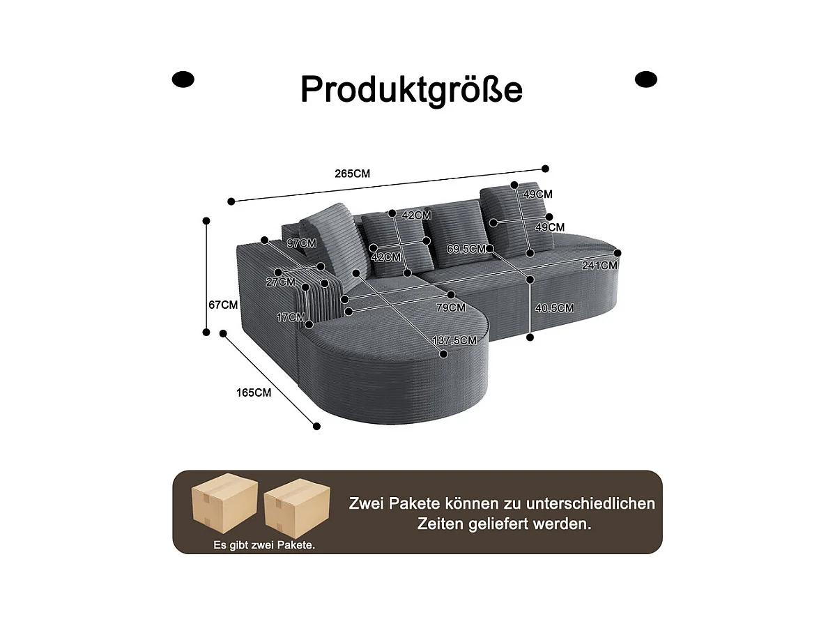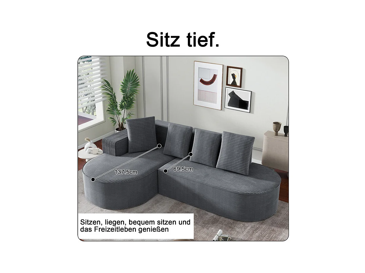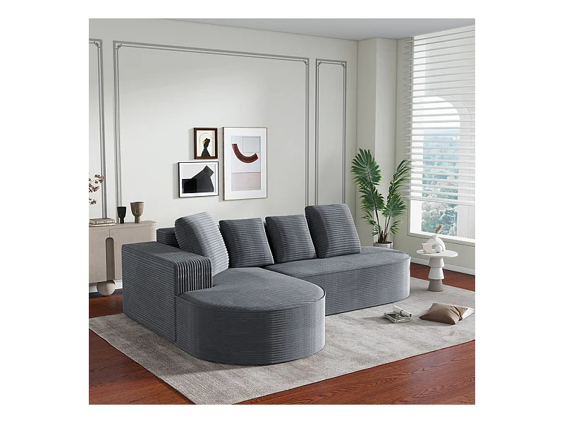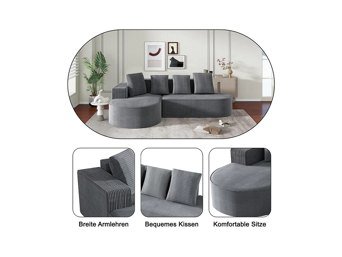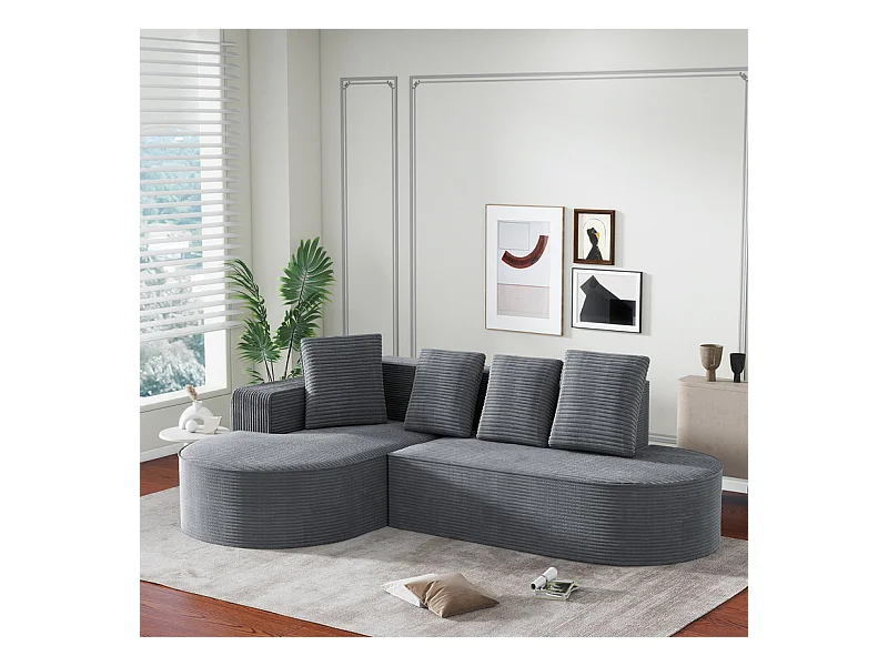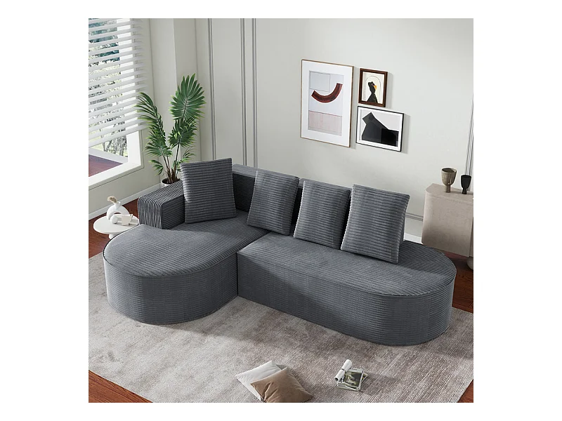 Canapé d'angle gauche en Velours Côtelé grosses côtes avec 4 oreillers - 265x67x40,5cm - Gris