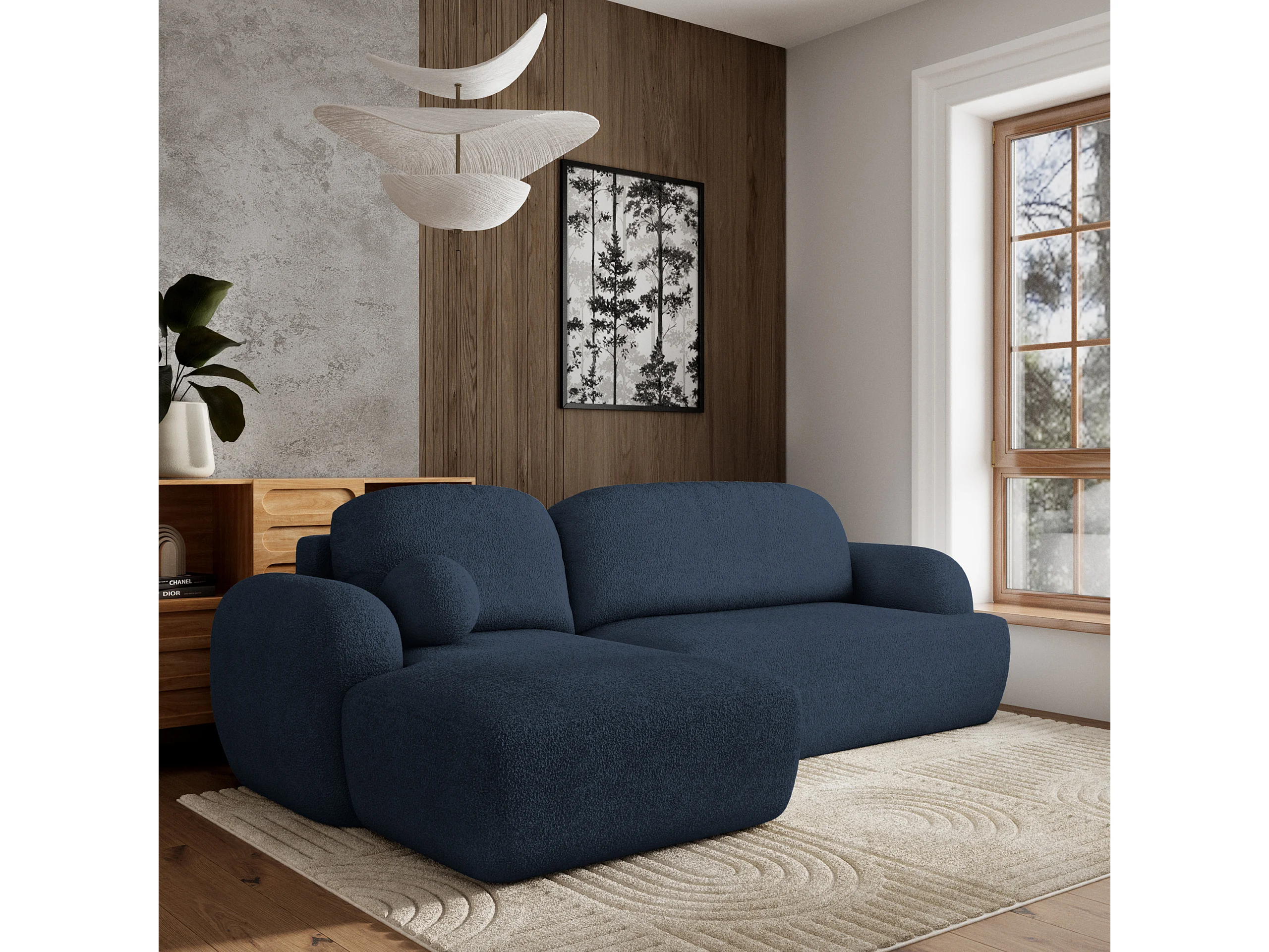 Canapé d'angle MODENZA Bleu en bouclé avec fonction de couchage