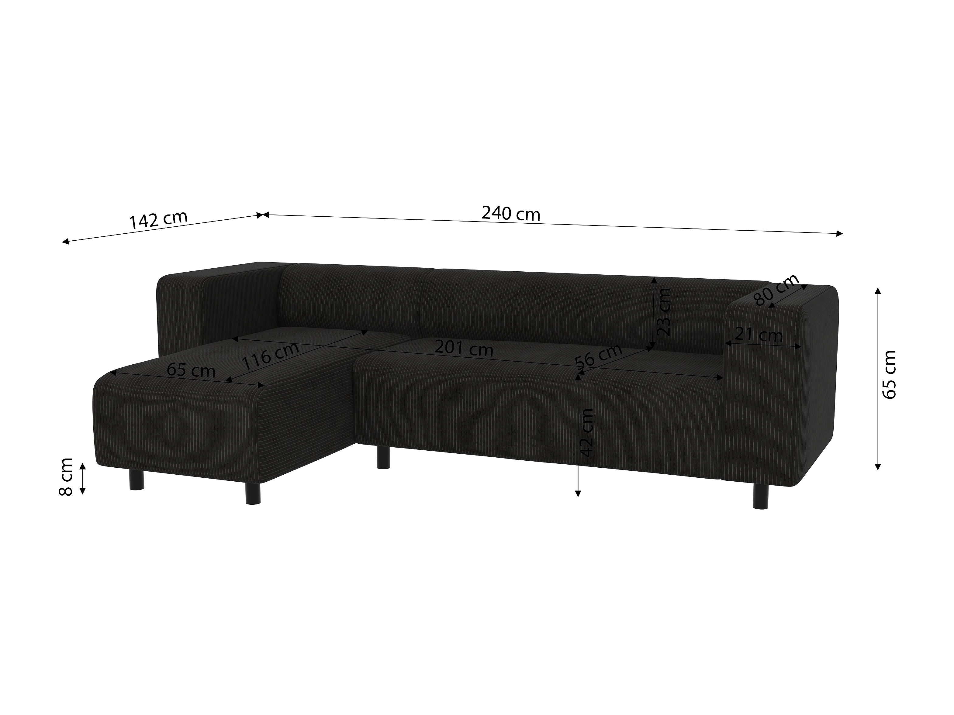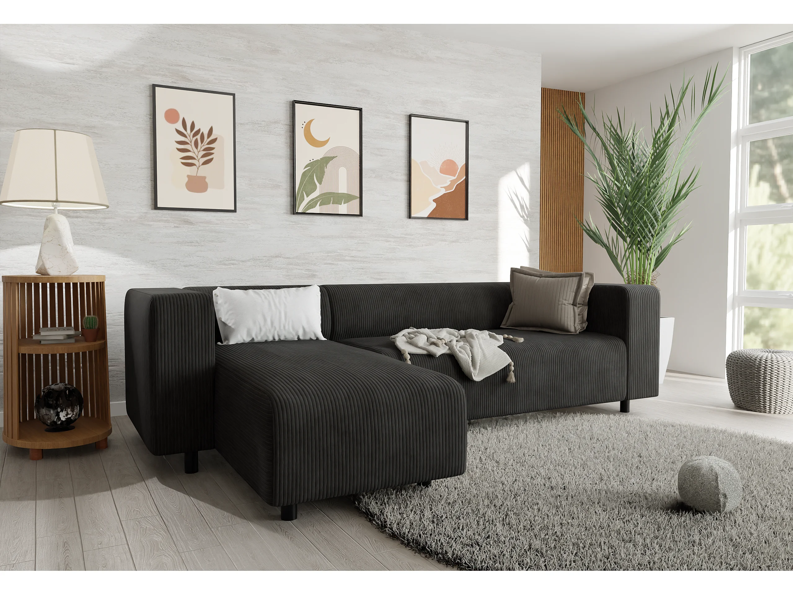 Canapé d’angle moderne avec ottomane en velours côtelé noir avec assise confortable THORA