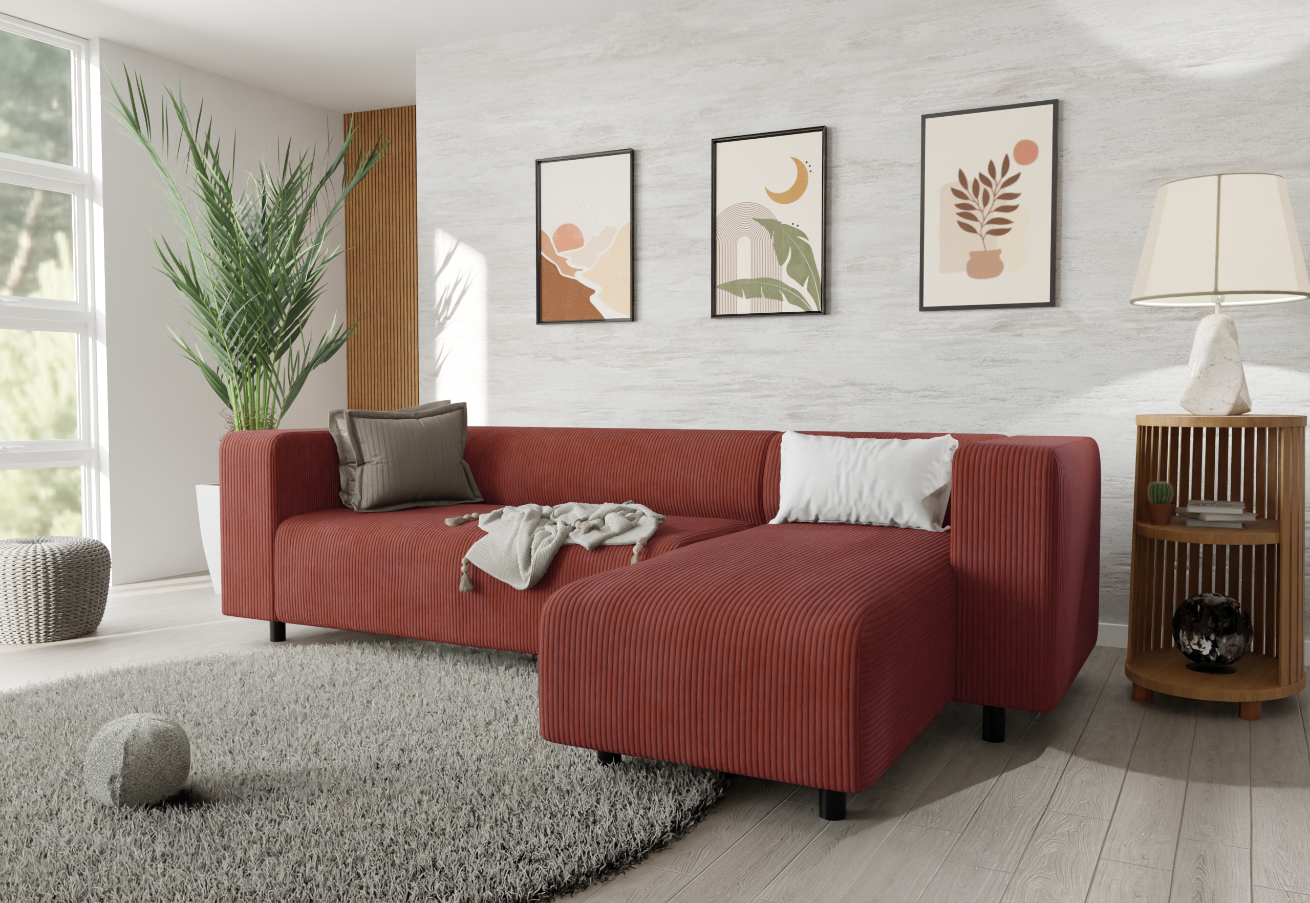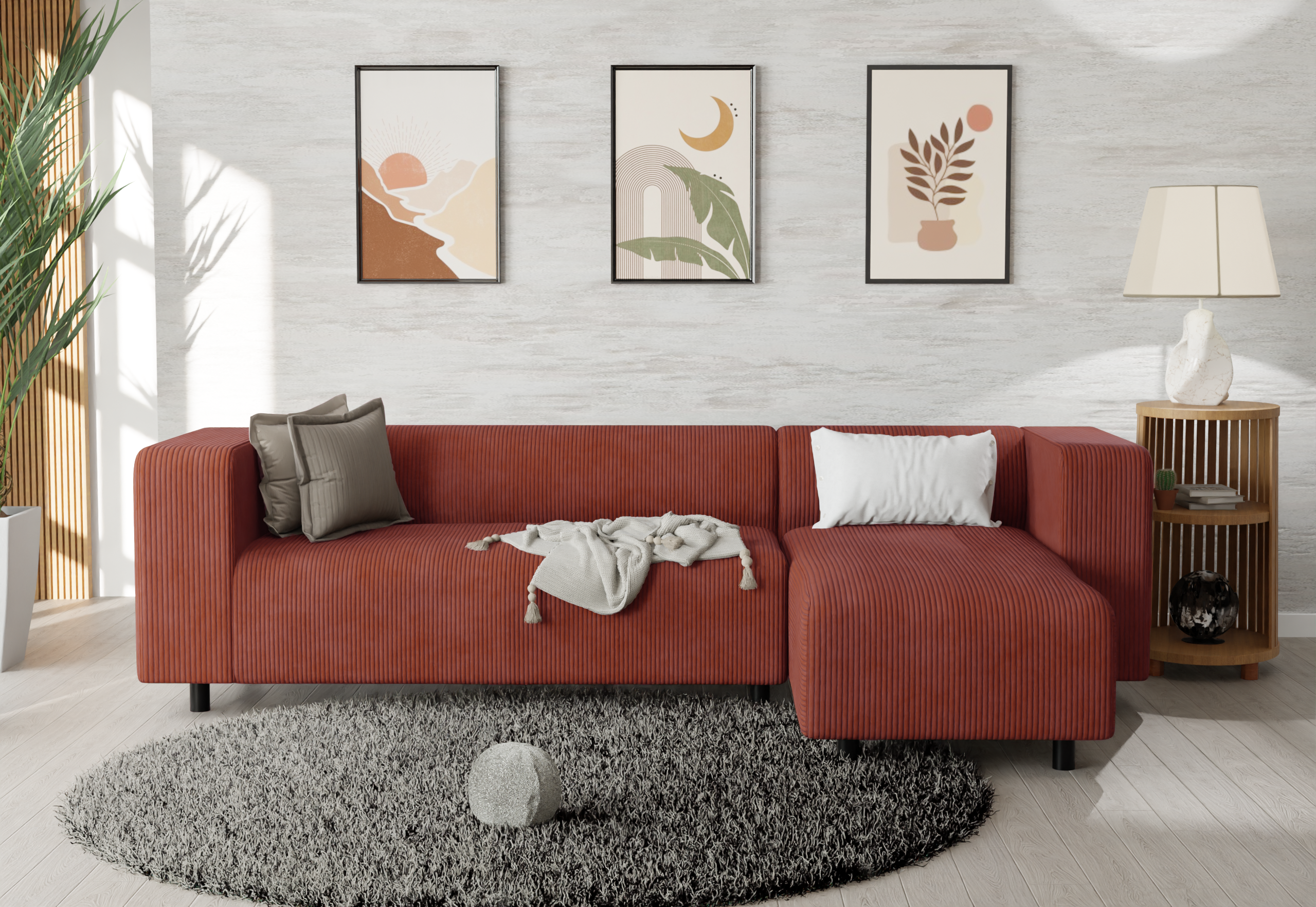 Canapé d’angle moderne avec ottomane en velours côtelé terracotta avec assise confortable THORA