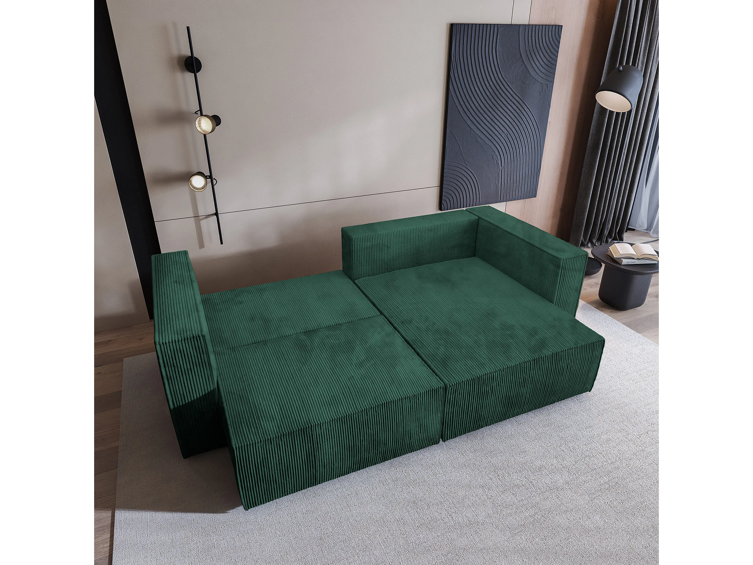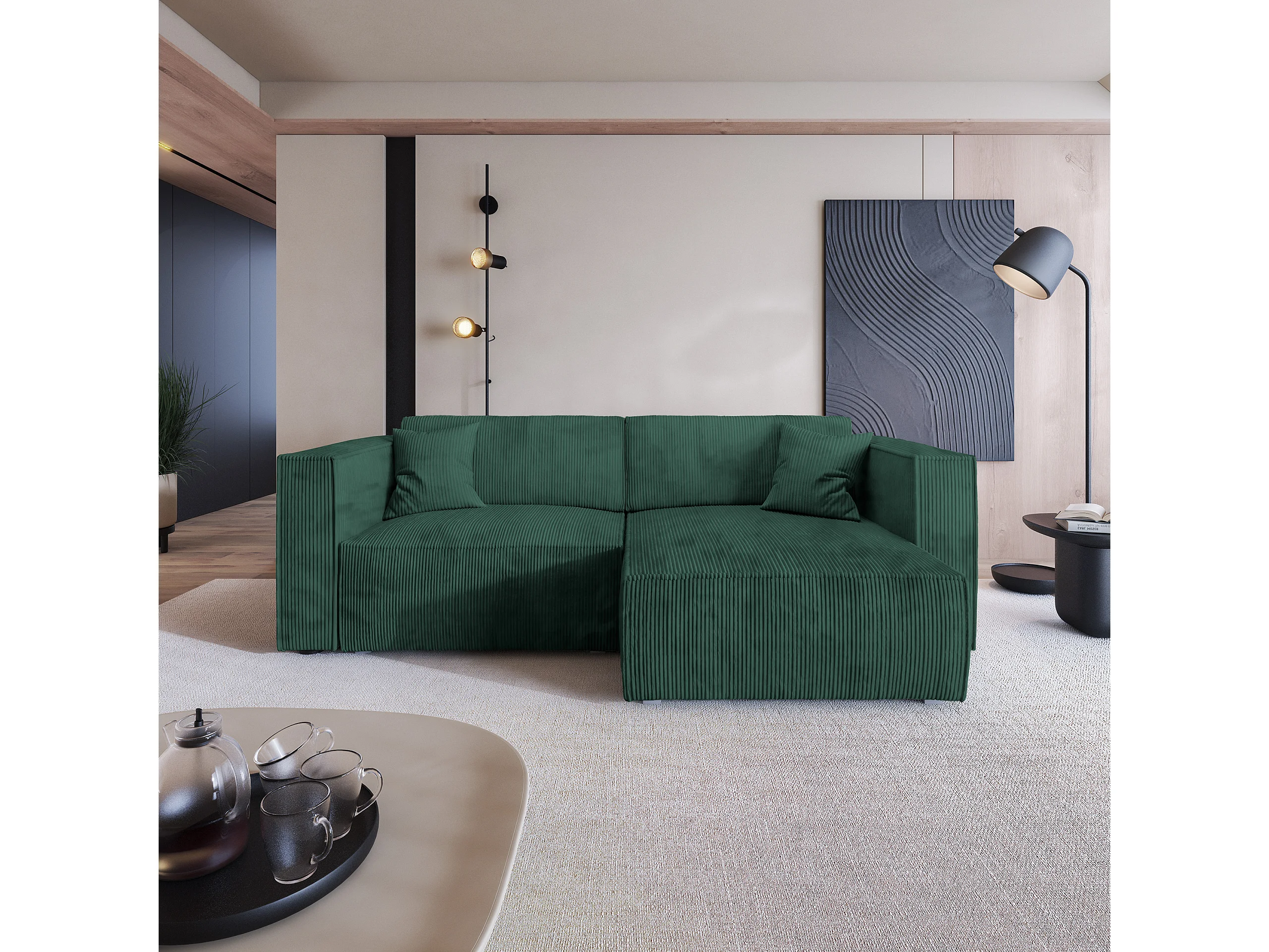 Canapé d'angle NERIO Vert Sapin en velours côtelé avec fonction de couchage