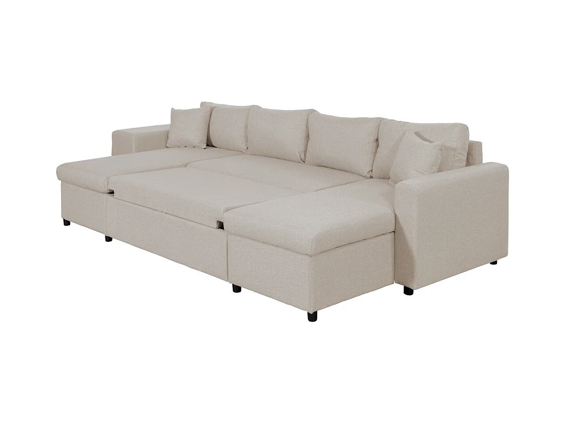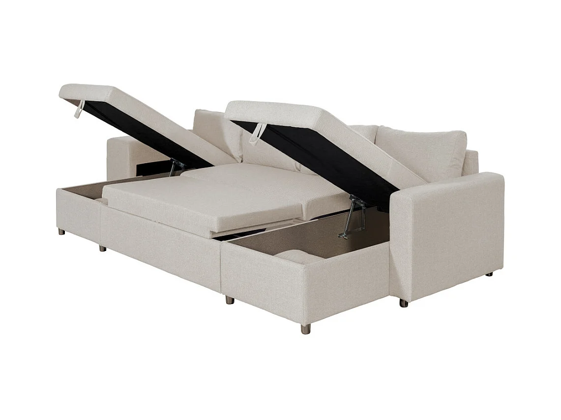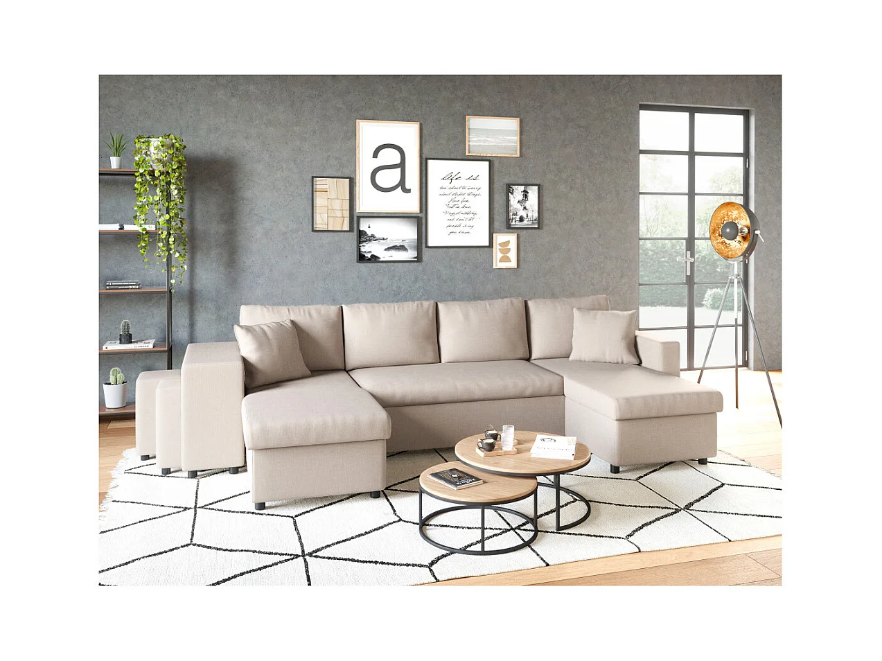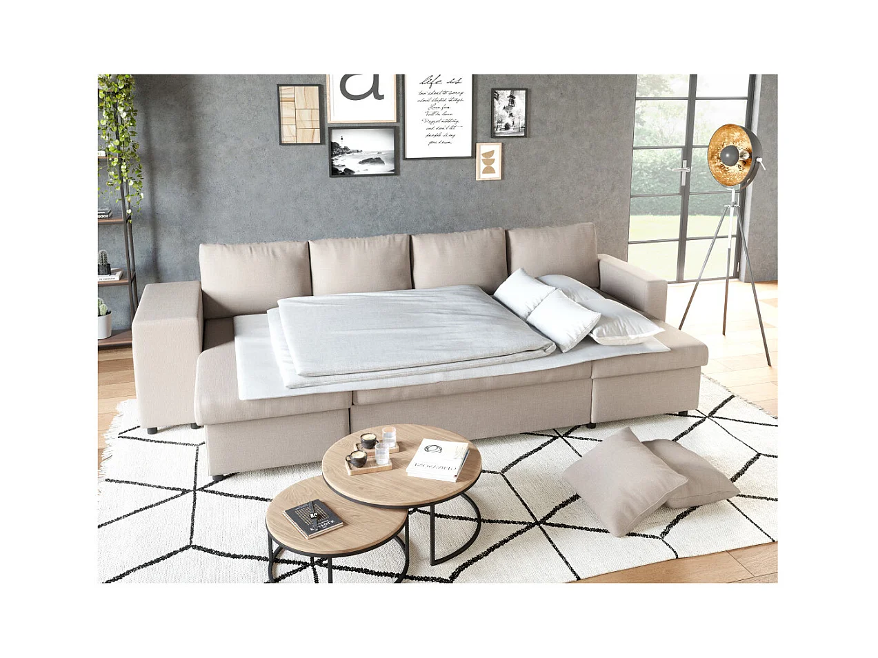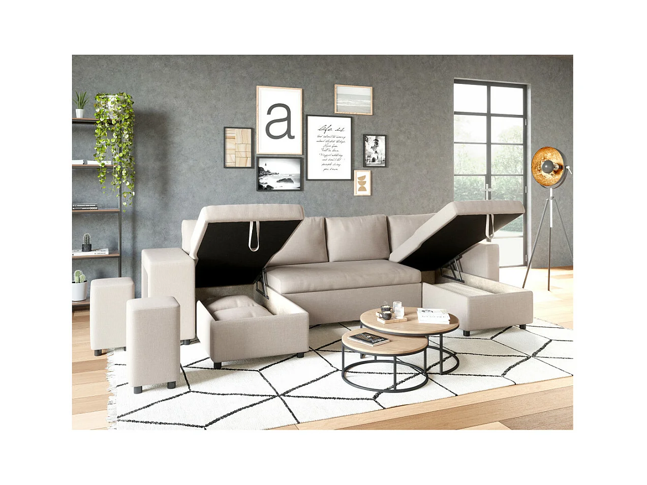 Canapé d'angle panoramique Oslo convertible avec coffres et poufs à gauche - Tissu - Beige - L311 x P146 x H81cm - Loungitude