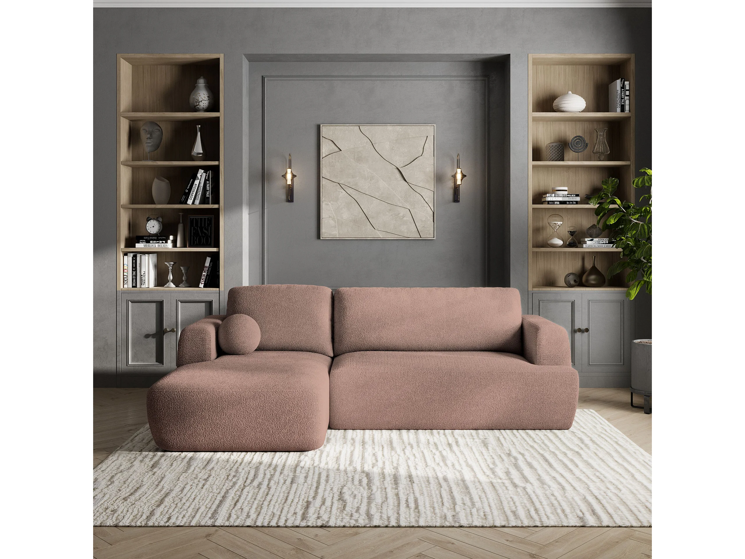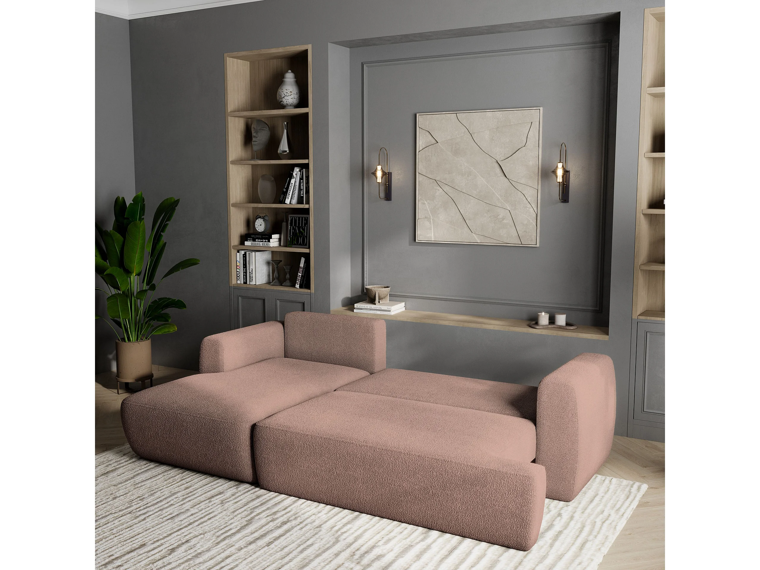 Canapé d'angle SENTI Rose poudré en bouclé avec fonction de couchage