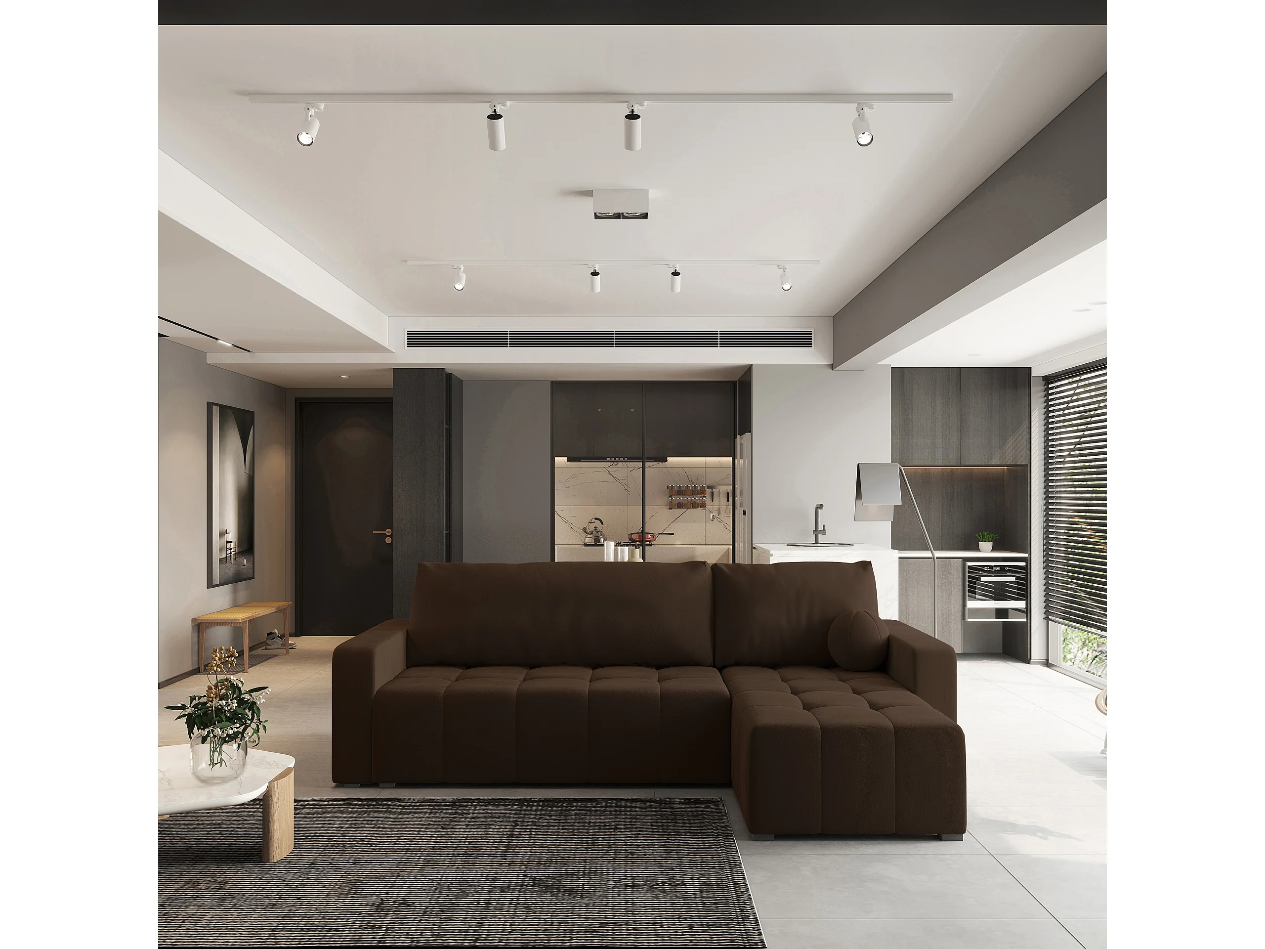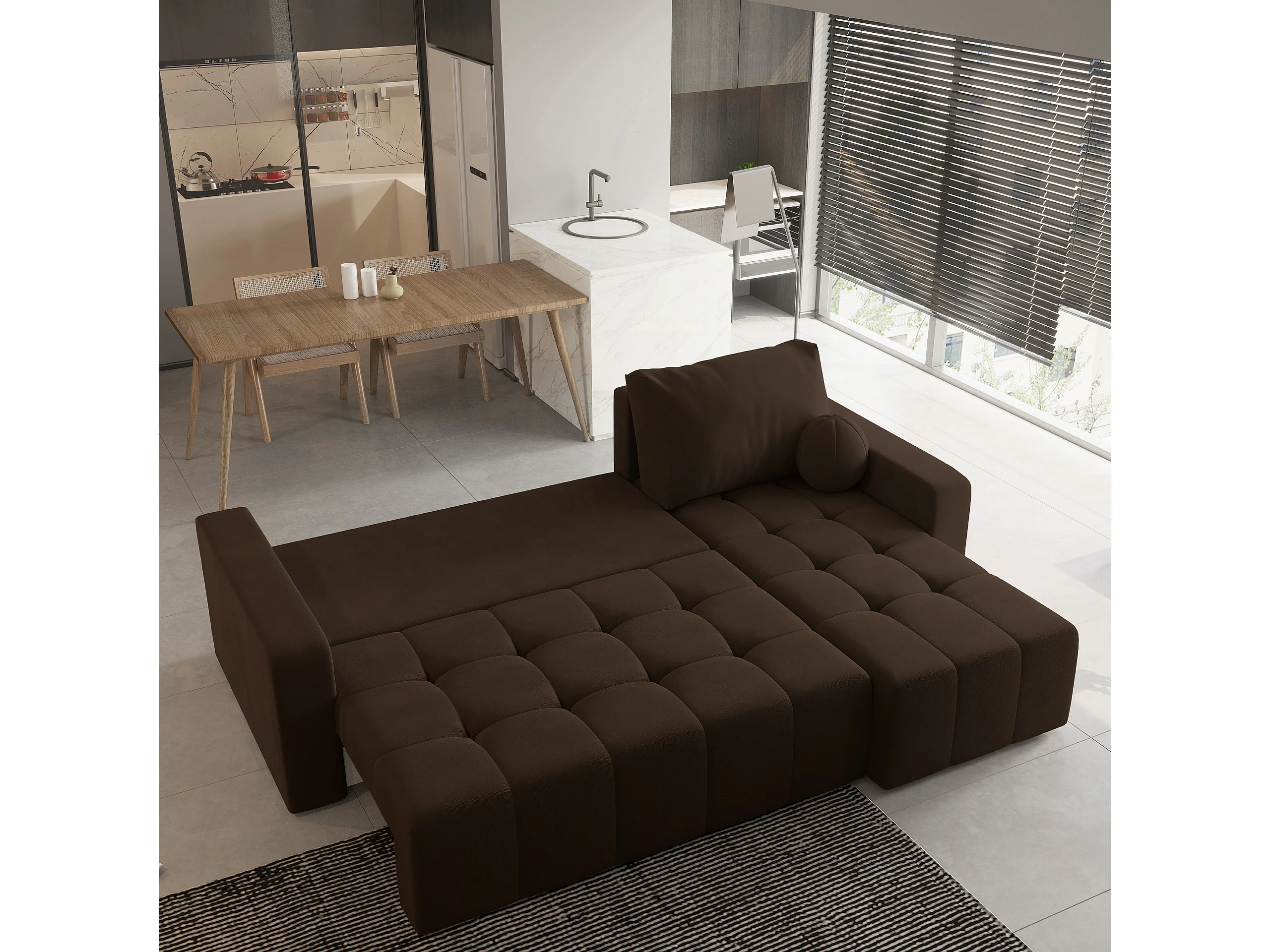 Canapé d'angle VOLIRA Marron en peluche avec fonction de couchage