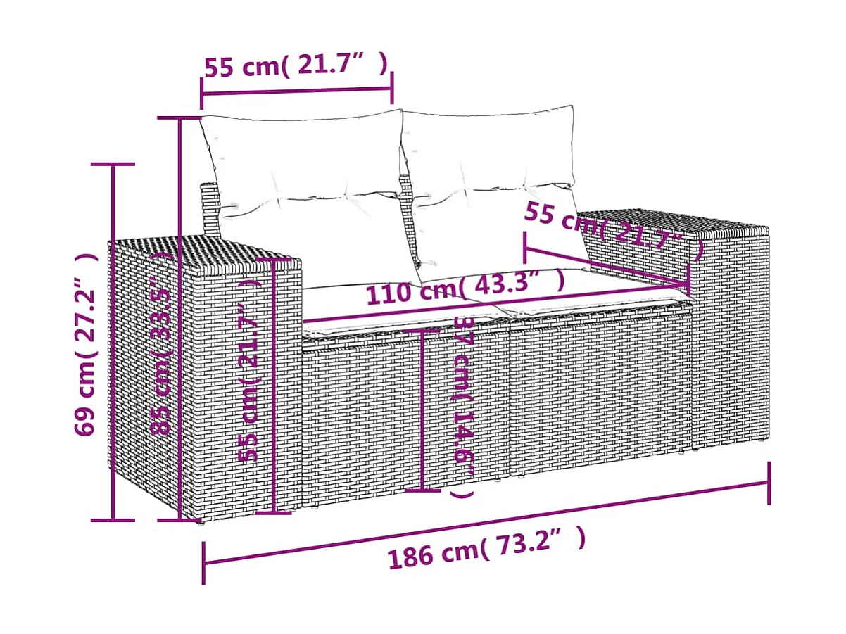 Canapé de jardin avec coussins 2 places noir résine tressée
