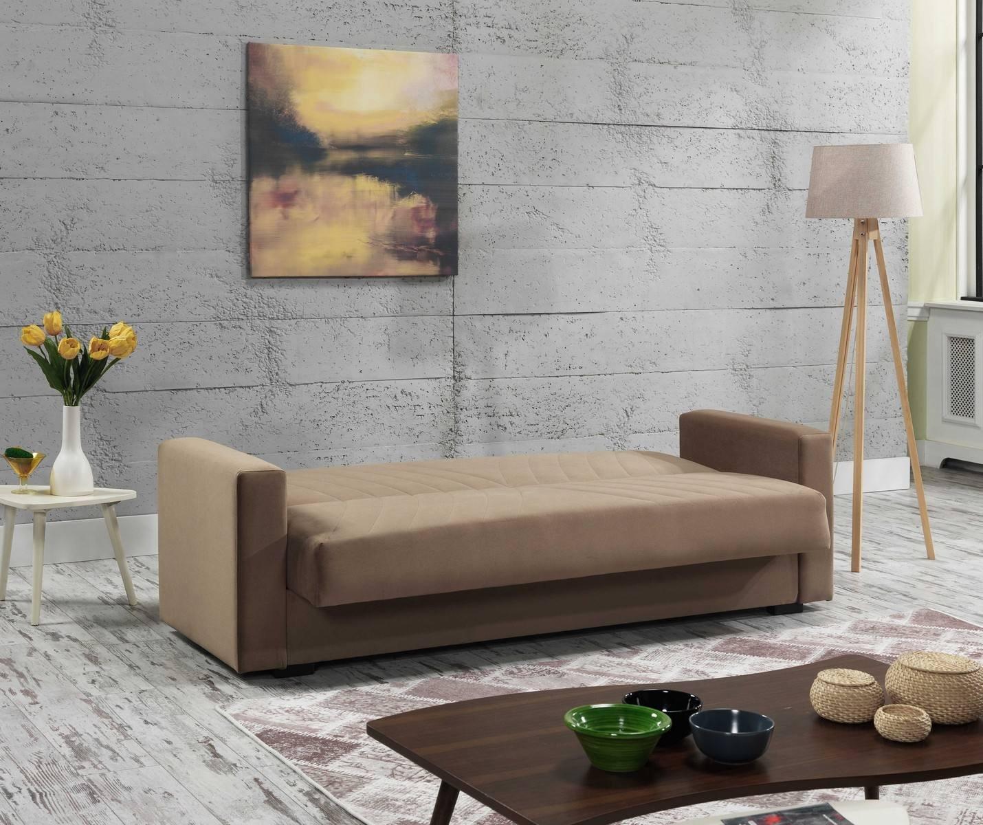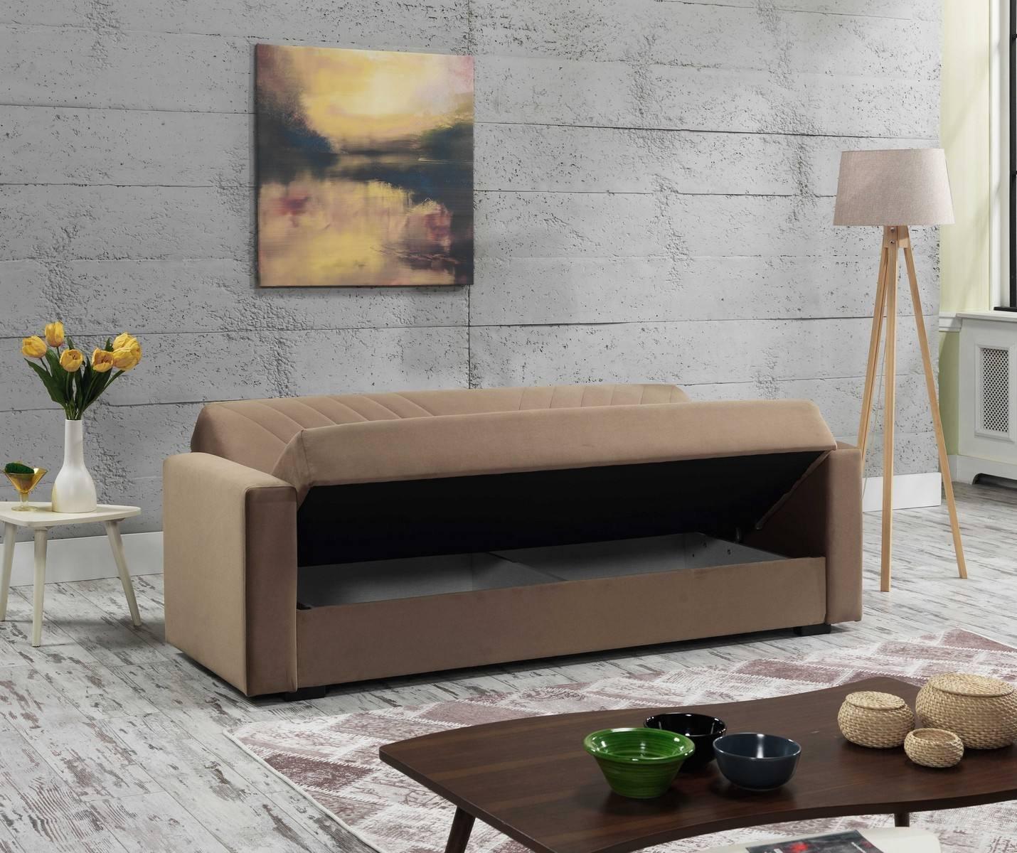 Canapé Dfossat, Canapé de rangement linéaire 3 places avec 2 coussins inclus, Canapé de salon en tissu rembourré avec ouverture clic-clac, 214x81h89 cm, Beige