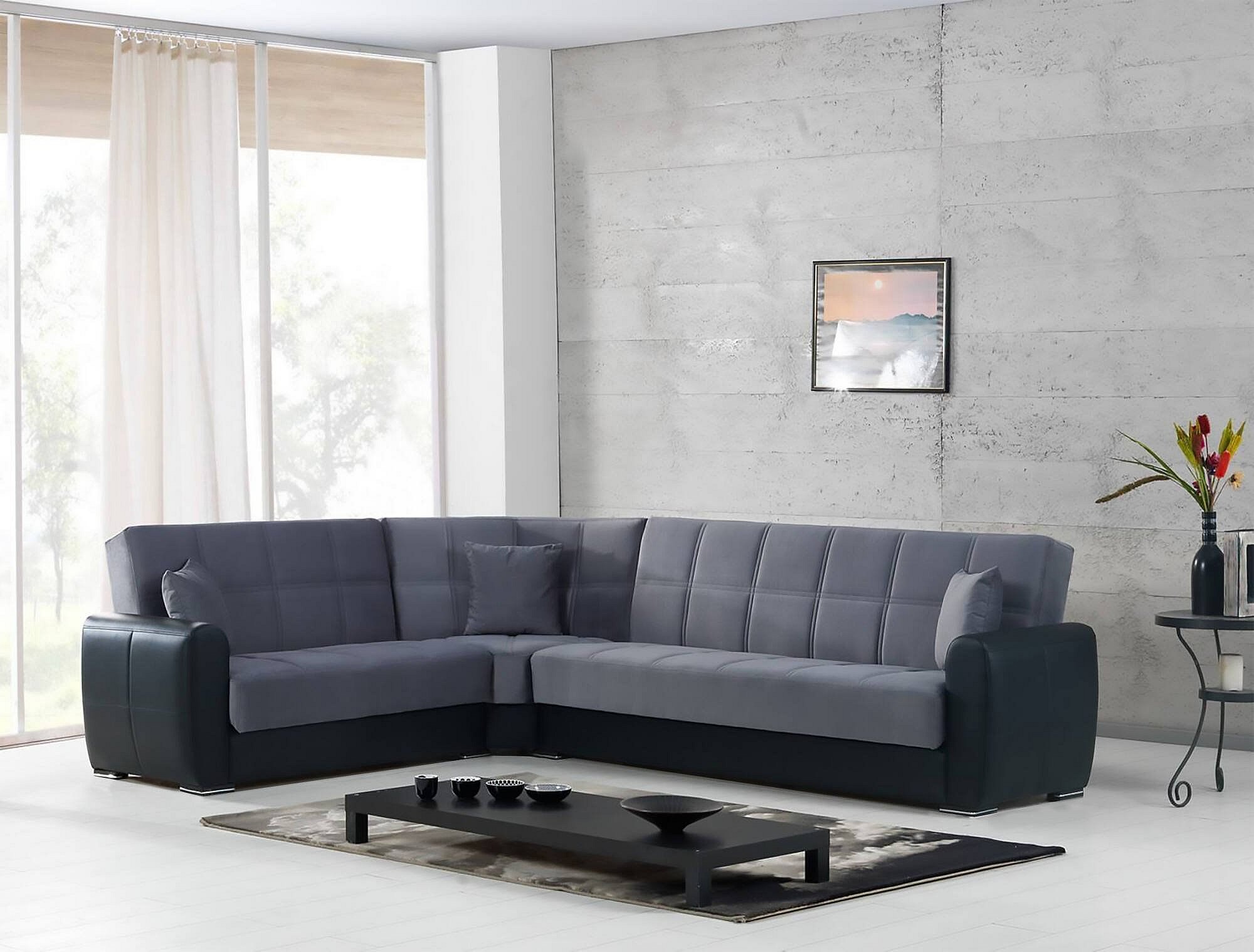 Canapé Dgytkjæ, Canapé d'angle conteneur en éco-cuir et tissu, Canapé de salon avec ouverture clic-clac et péninsule réversible, 305x238h91 cm, Noir et Gris