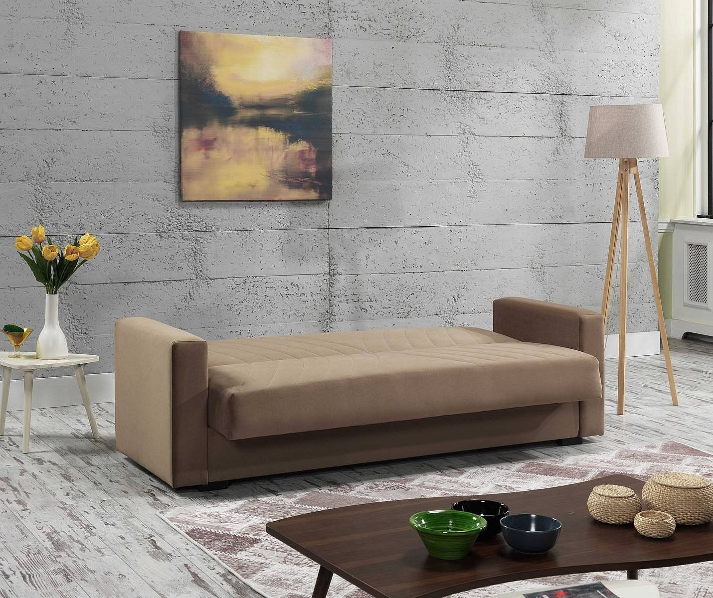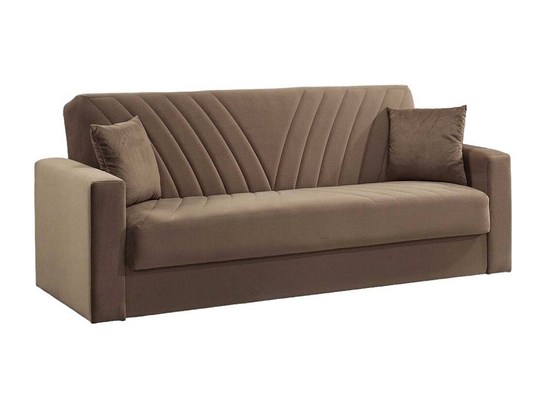 Canapé Jorge, Canapé de rangement linéaire 3 places avec 2 coussins inclus, Canapé de salon en tissu rembourré avec ouverture clic-clac, 214x81h89 cm, Beige