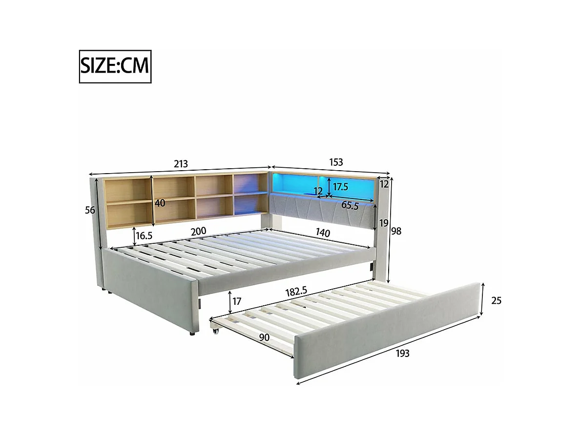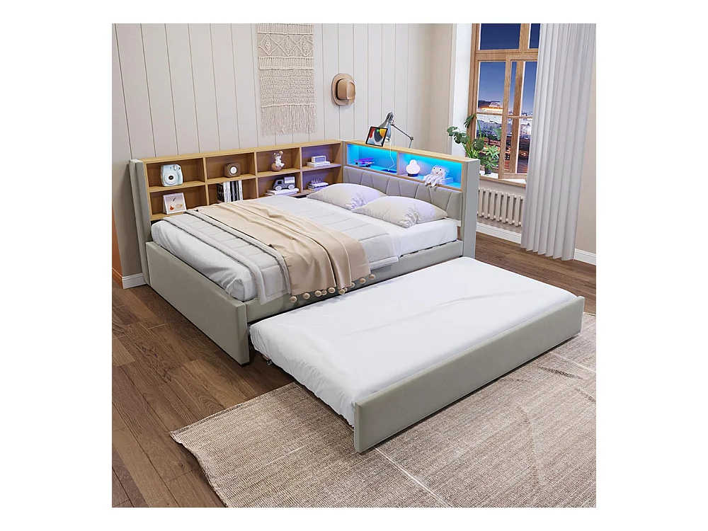 Canapé-lit 140*200, lit escamotable 90*190 avec éclairage LED, prises de courant et multiples compartiments de rangement, flanelle, gris clair