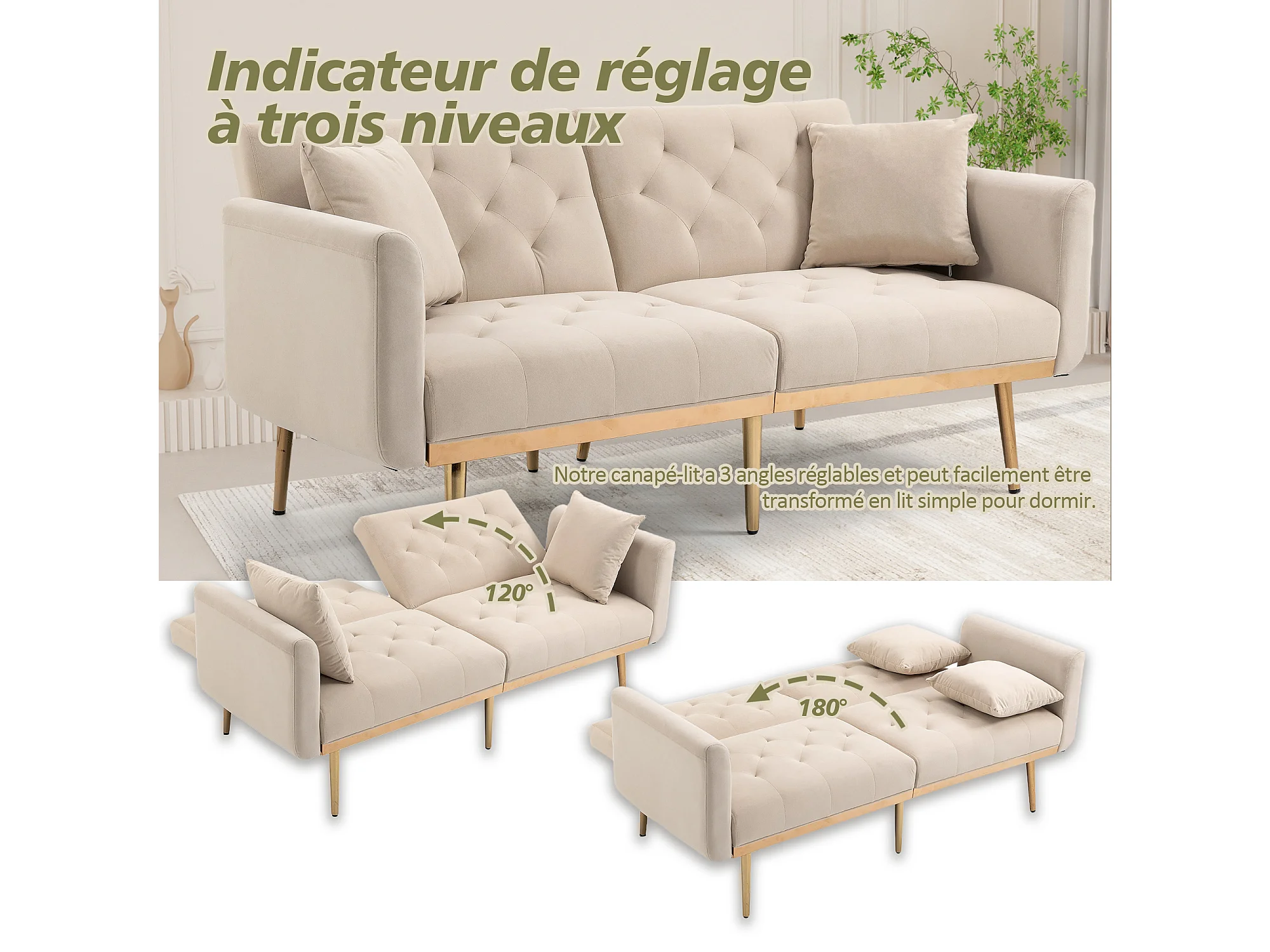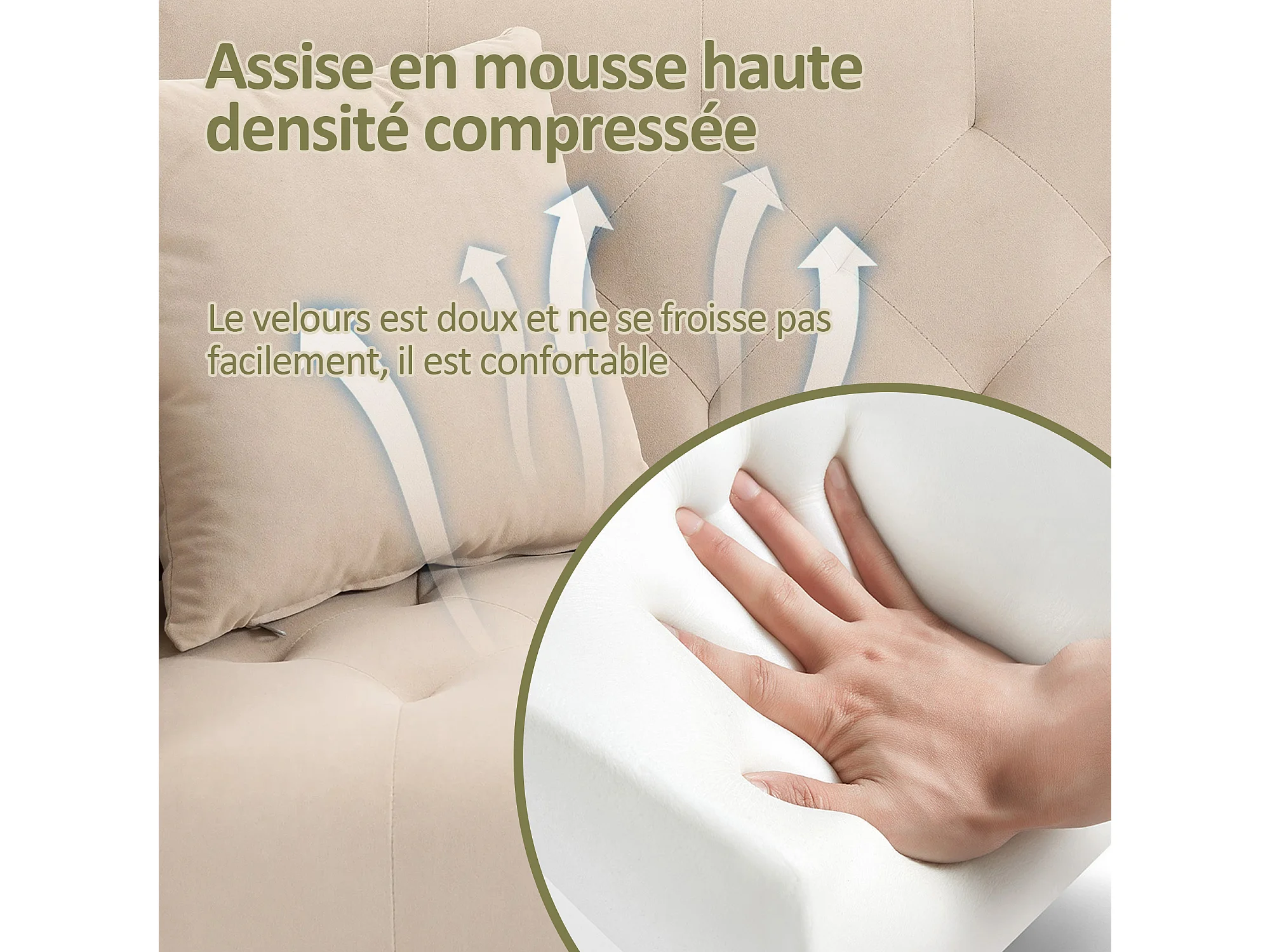 Canapé 2 Places en Tissu Velour Beige à Pieds Dorés - Design Luxe et Élégant – 2 Coussins Inclus