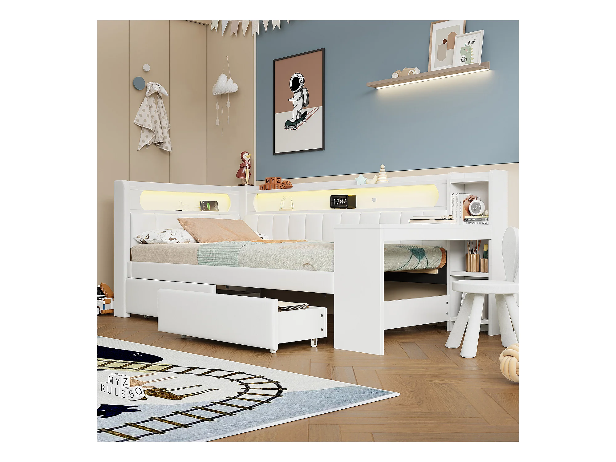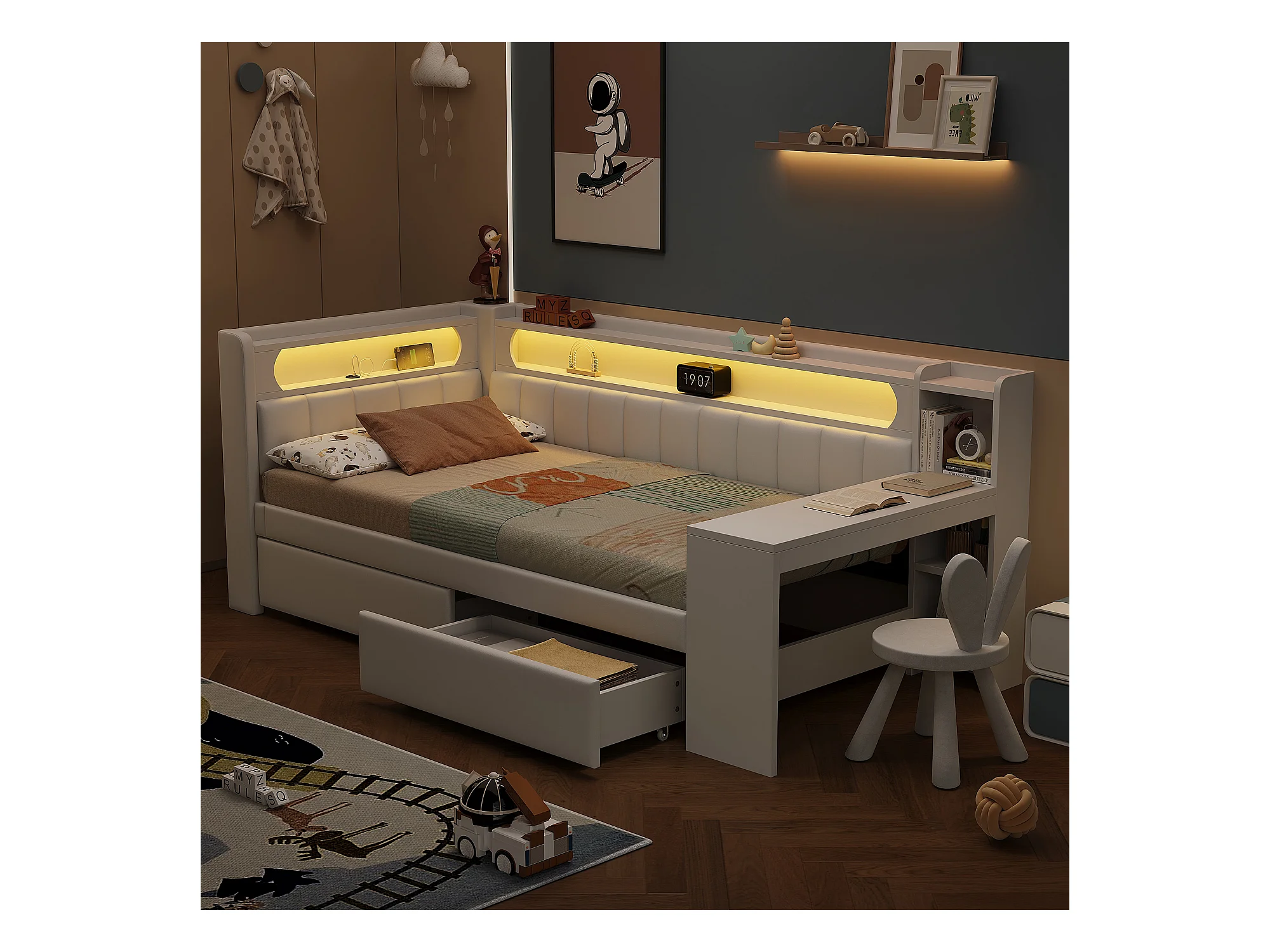Canapé-lit - 90 x 200 cm - avec Leds + lit gigogne + bureau + 2 tirois - MDF + lin - blanc