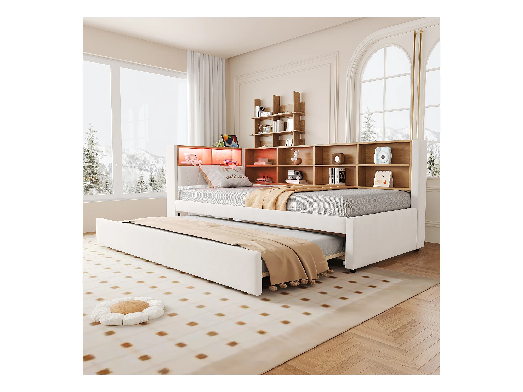 Canapé-lit 90 x 200 cm avec lit gigogne 90 x 190 cm - avec Leds + prises + étagère de rangement - Flanelle - beige