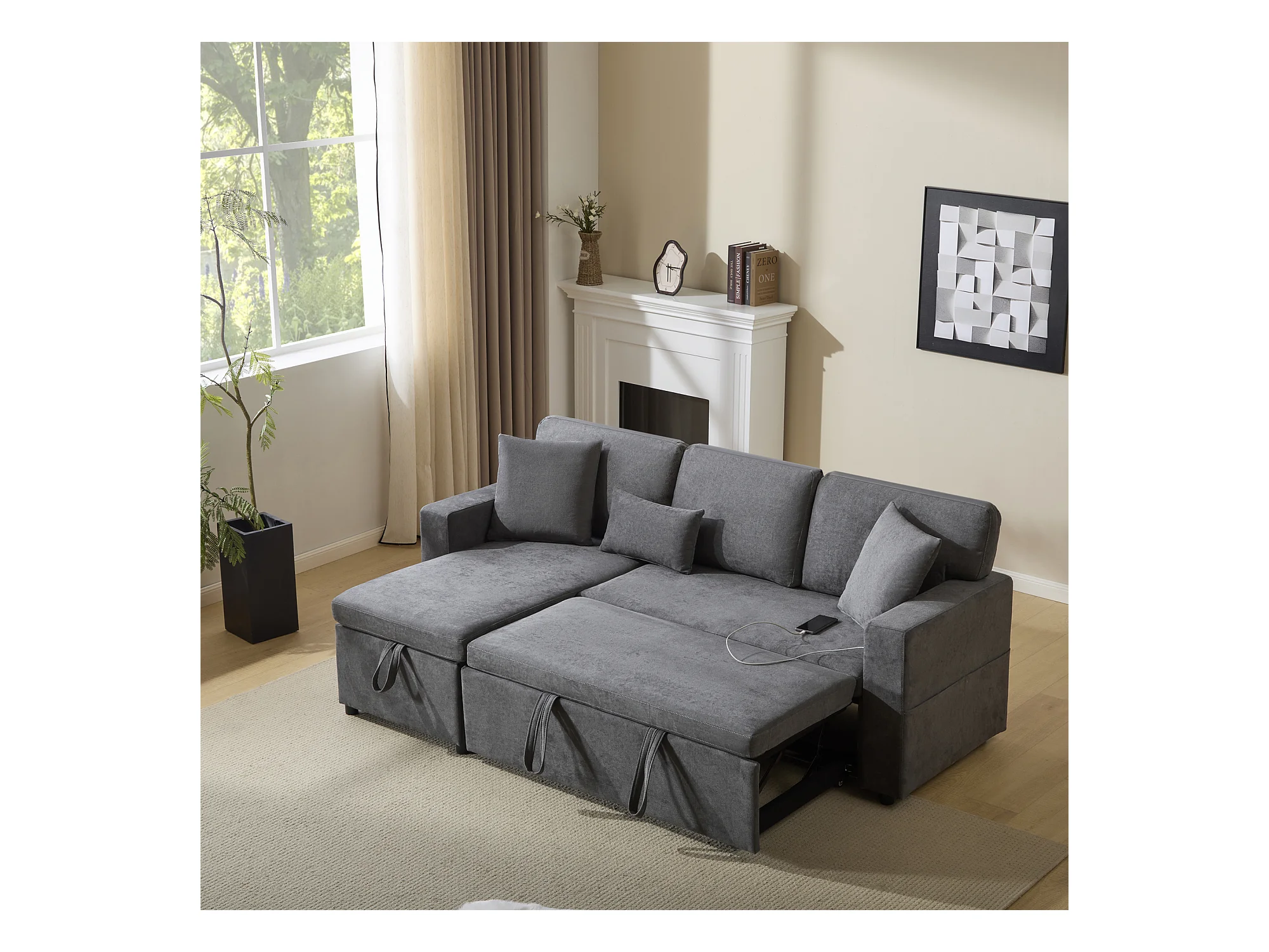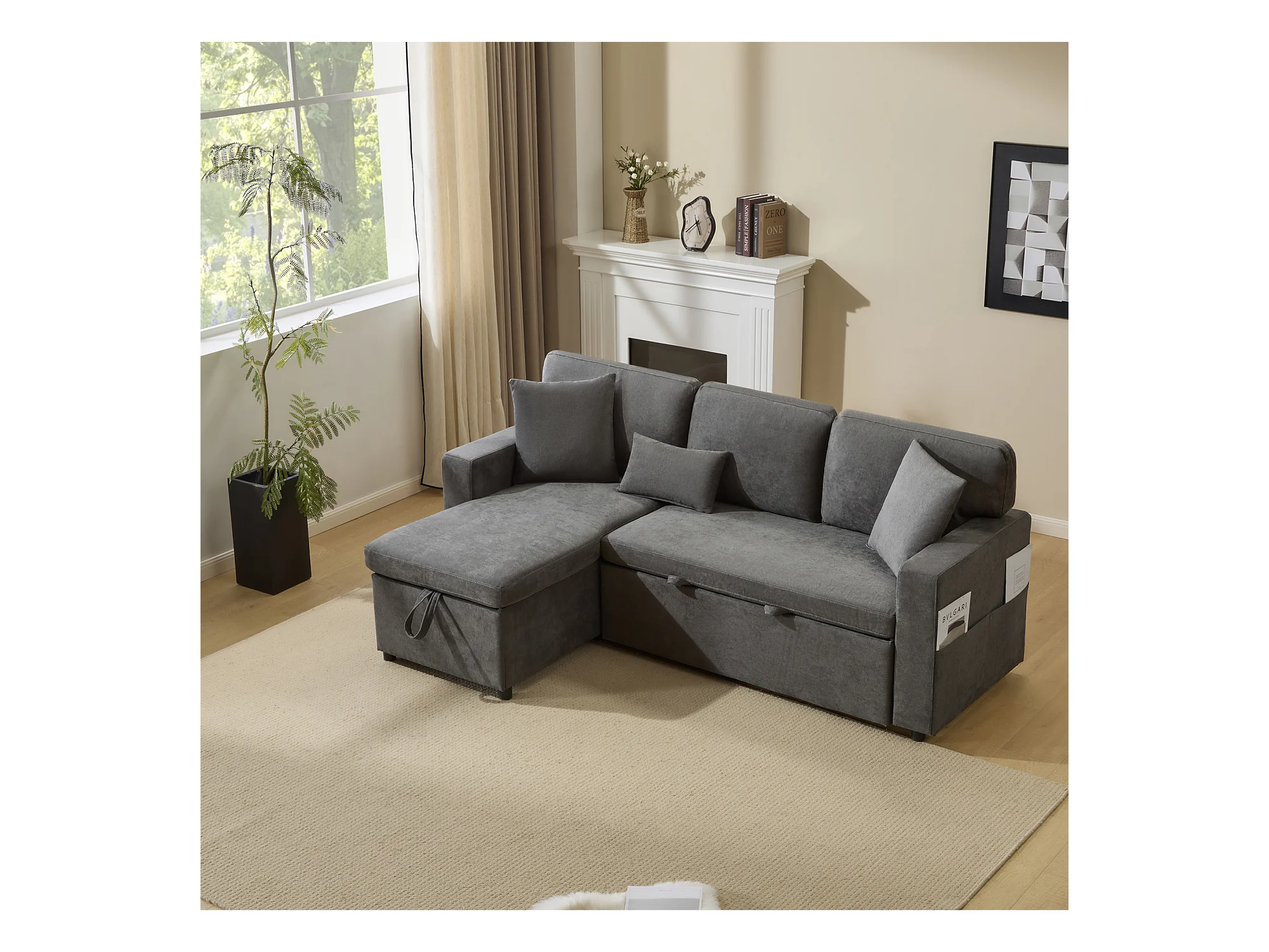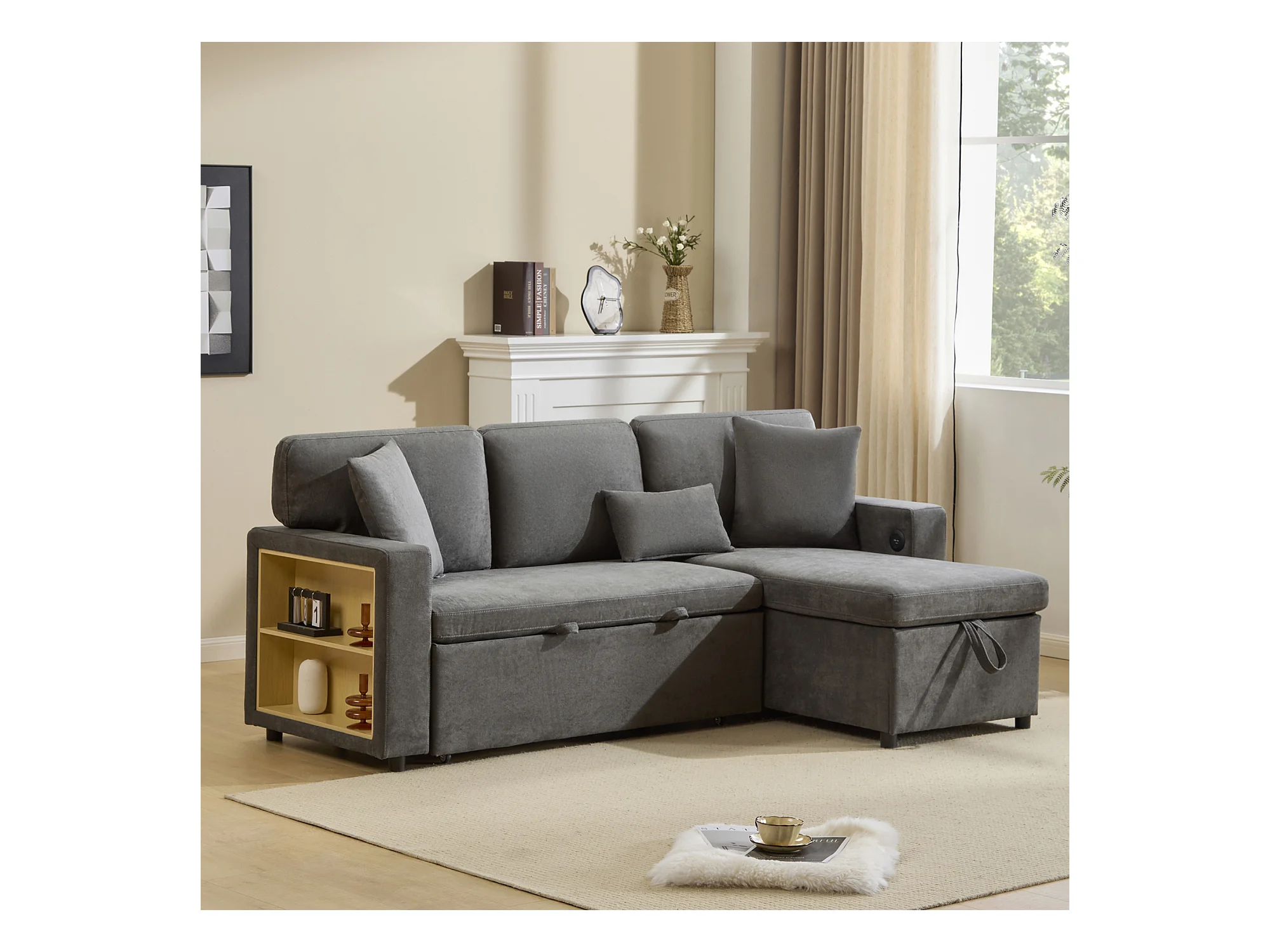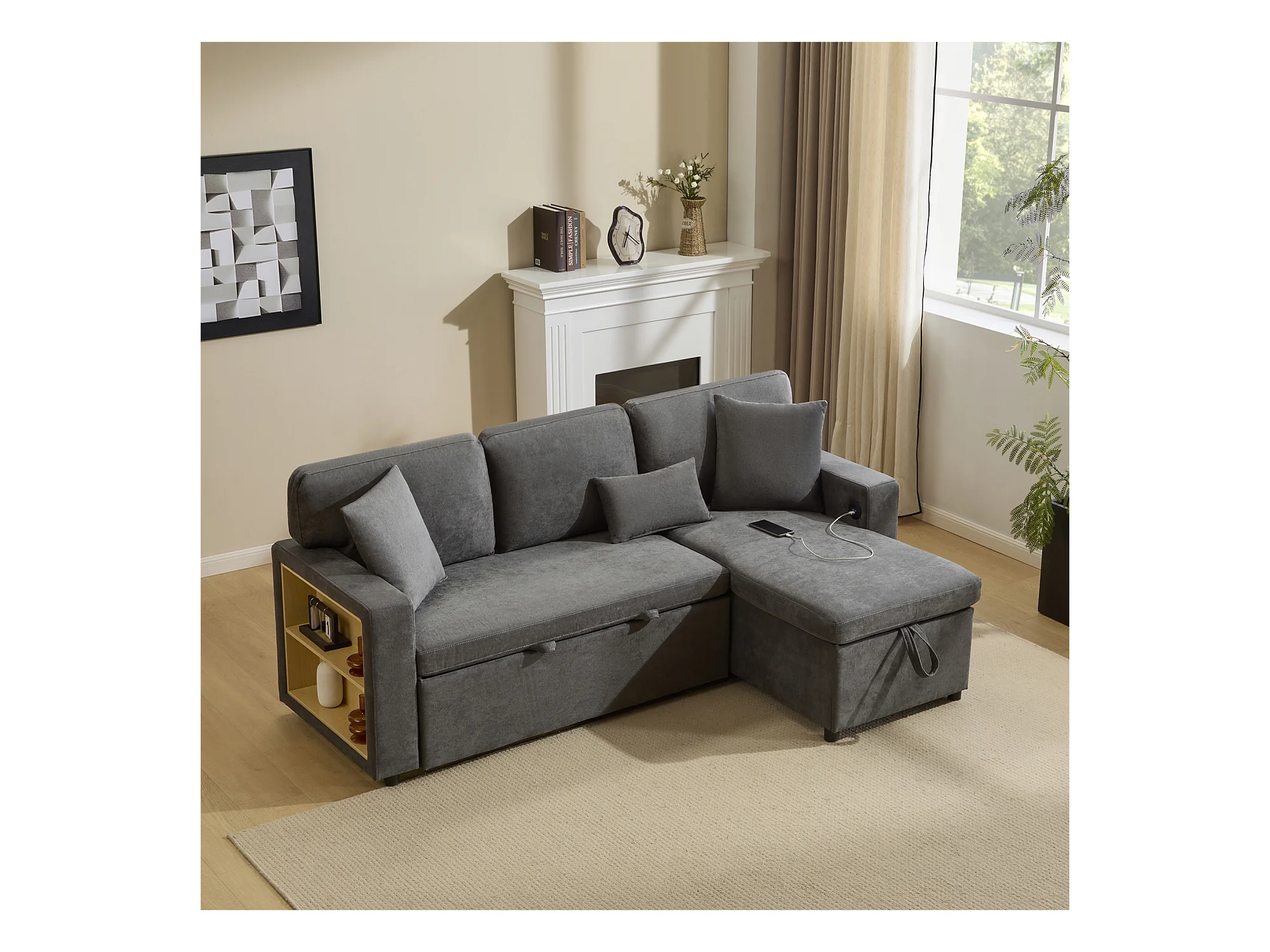 Canapé-lit d'angle extensible - 90 x 180 cm - avec rangement et étagère intégrée - Tissu Oxford - gris