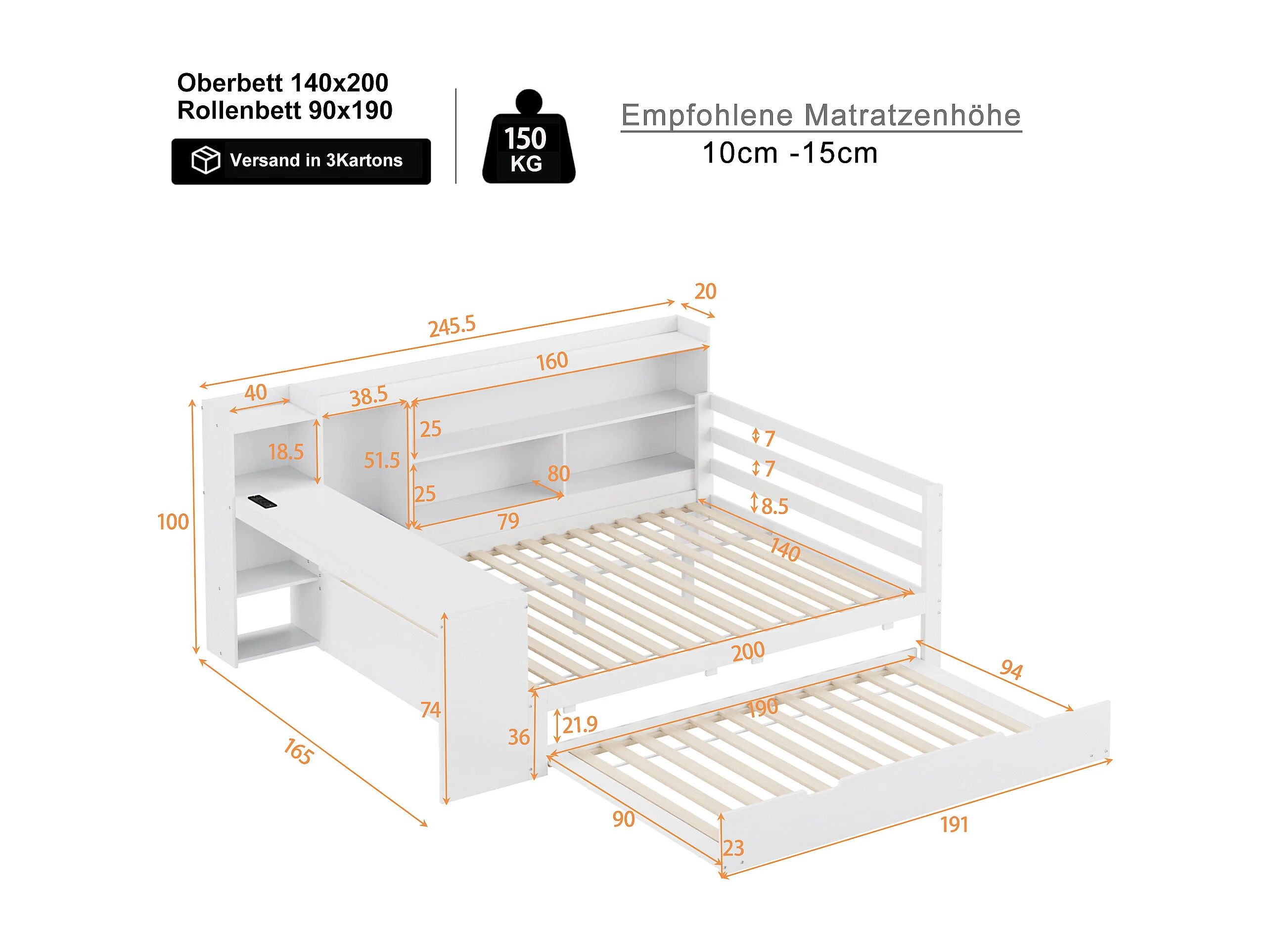 Canapé-lit en bois massif 140x200, avec bureau, étagères et lit gigogne, prises USB, lit double multifonction, blanc