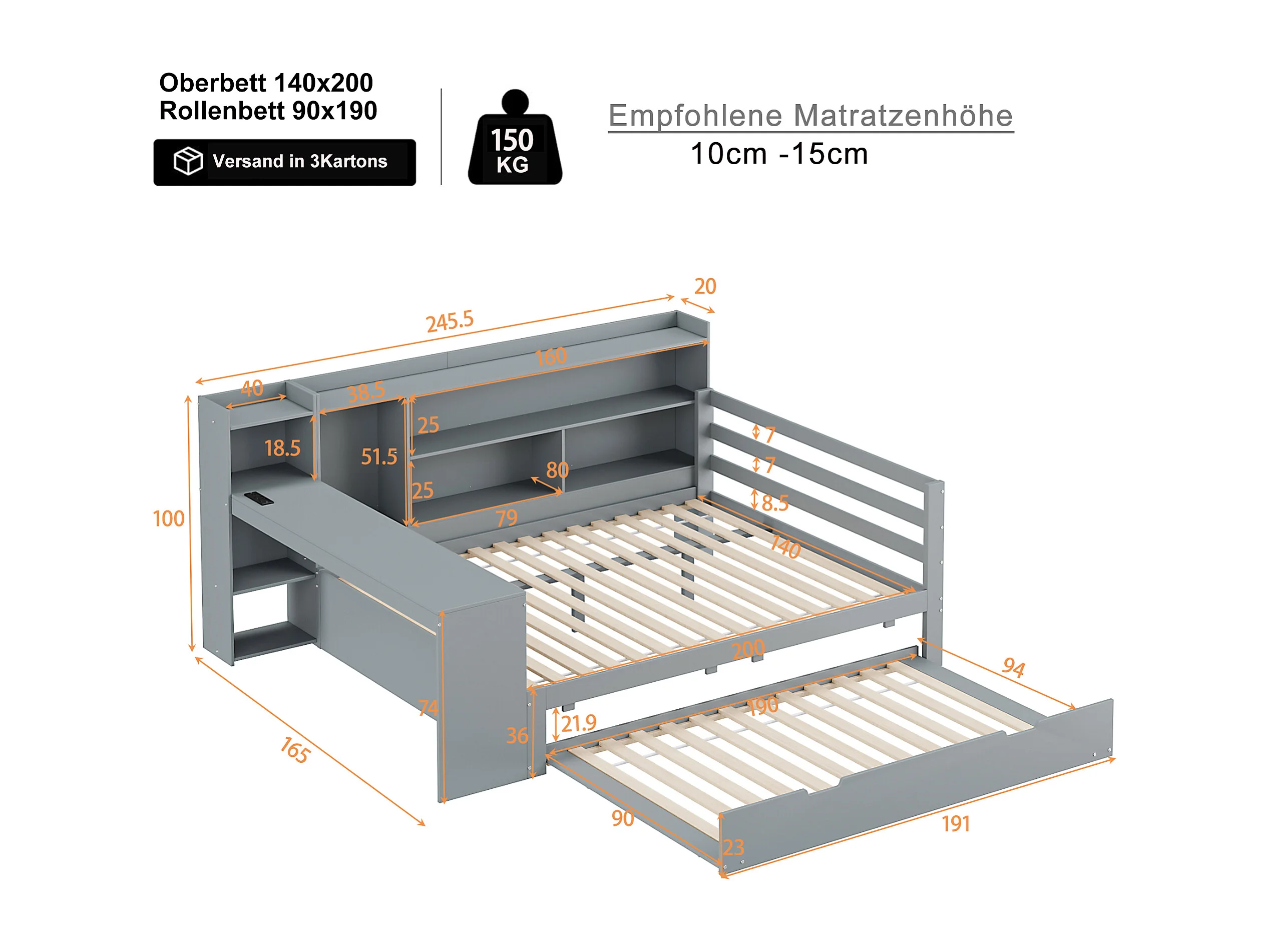Canapé-lit en bois massif 140x200, avec bureau, étagères et lit gigogne, prises USB, lit double multifonction, gris