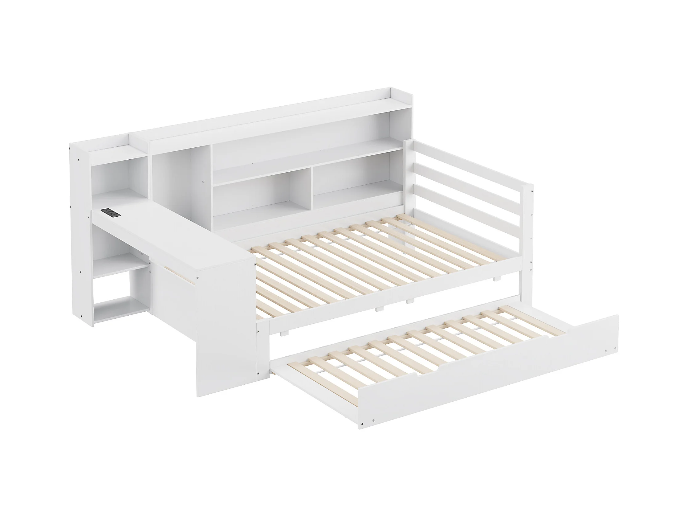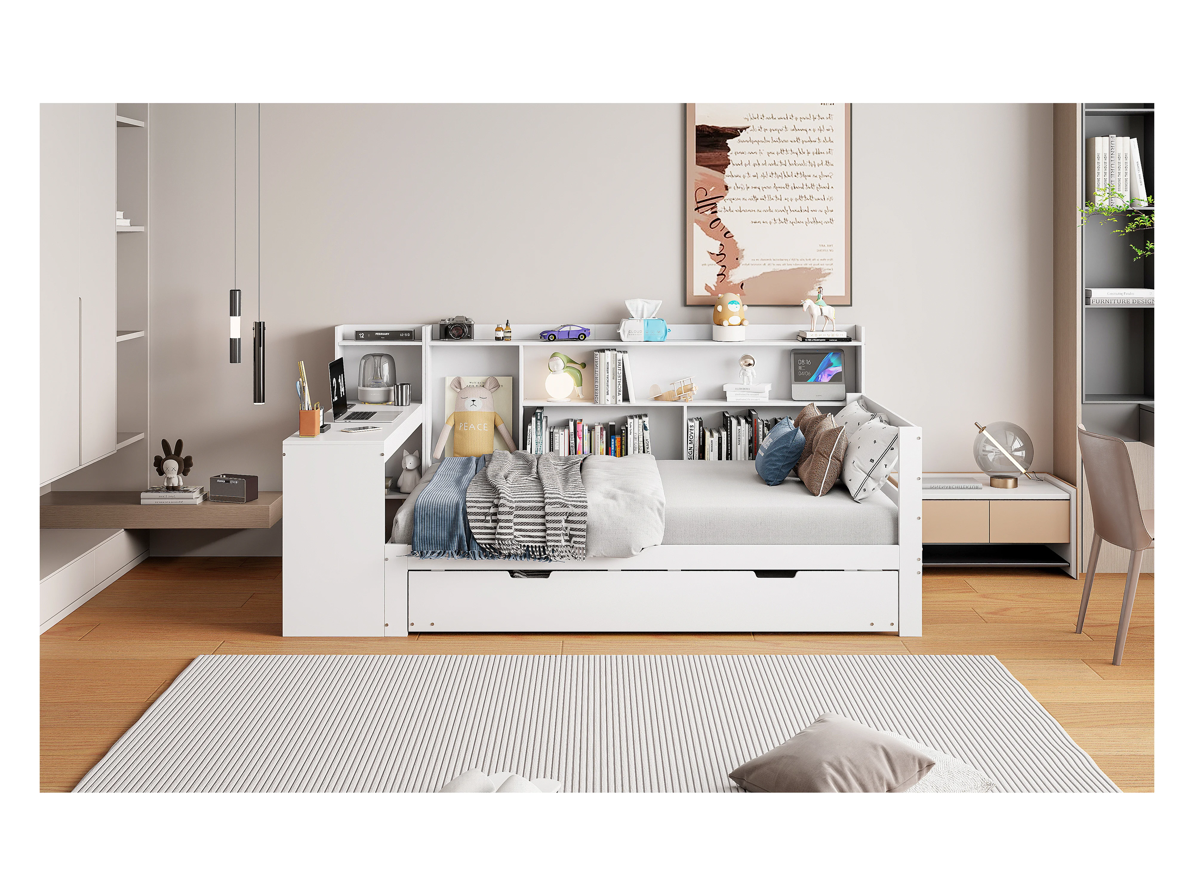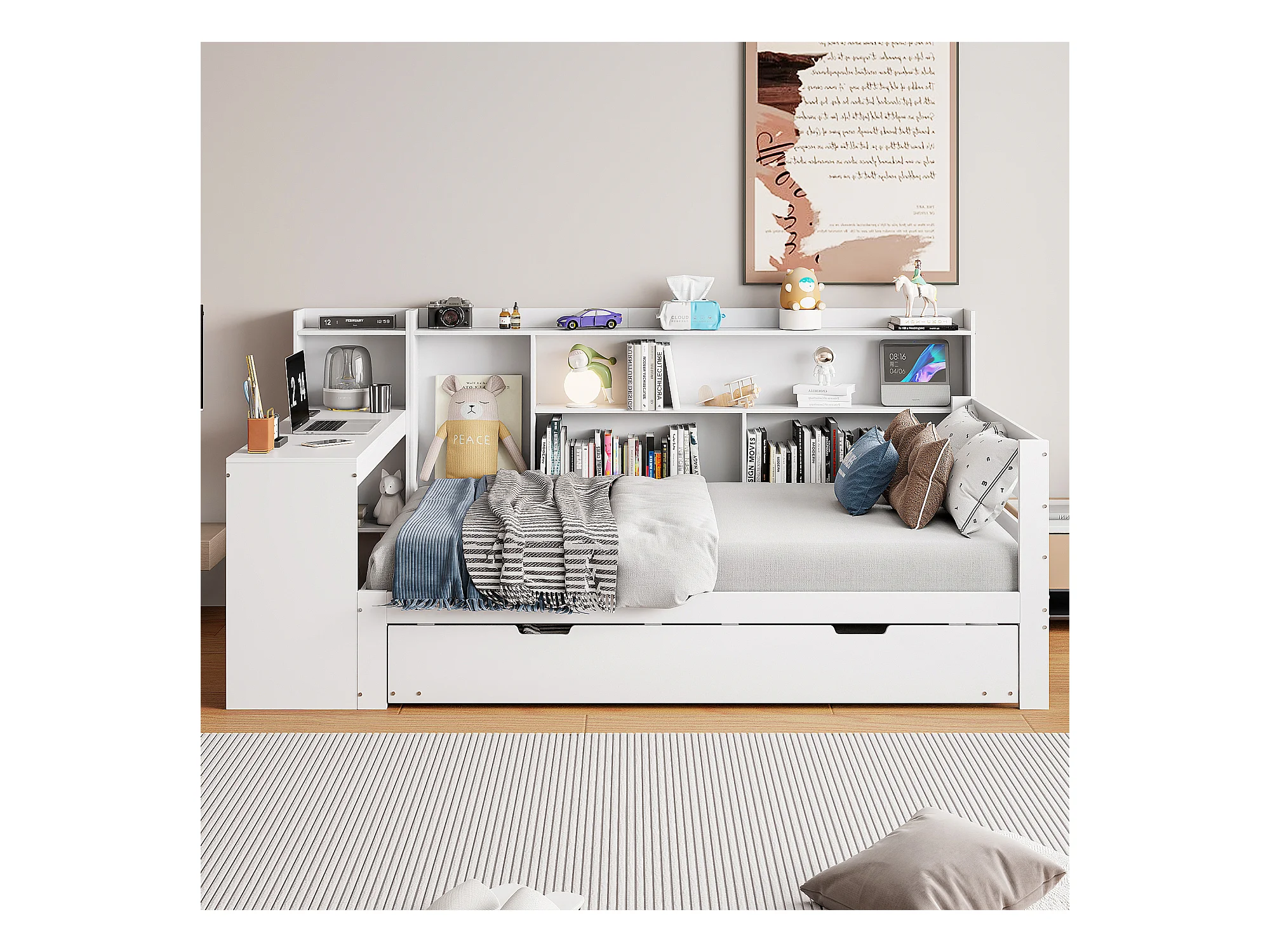 Canapé-lit en bois massif 90x200, avec bureau, étagères, prises USB et lit escamotable sous le canapé, multifonction, Gris (245.5x165x100 cm)