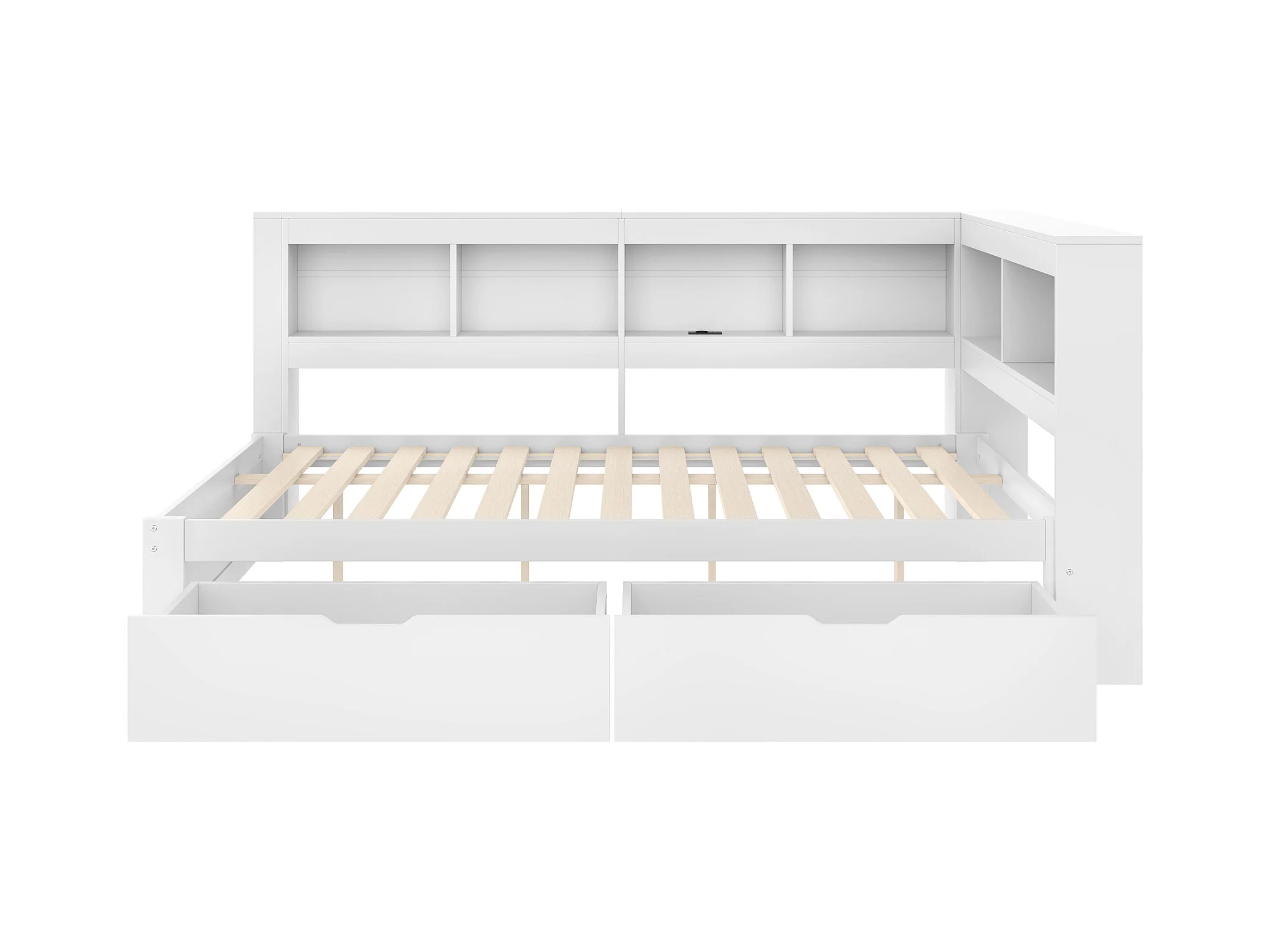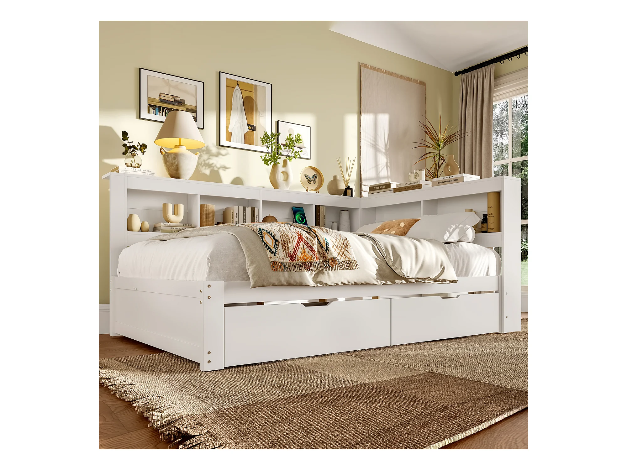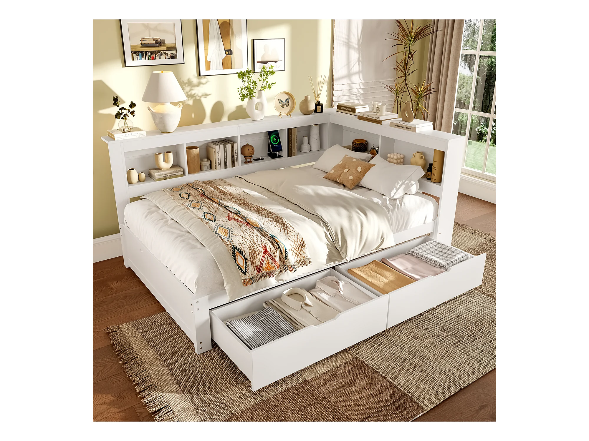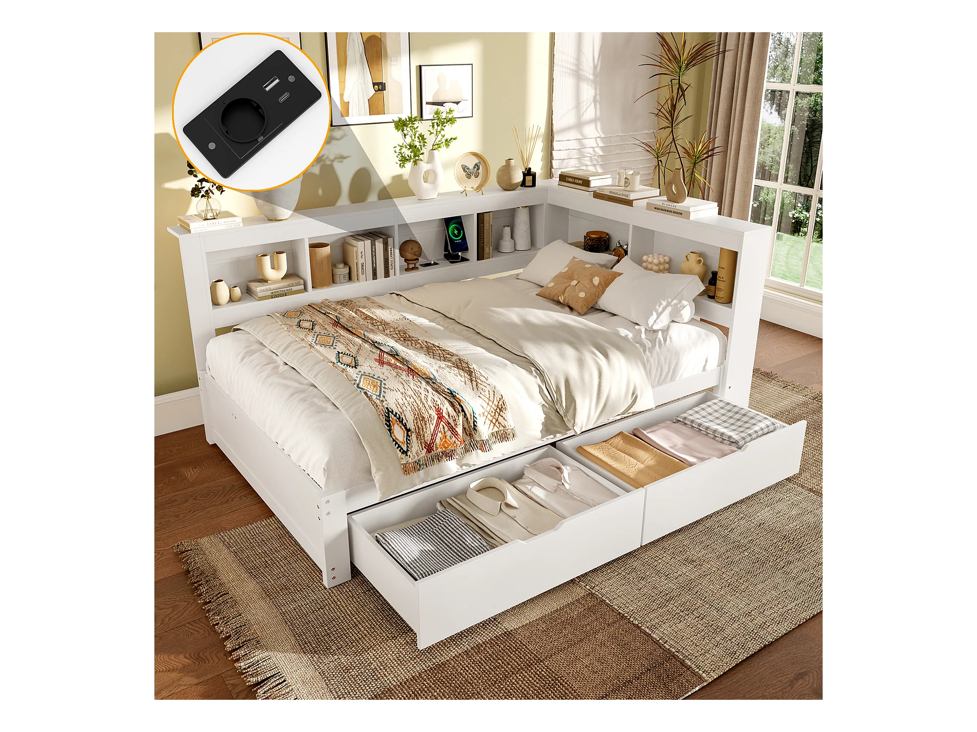 Canapé-lit enfant - 140 x 200 cm - avec 2 tiroirs + 2 USB + étagère de rangement - aggloméré - blanc