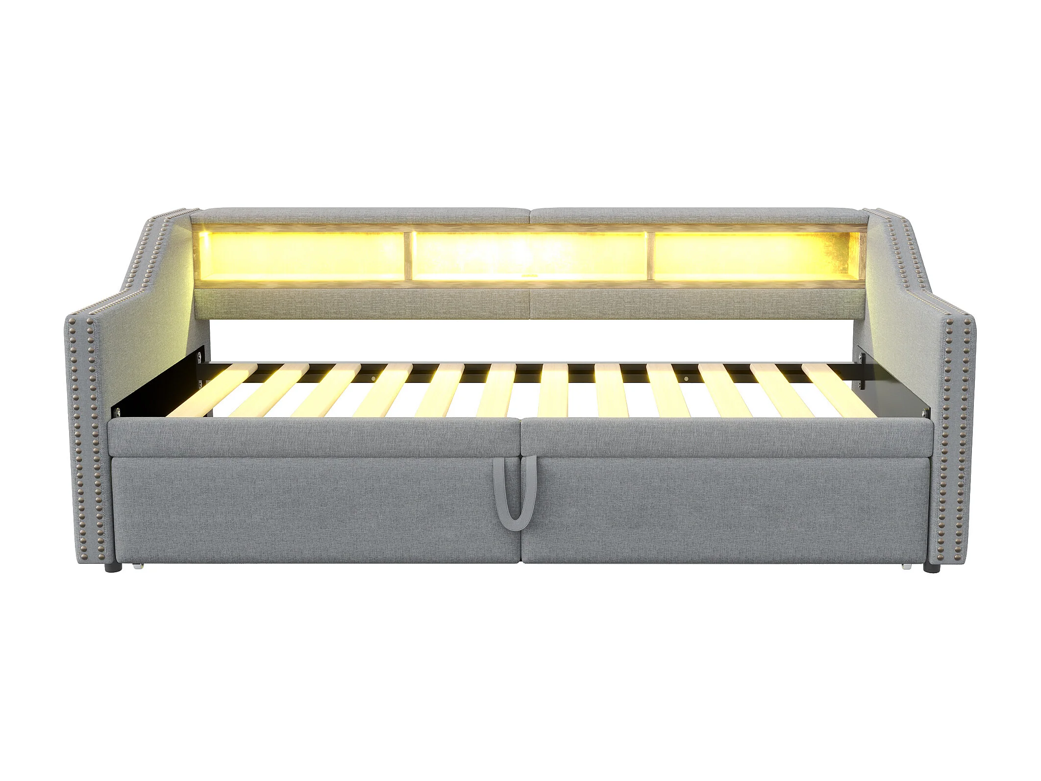 Canapé-lit extensible 90/180 x 200 cm, lumière LED et prise USB, avec sommier à lattes, gris clair