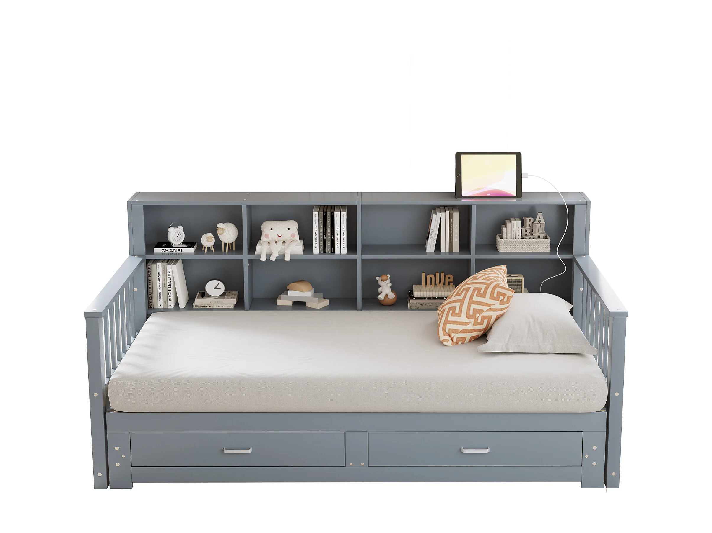 Canapé-lit extensible en bois massif 90/180x190, avec prise USB latérale, 2 tiroirs, sommier, lit multifonction, gris