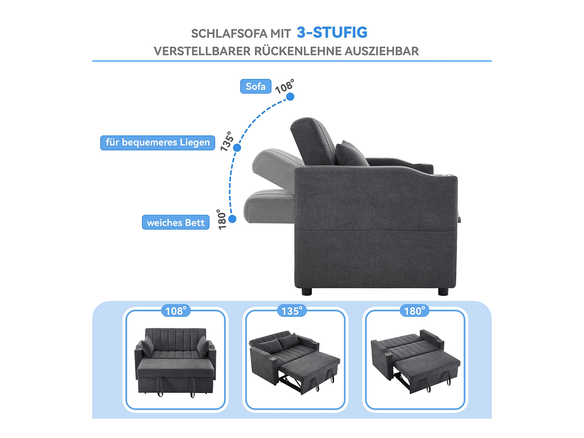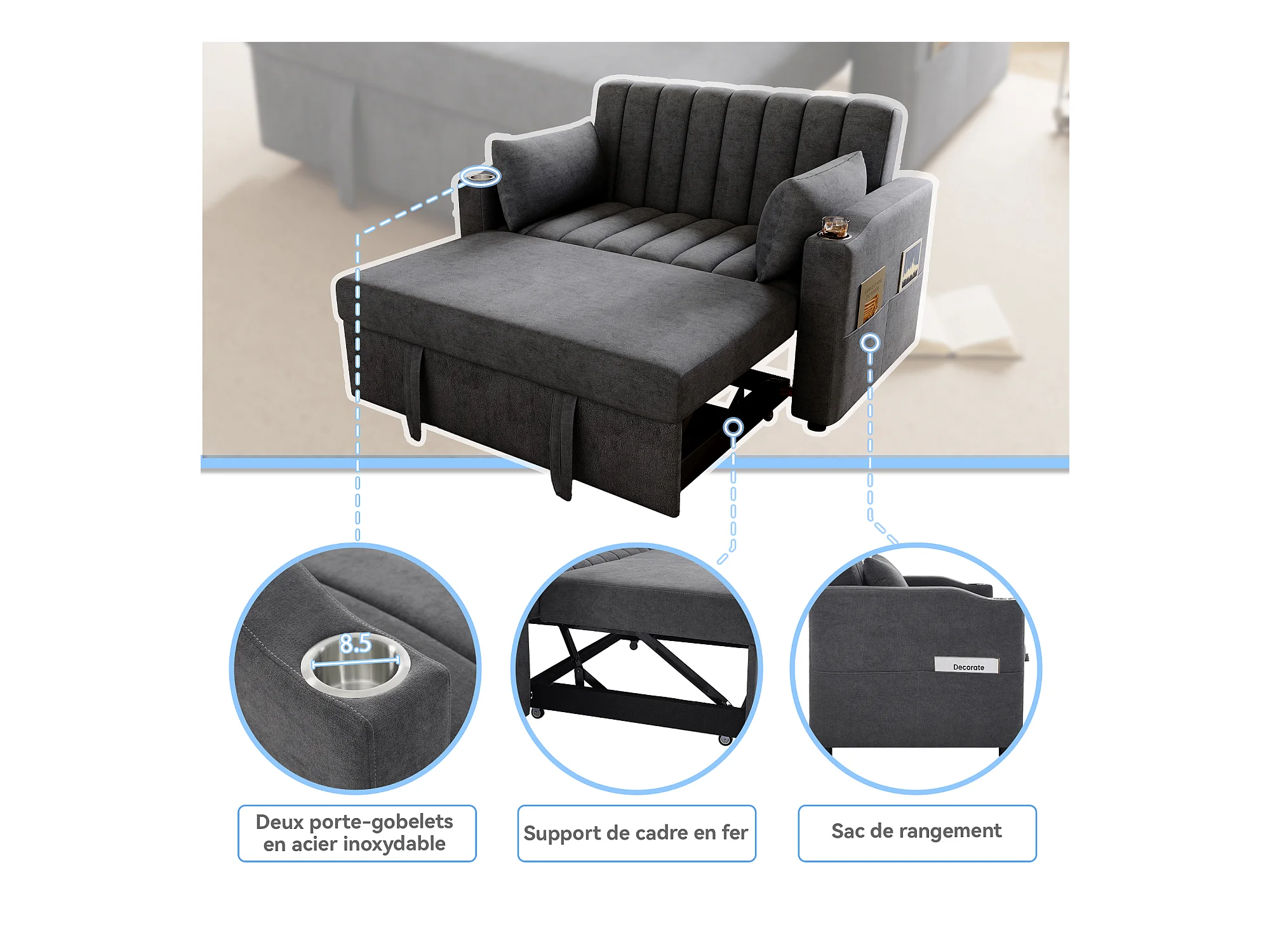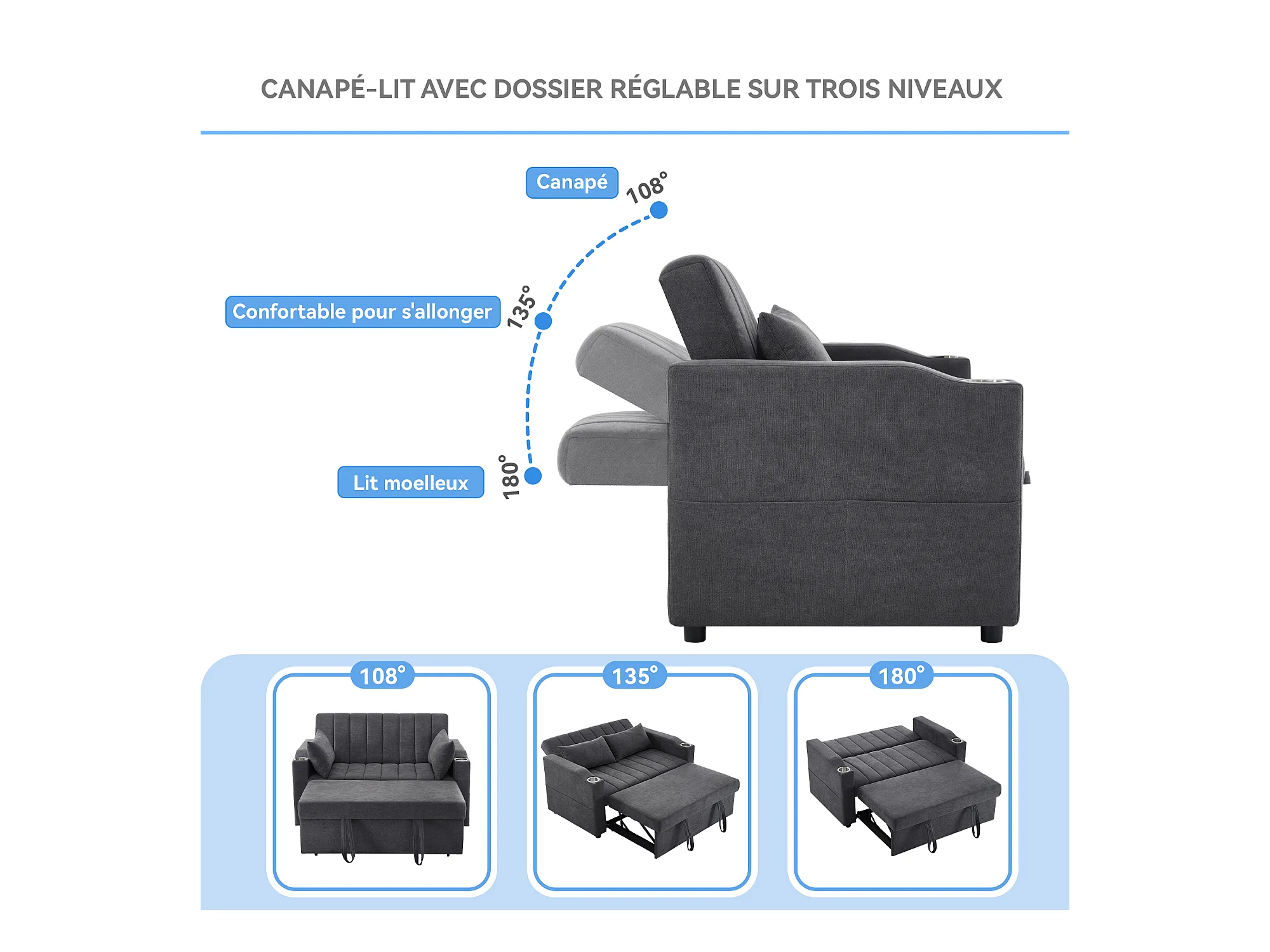 Canapé-lit gigogne - 80 x 160 cm - double avec dossier réglable + avec porte + gobelet + oreillers - Tissu - Coton - gris