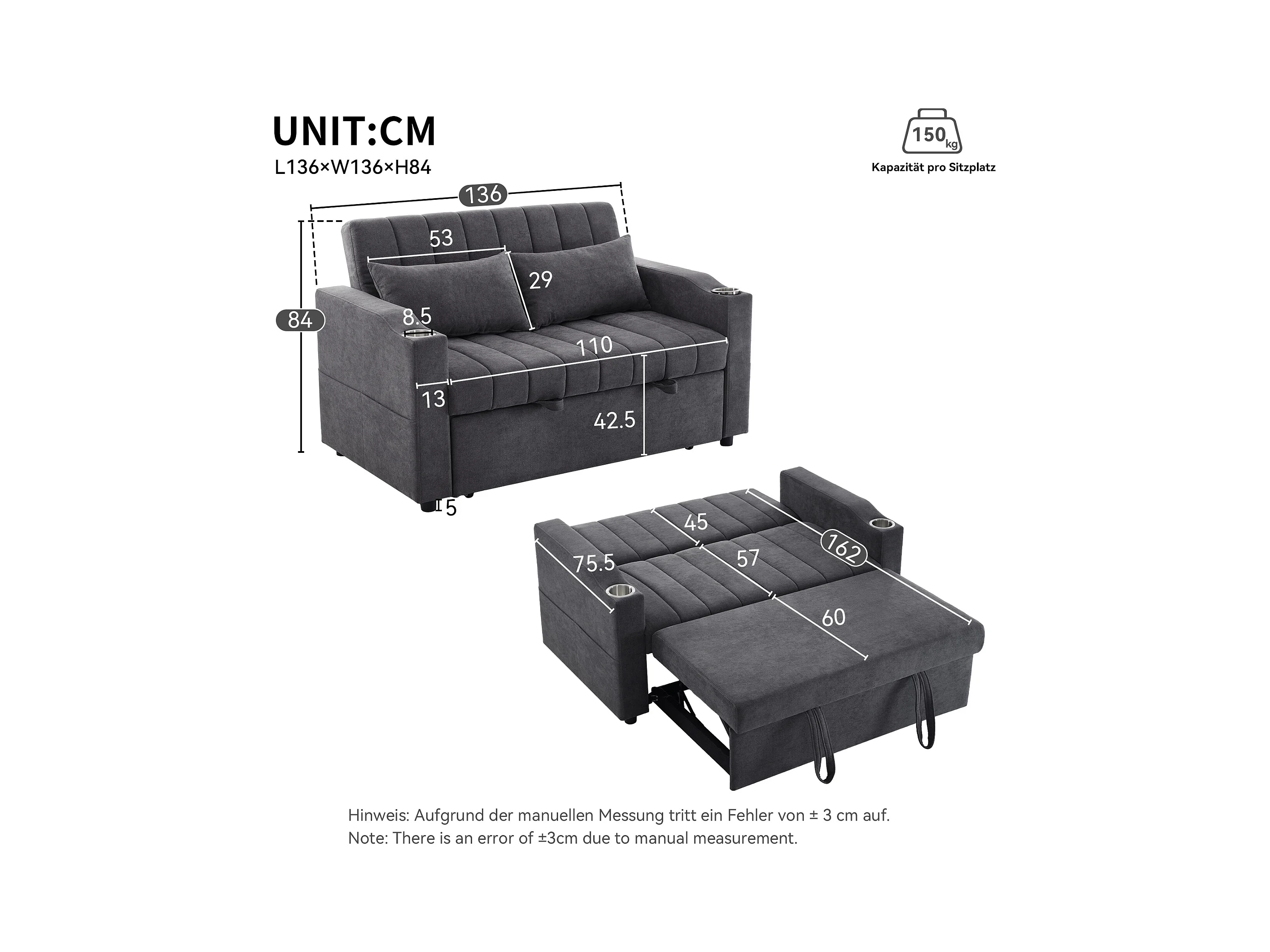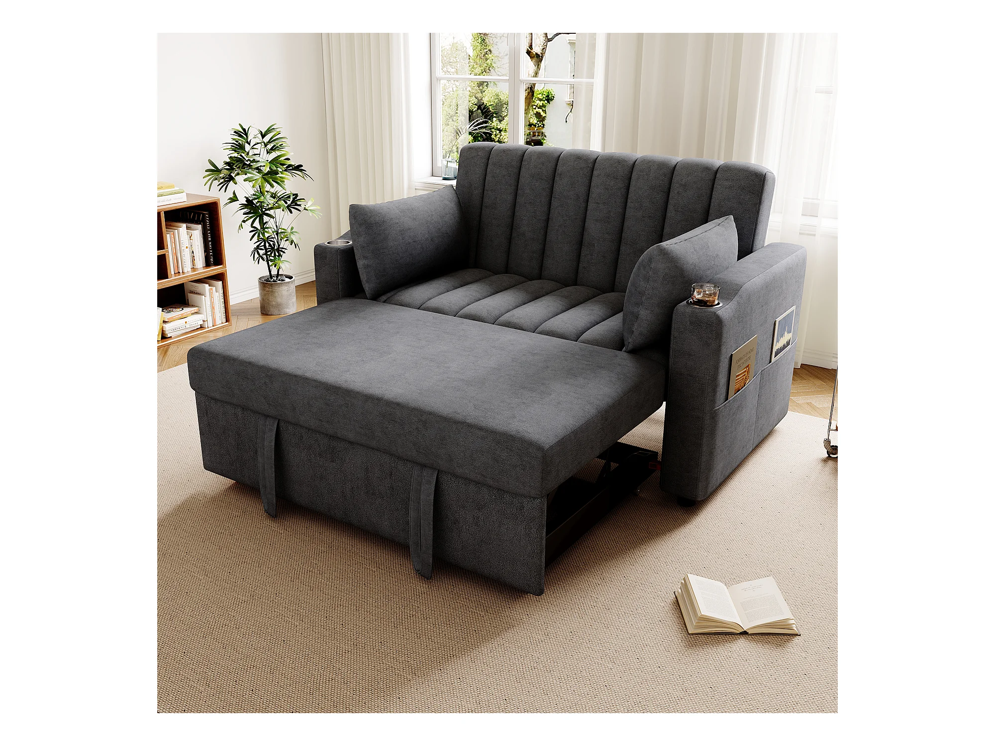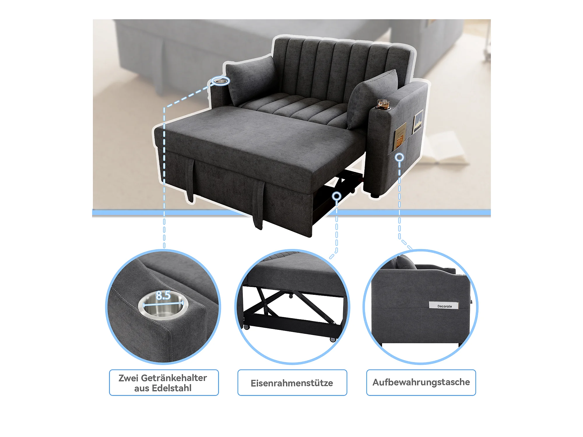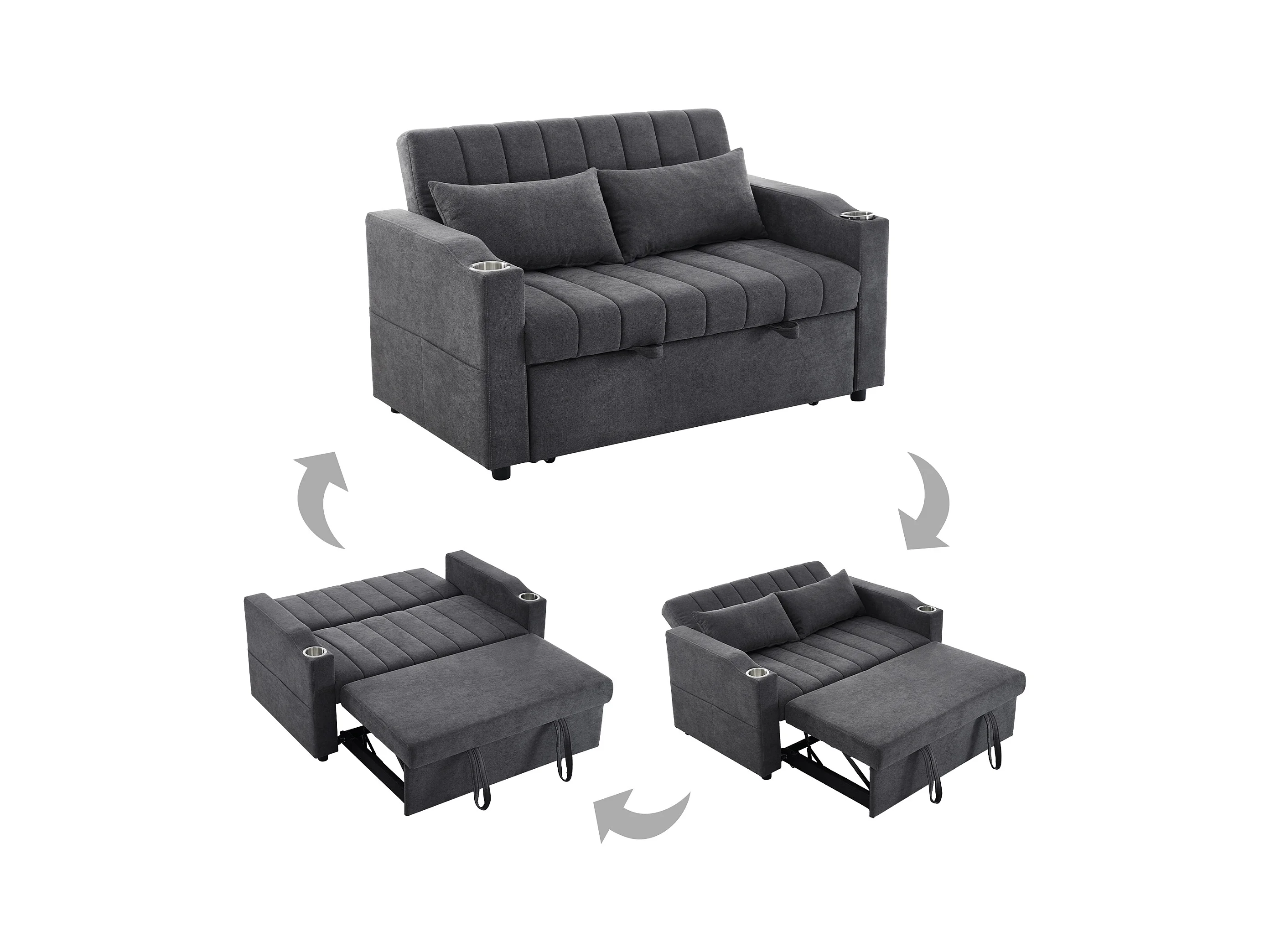 Canapé-lit gigogne - 80 x 160 cm - double avec dossier réglable + avec porte + gobelet + oreillers - Tissu - Coton - gris
