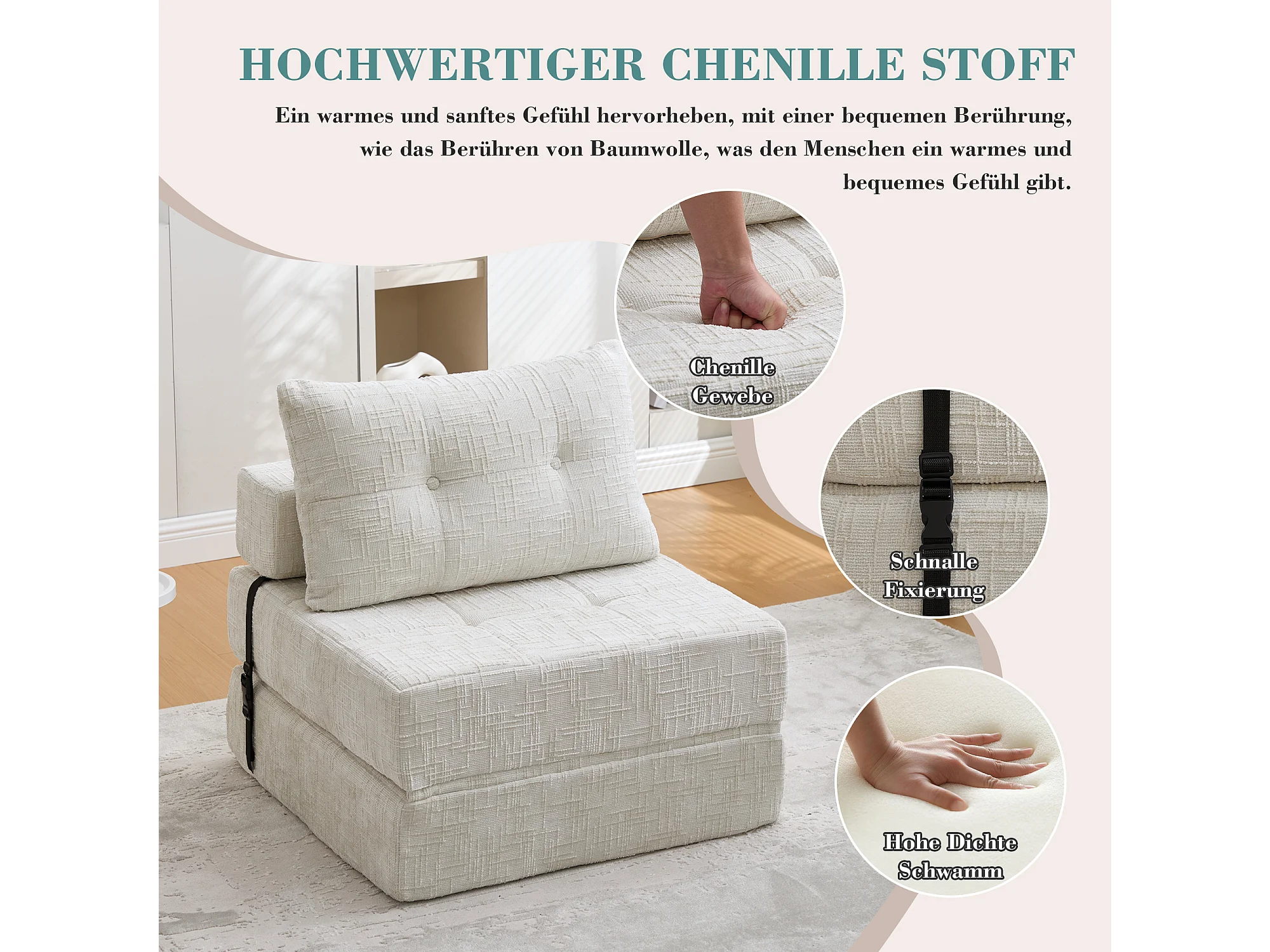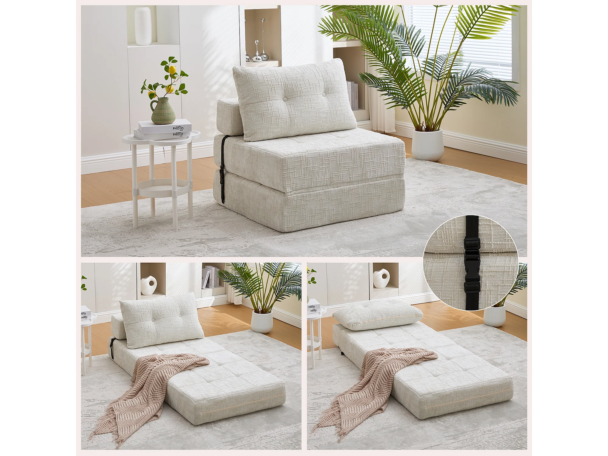 Canapé-lit pliable avec coussins, matelas pliant avec dossier, canapé portable confortable, beige (79x79x57 cm)