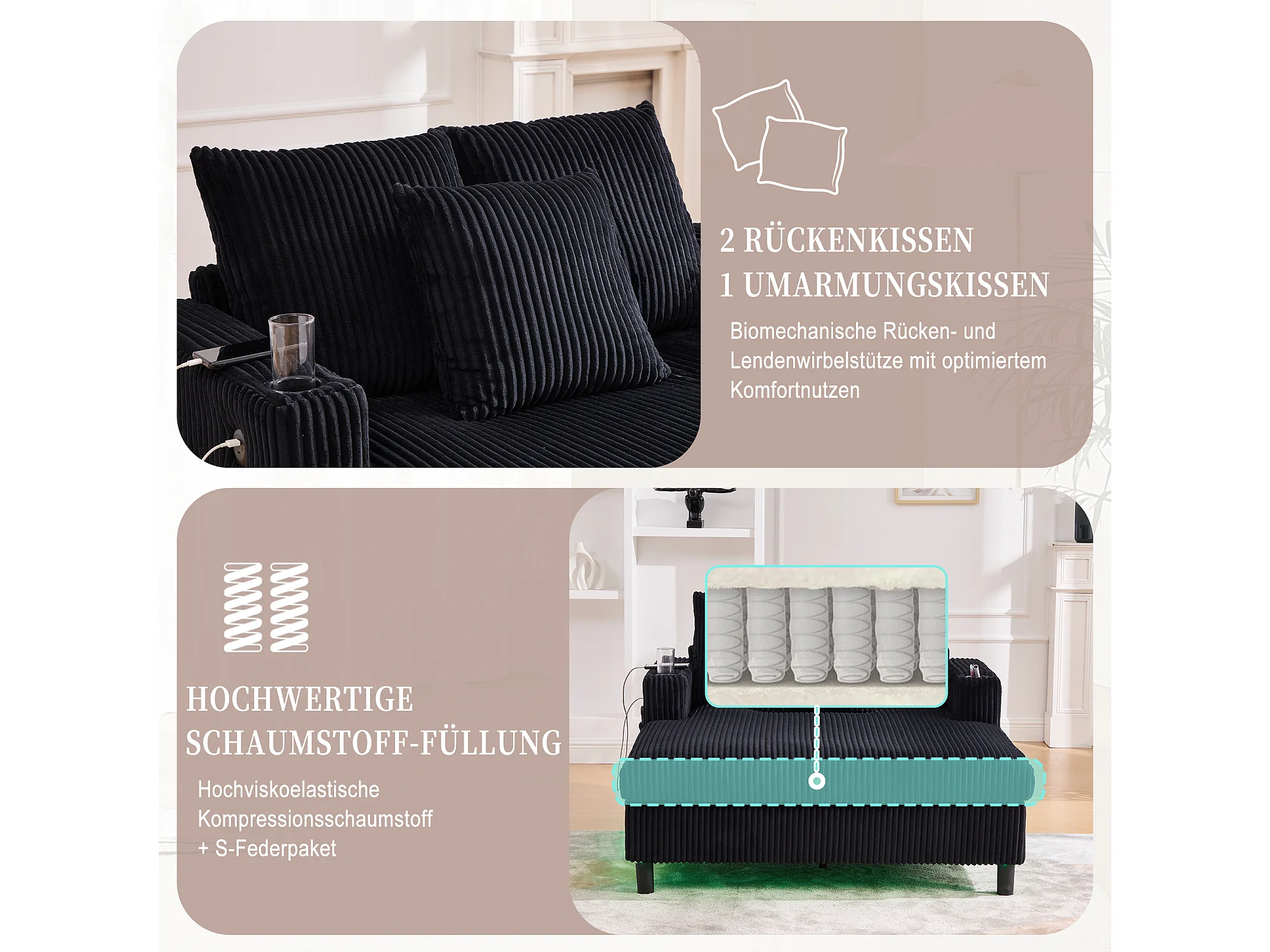 Canapé 1 place fixe en velours noir – double couche pliable – avec LED & port USB - 350kg / 128x85cm