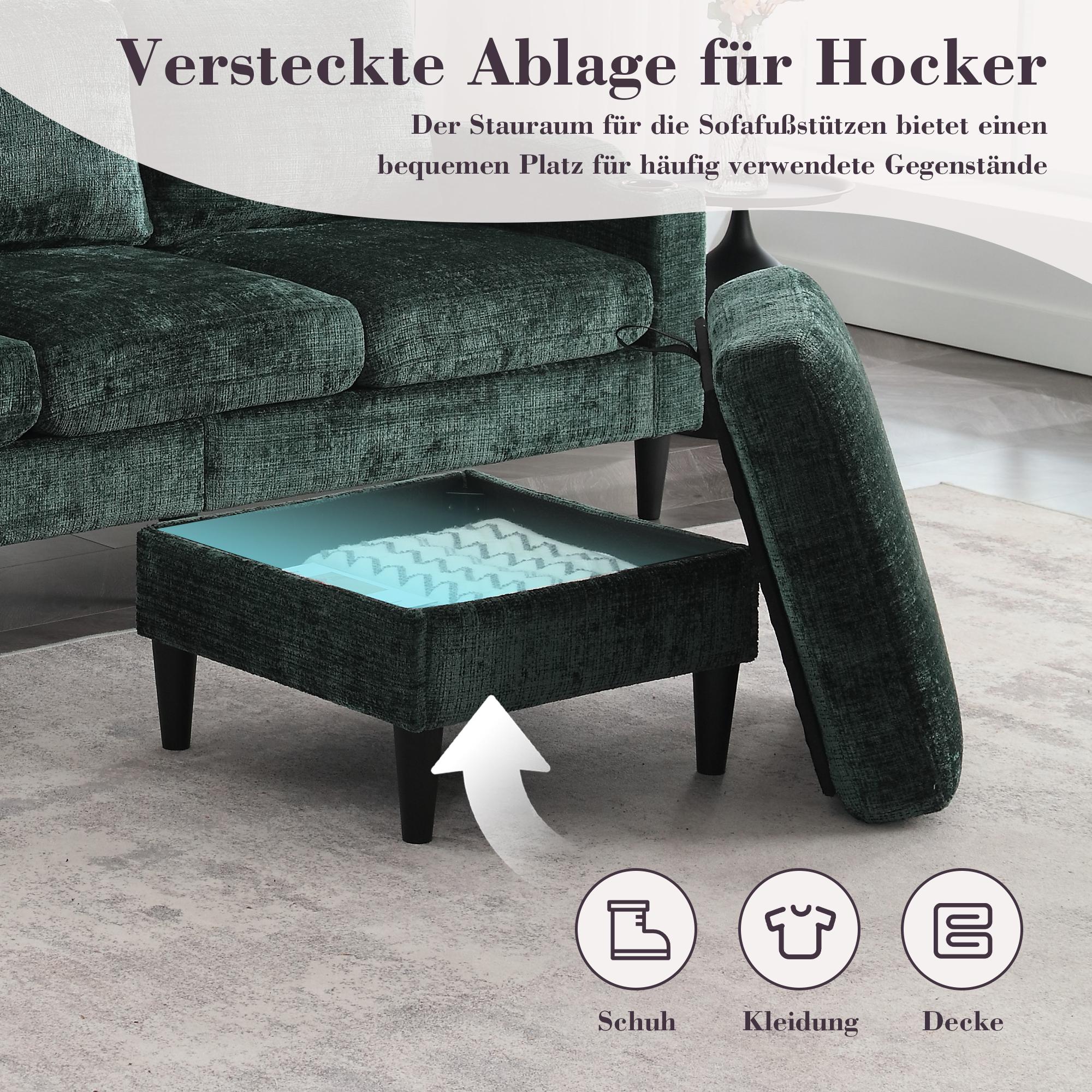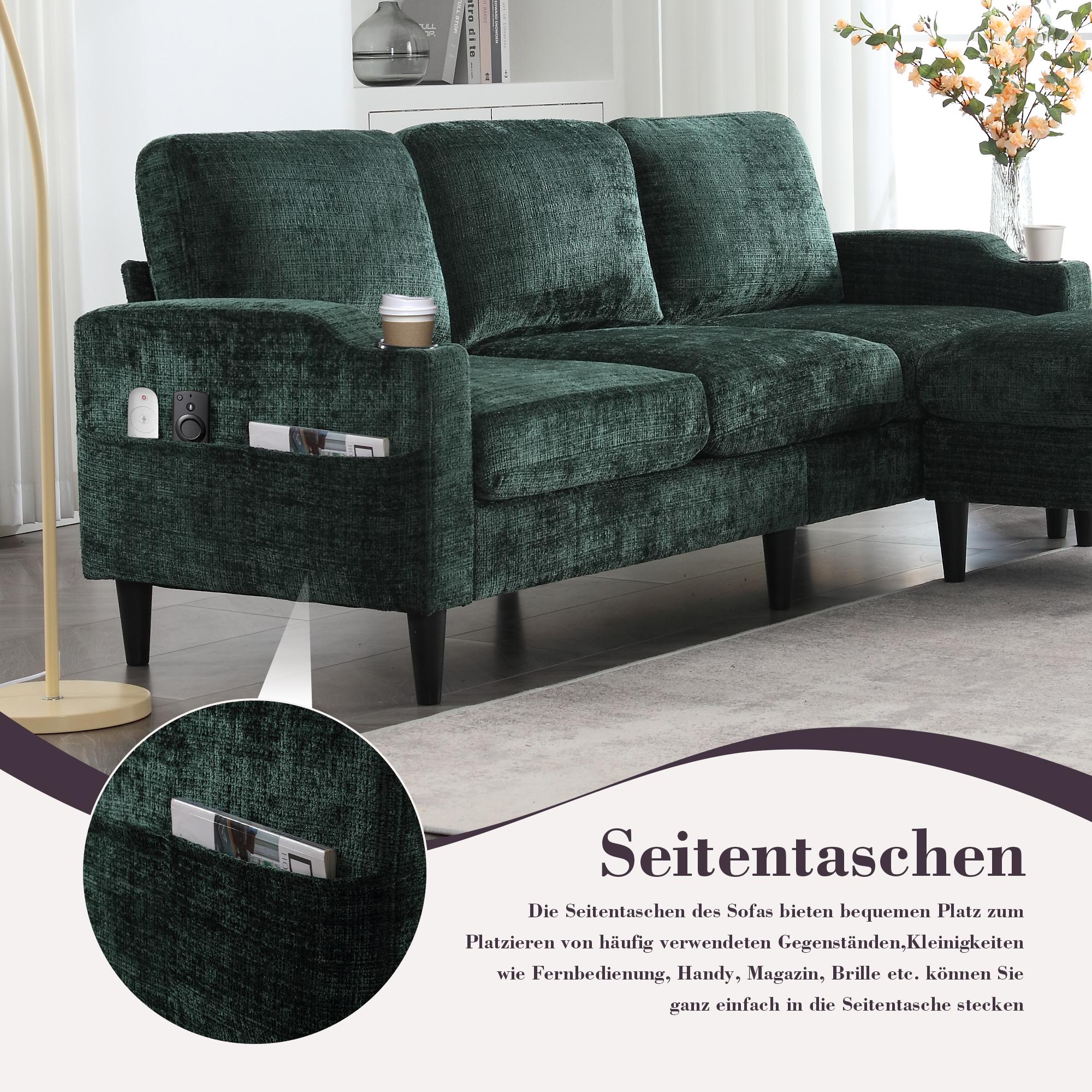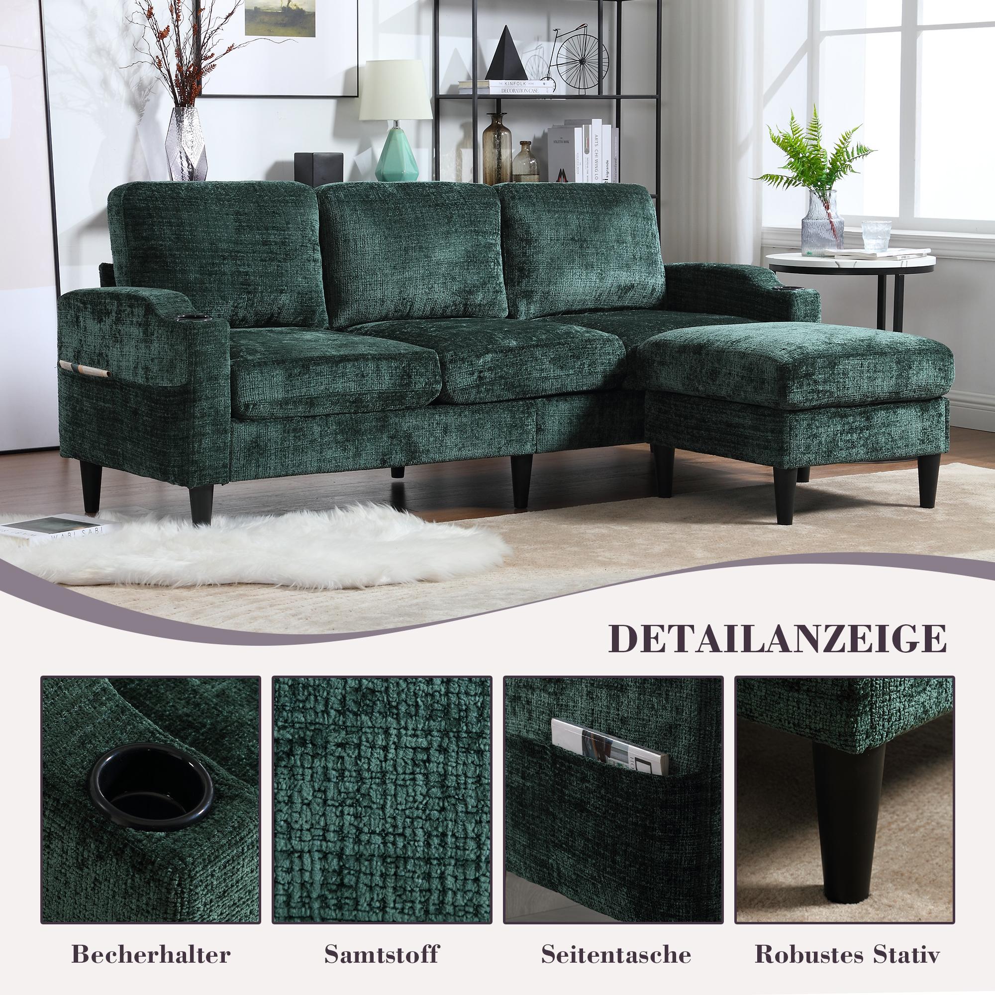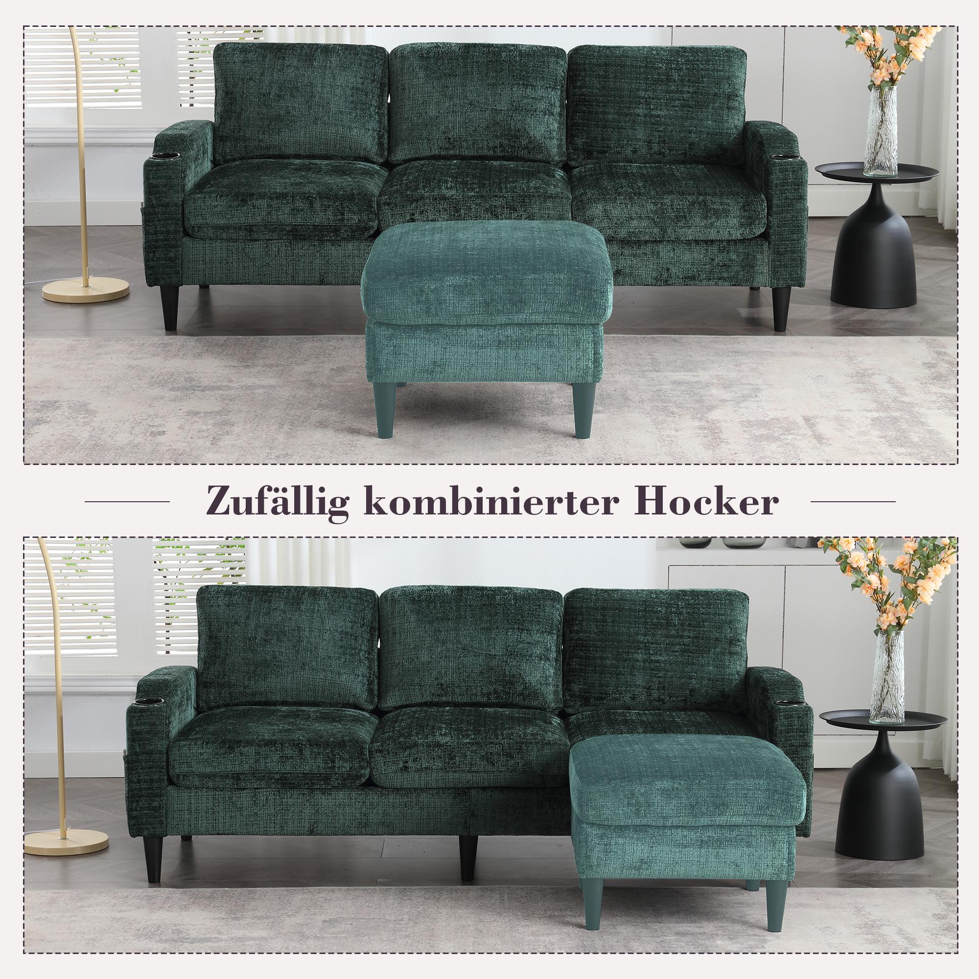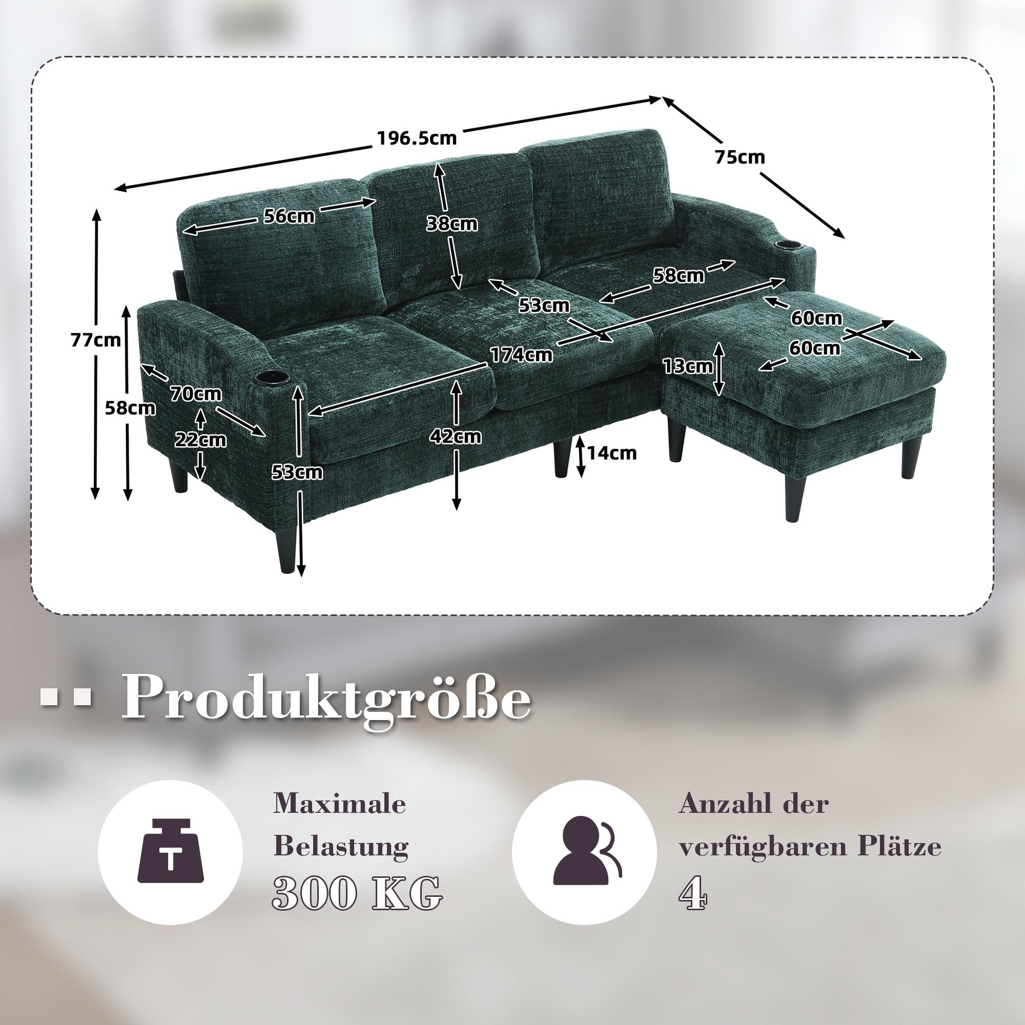 Canapé 3 places en tissu chenille Vert – avec repose‑pieds mobile coffre & porte‑gobelet – idéal pour salon et bureau – 196.5x75x77cm
