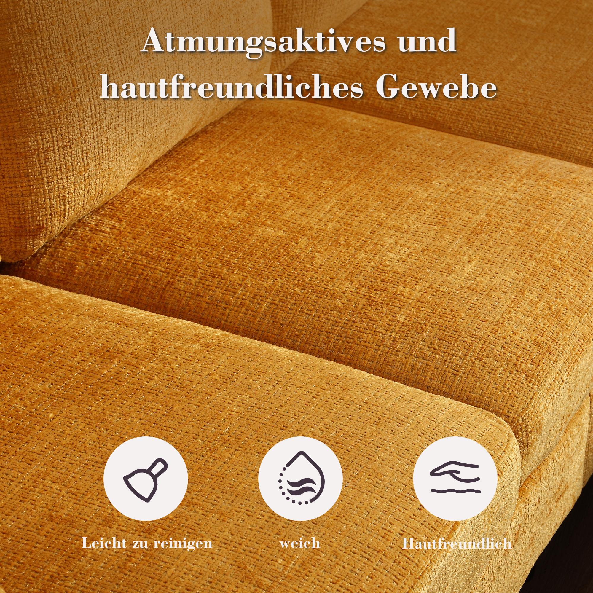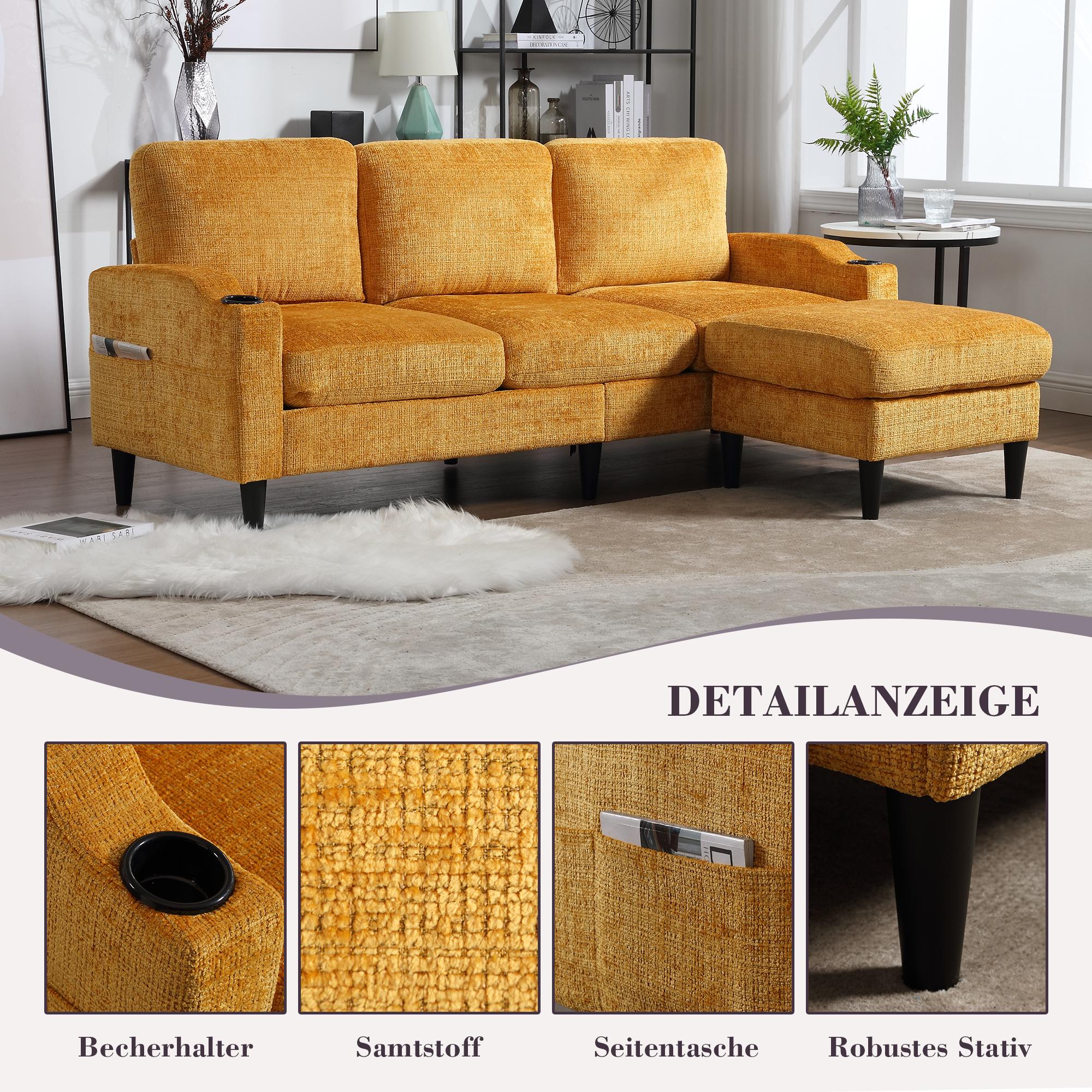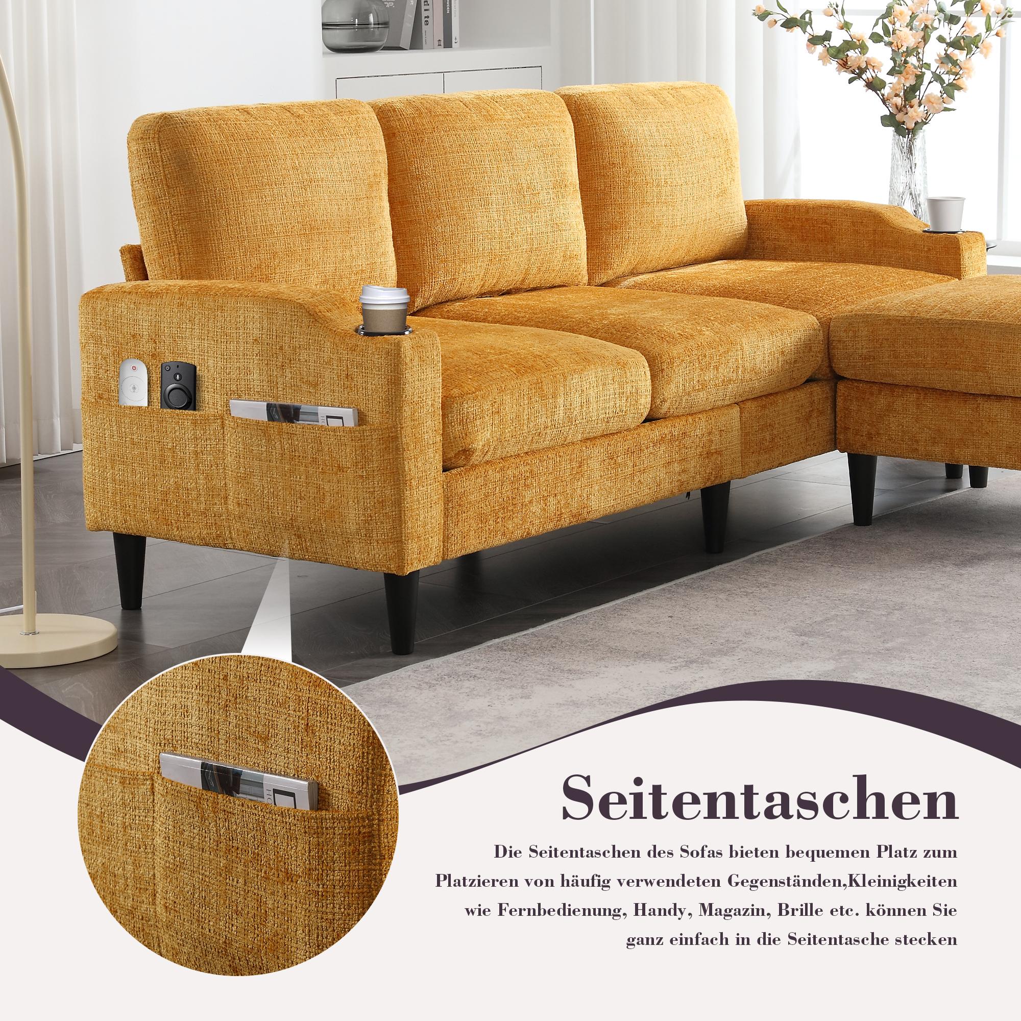 Canapé 3 places en tissu chenille Jaune – avec repose‑pieds mobile coffre & porte‑gobelet – idéal pour salon et bureau - 196.5x75x77cm