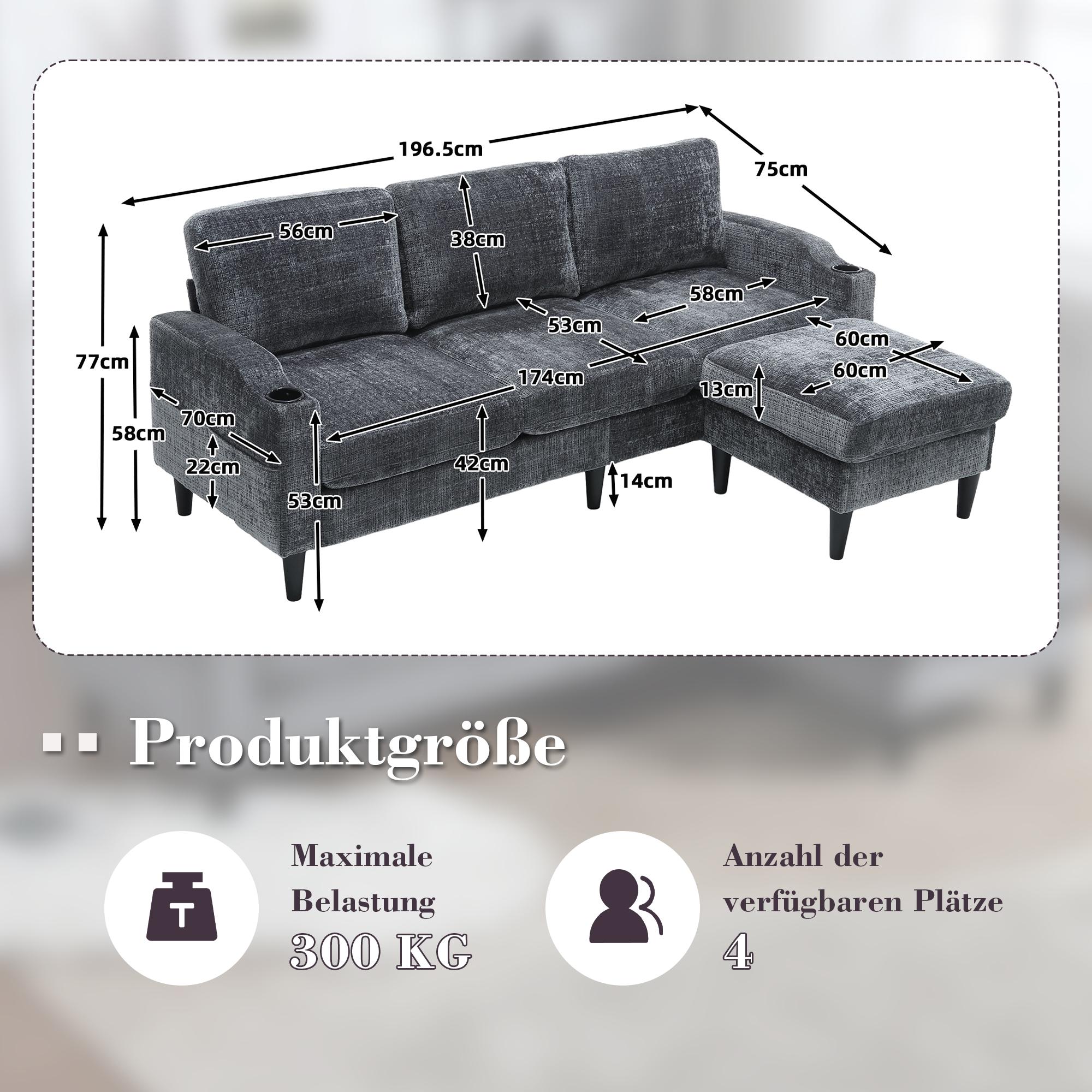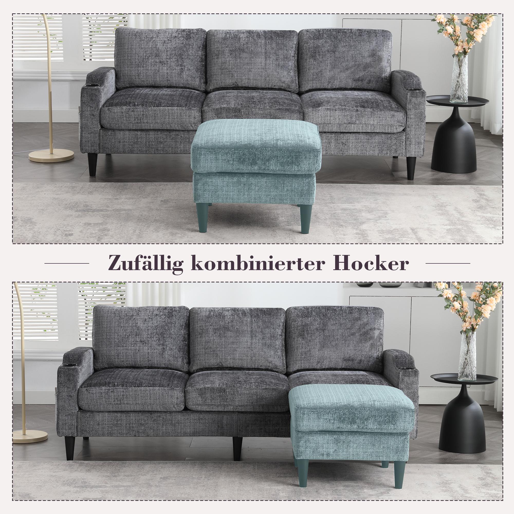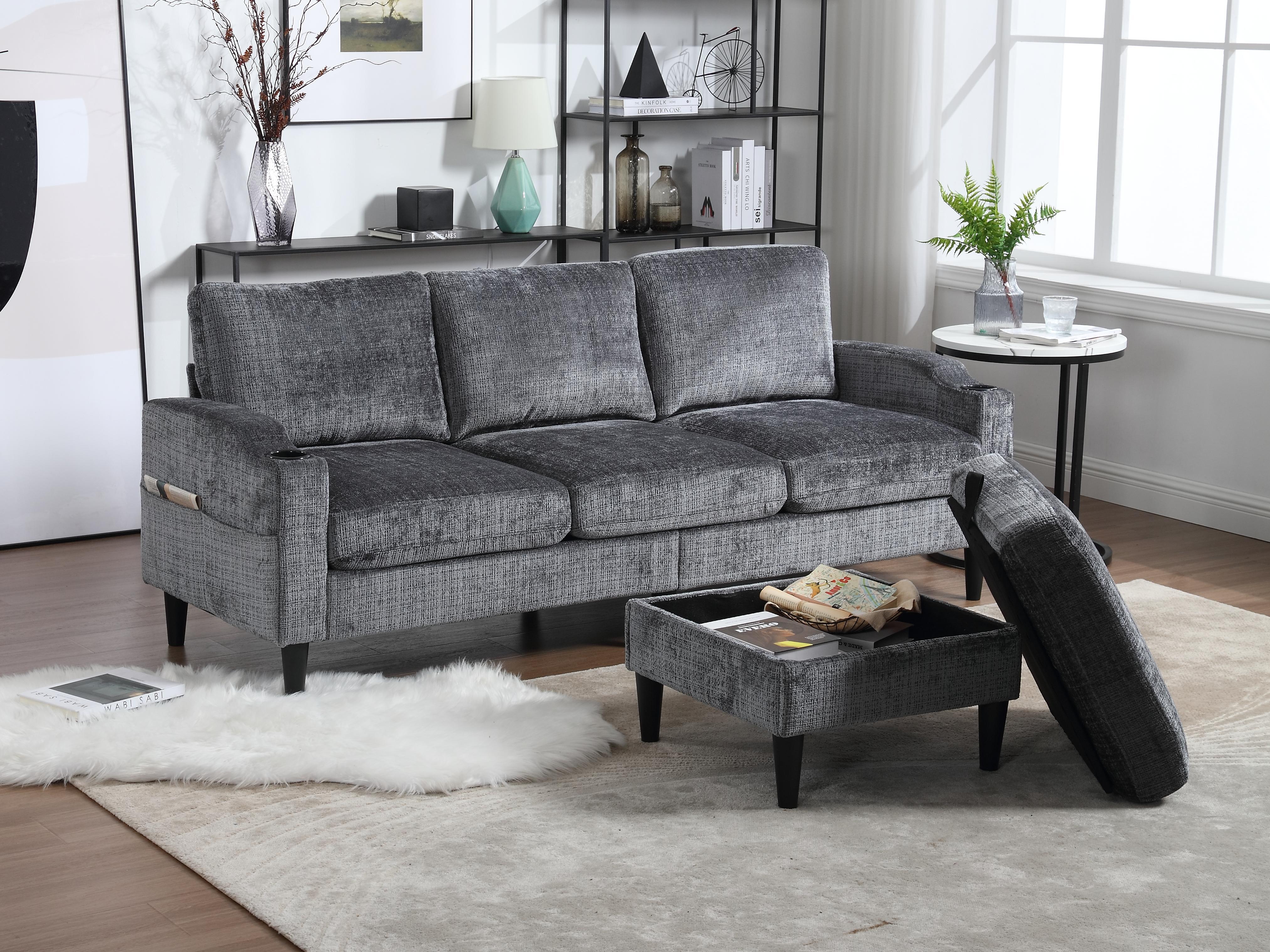 Canapé 3 places en tissu chenille Gris – avec repose‑pieds mobile coffre & porte‑gobelet – idéal pour salon et bureau - 196.5x75x77cm