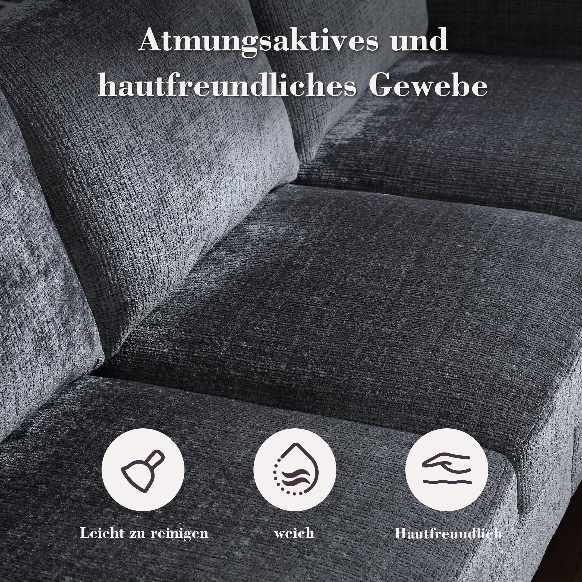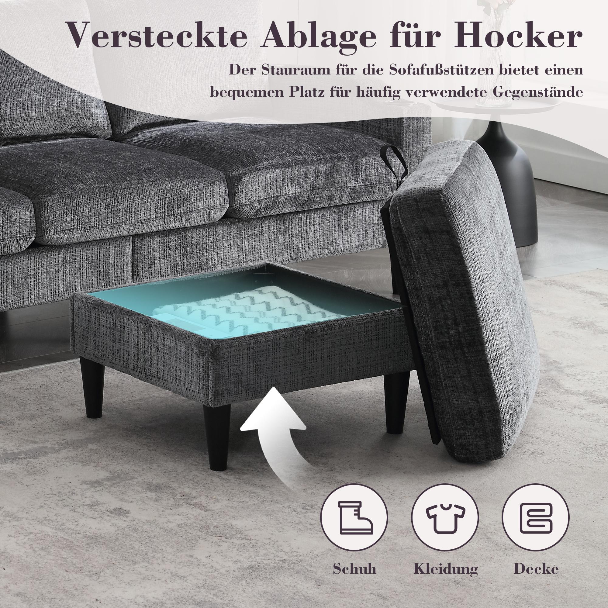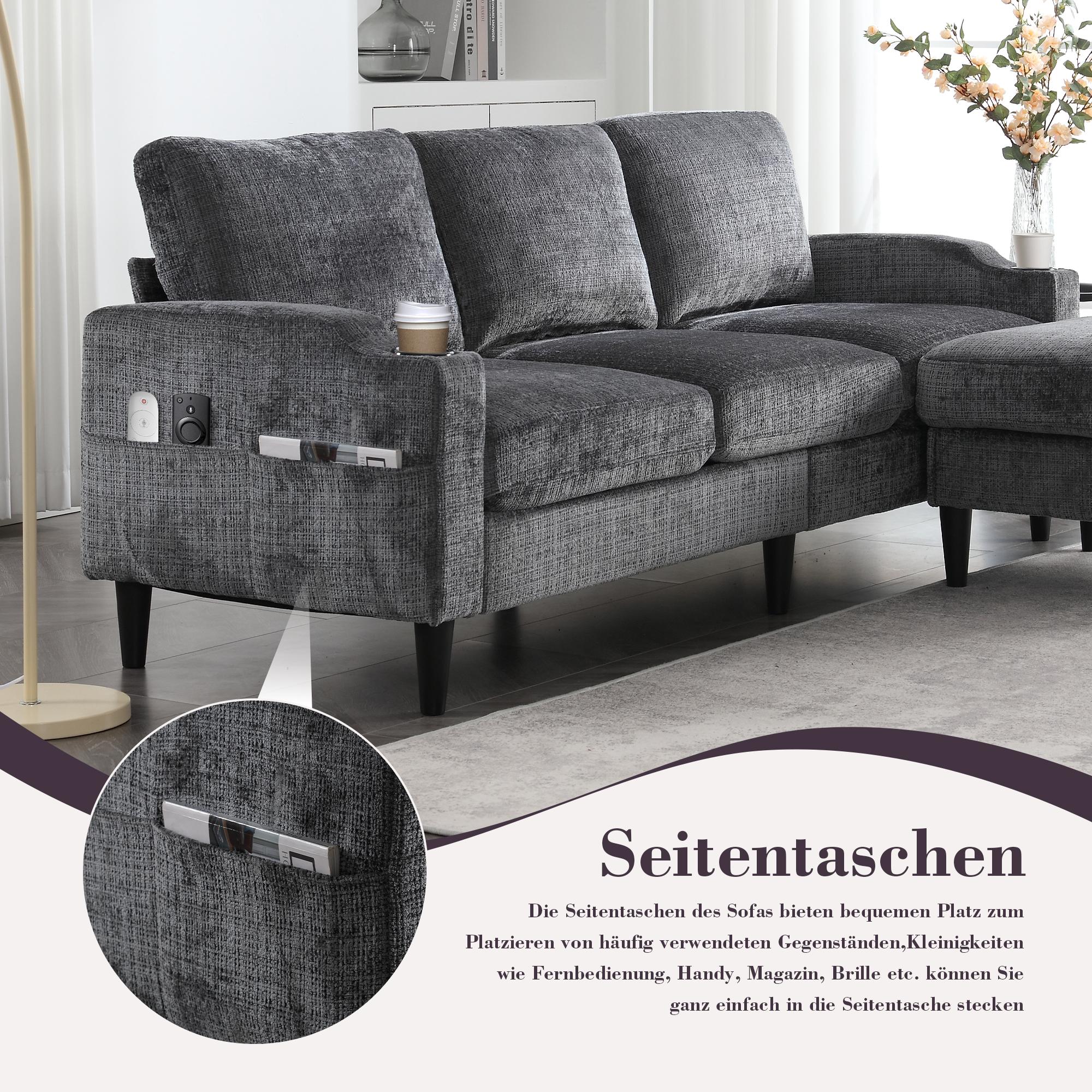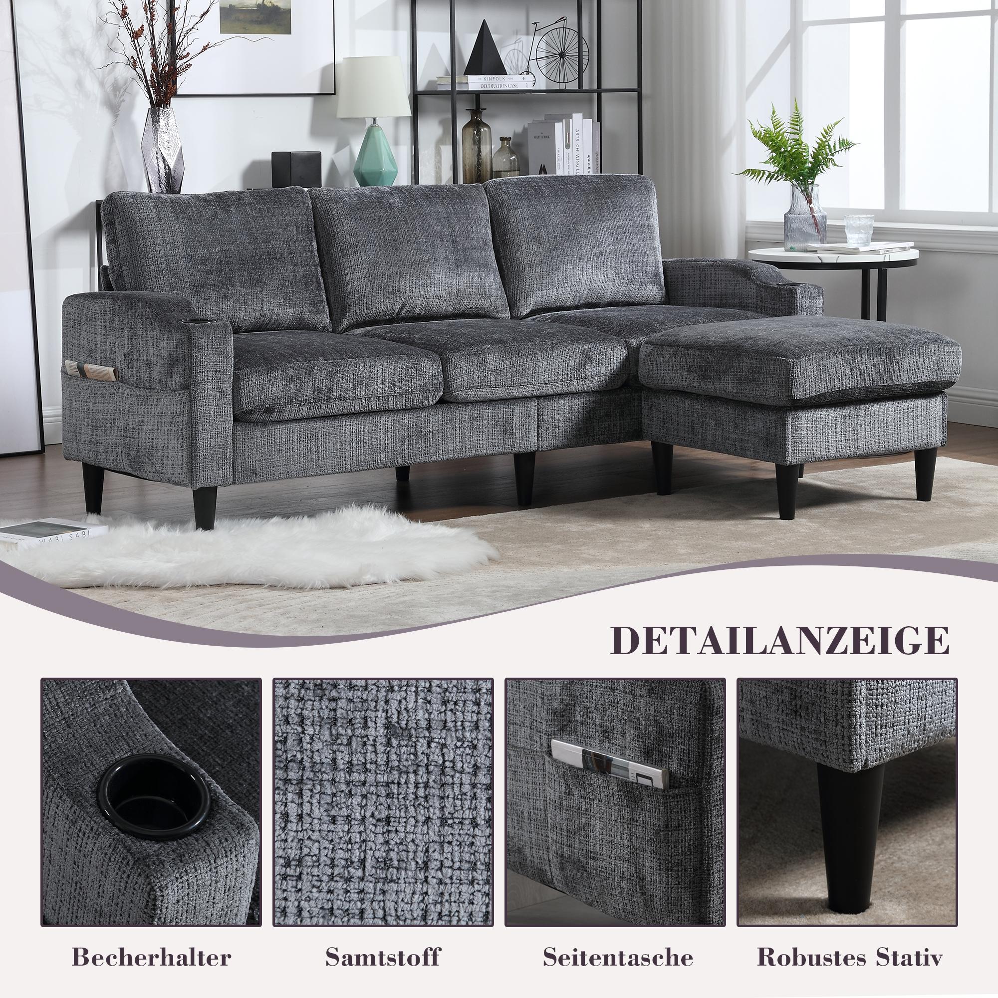 Canapé 3 places en tissu chenille Gris – avec repose‑pieds mobile coffre & porte‑gobelet – idéal pour salon et bureau - 196.5x75x77cm