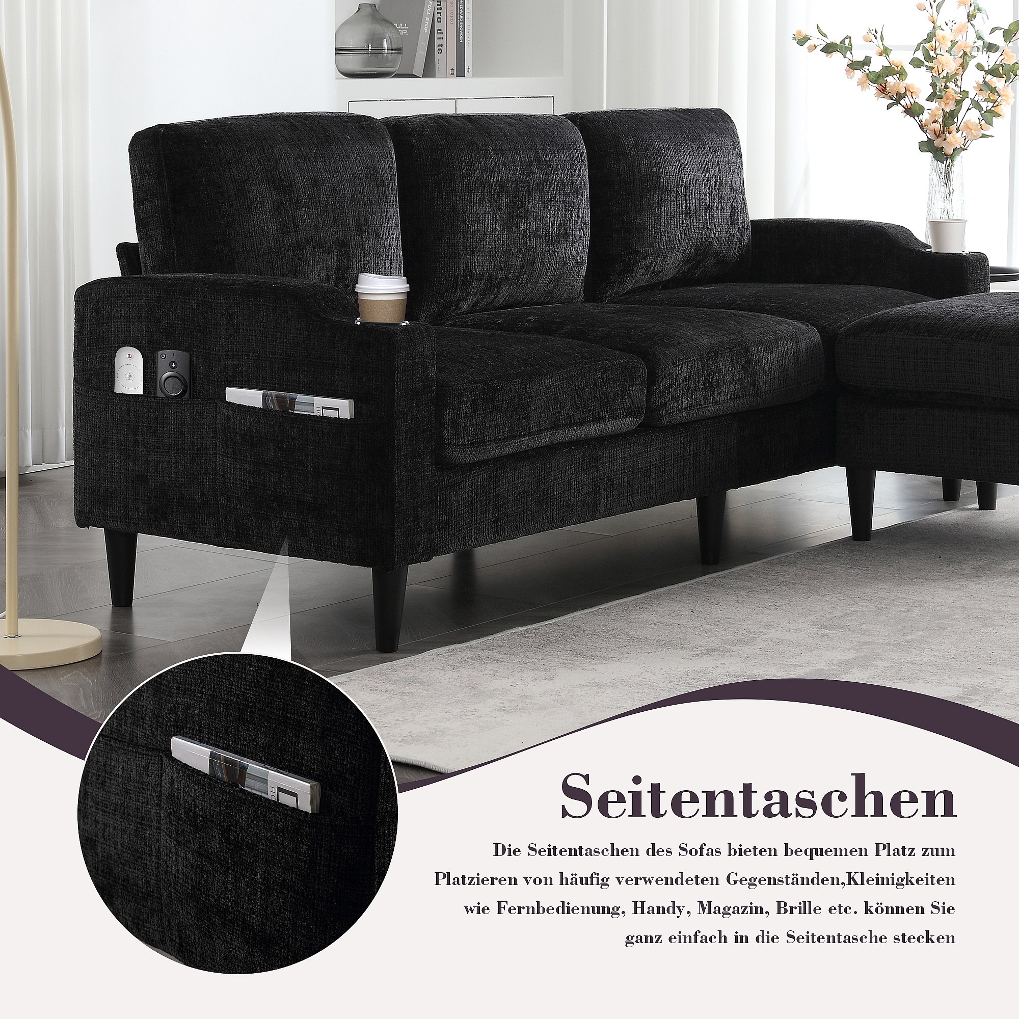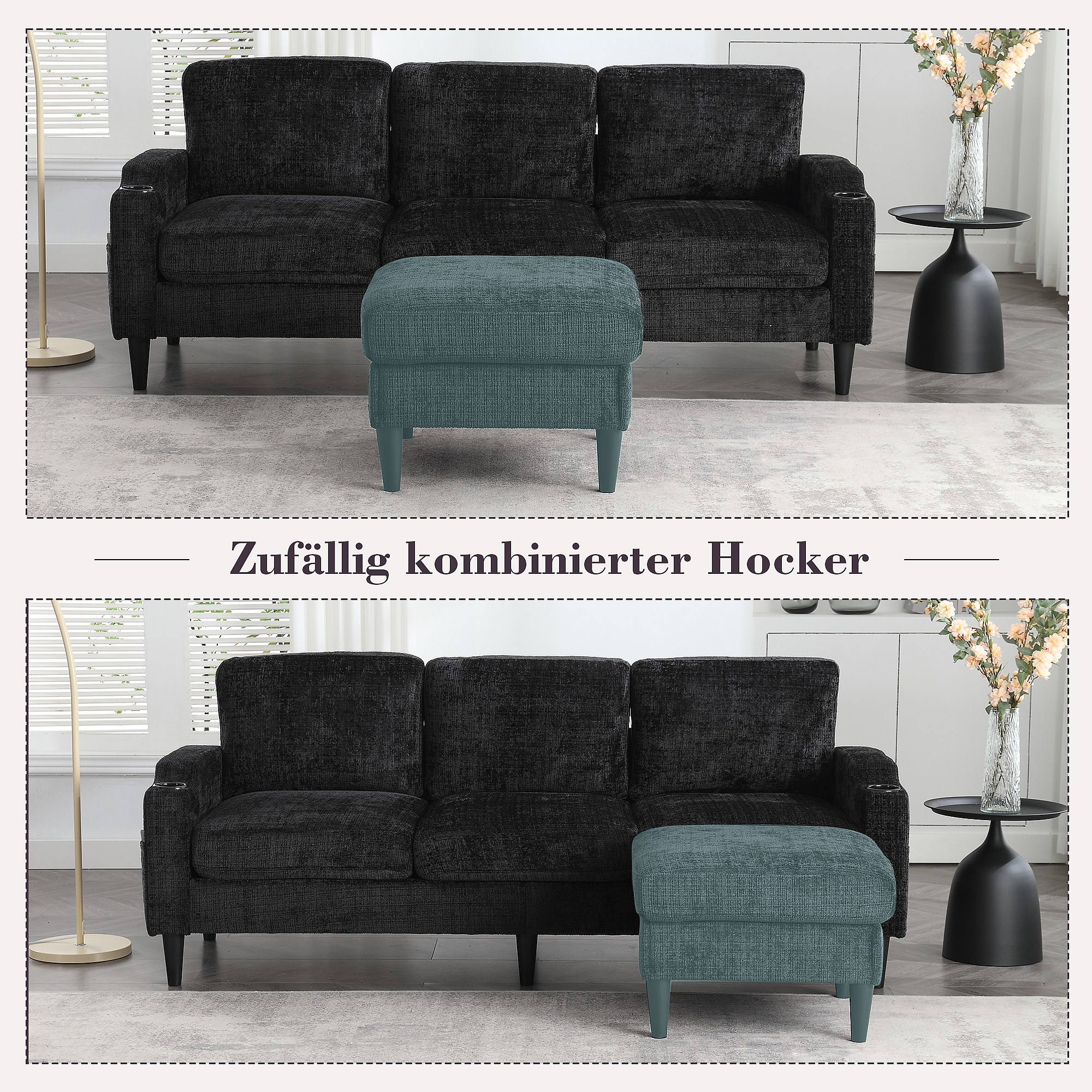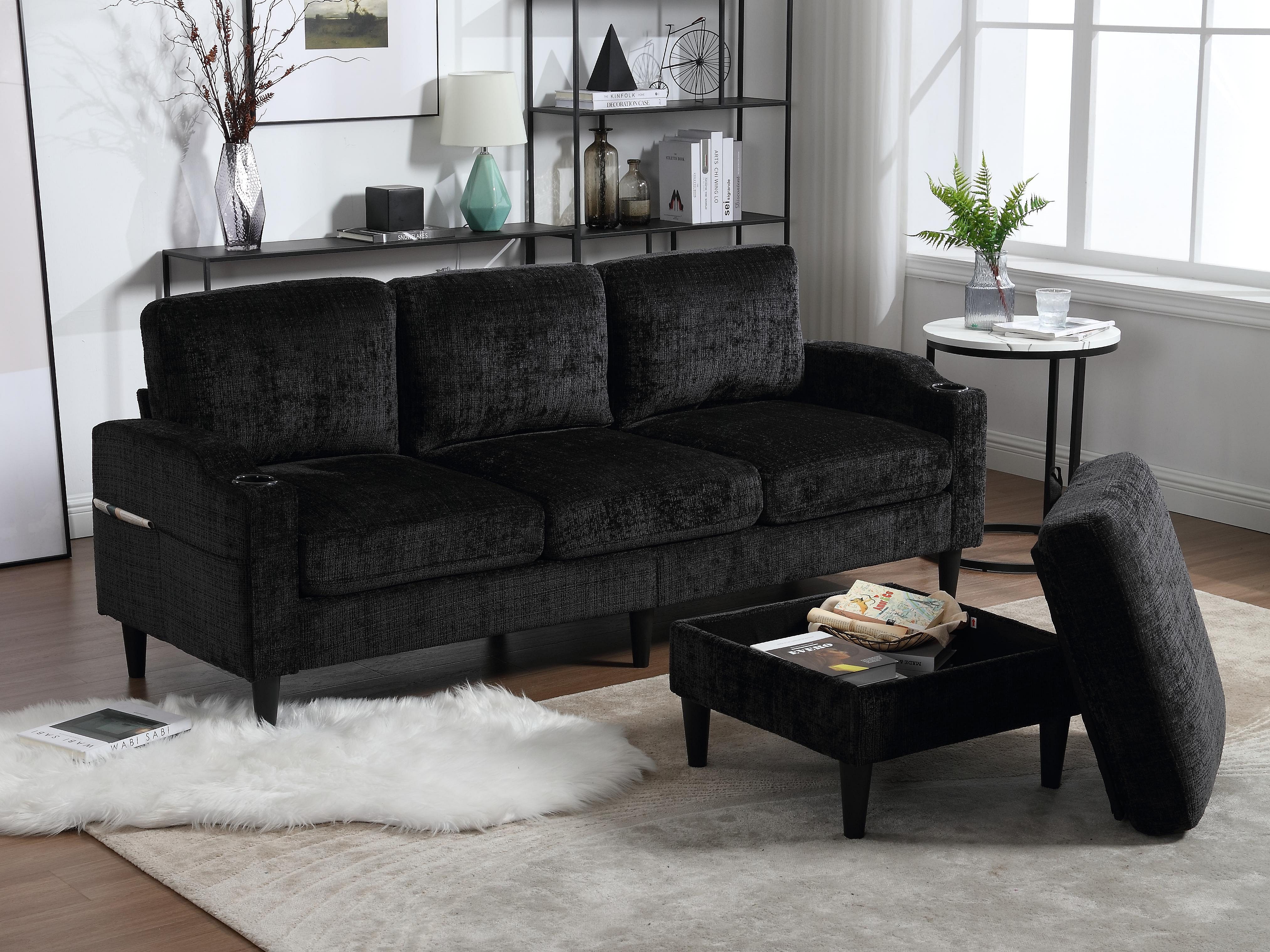 Canapé 3 places en tissu chenille Noir – avec repose‑pieds mobile coffre & porte‑gobelet – idéal pour salon et bureau - 196.5x75x77cm