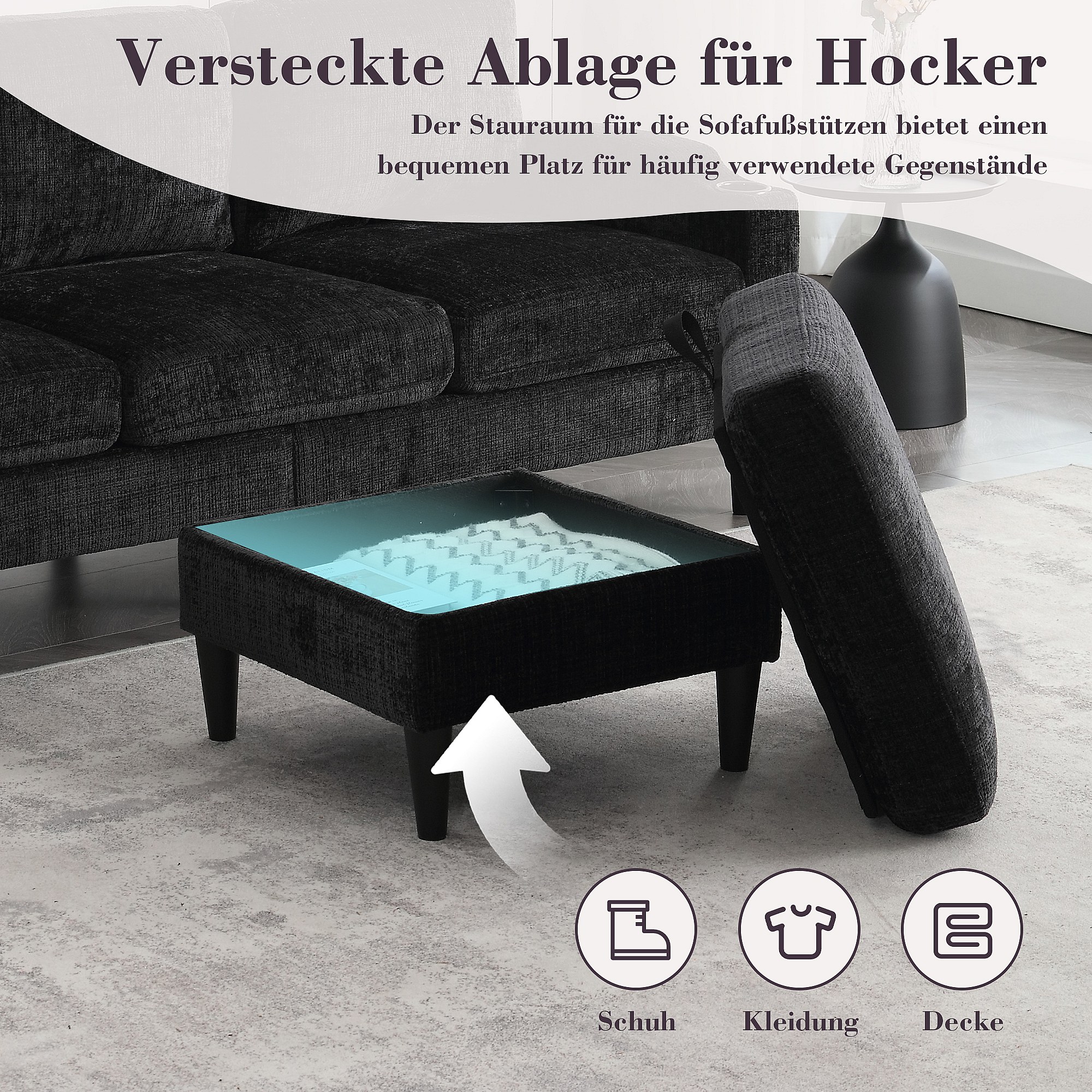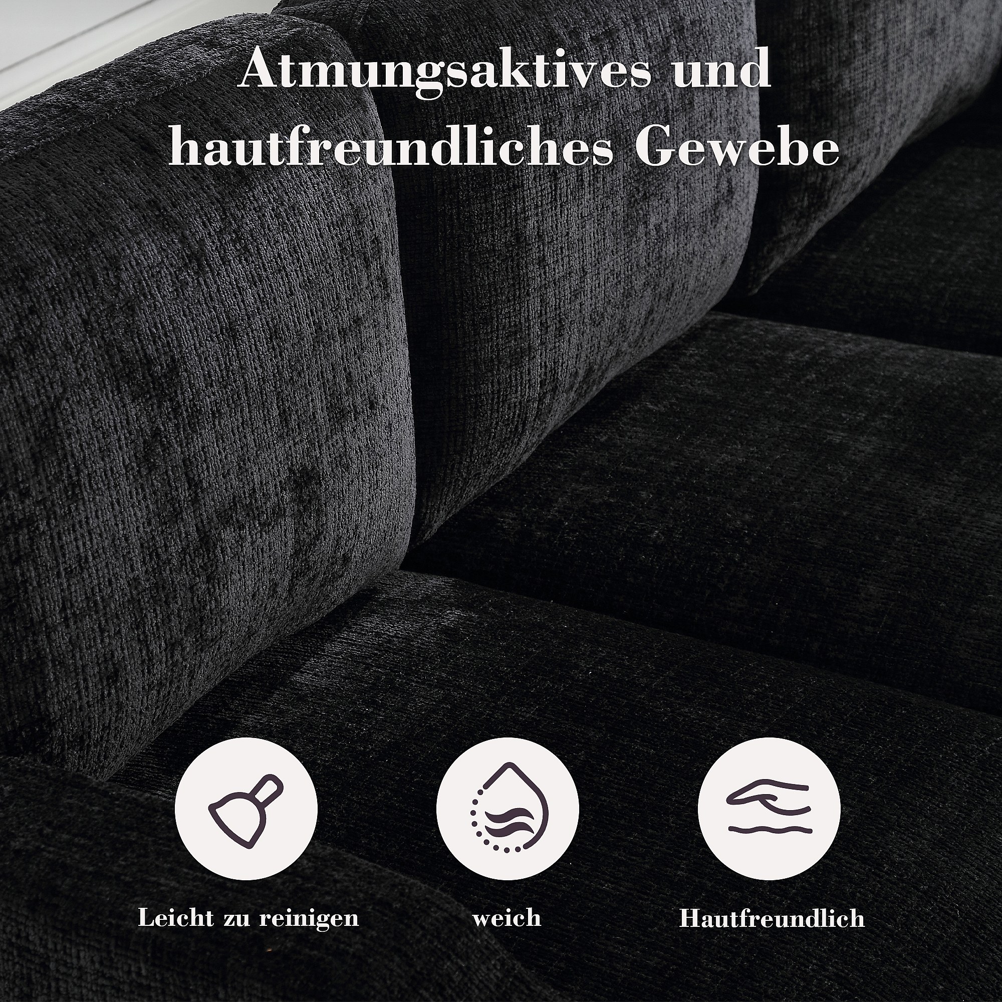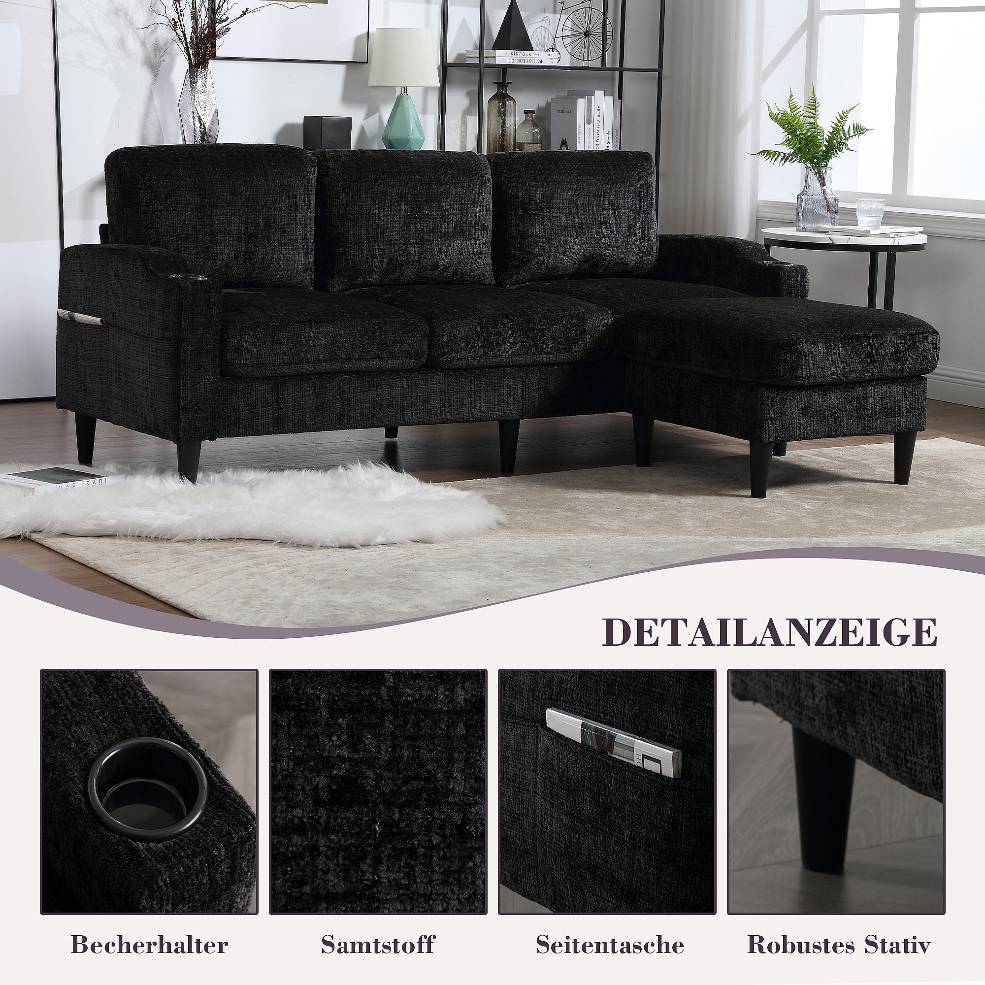 Canapé 3 places en tissu chenille Noir – avec repose‑pieds mobile coffre & porte‑gobelet – idéal pour salon et bureau - 196.5x75x77cm