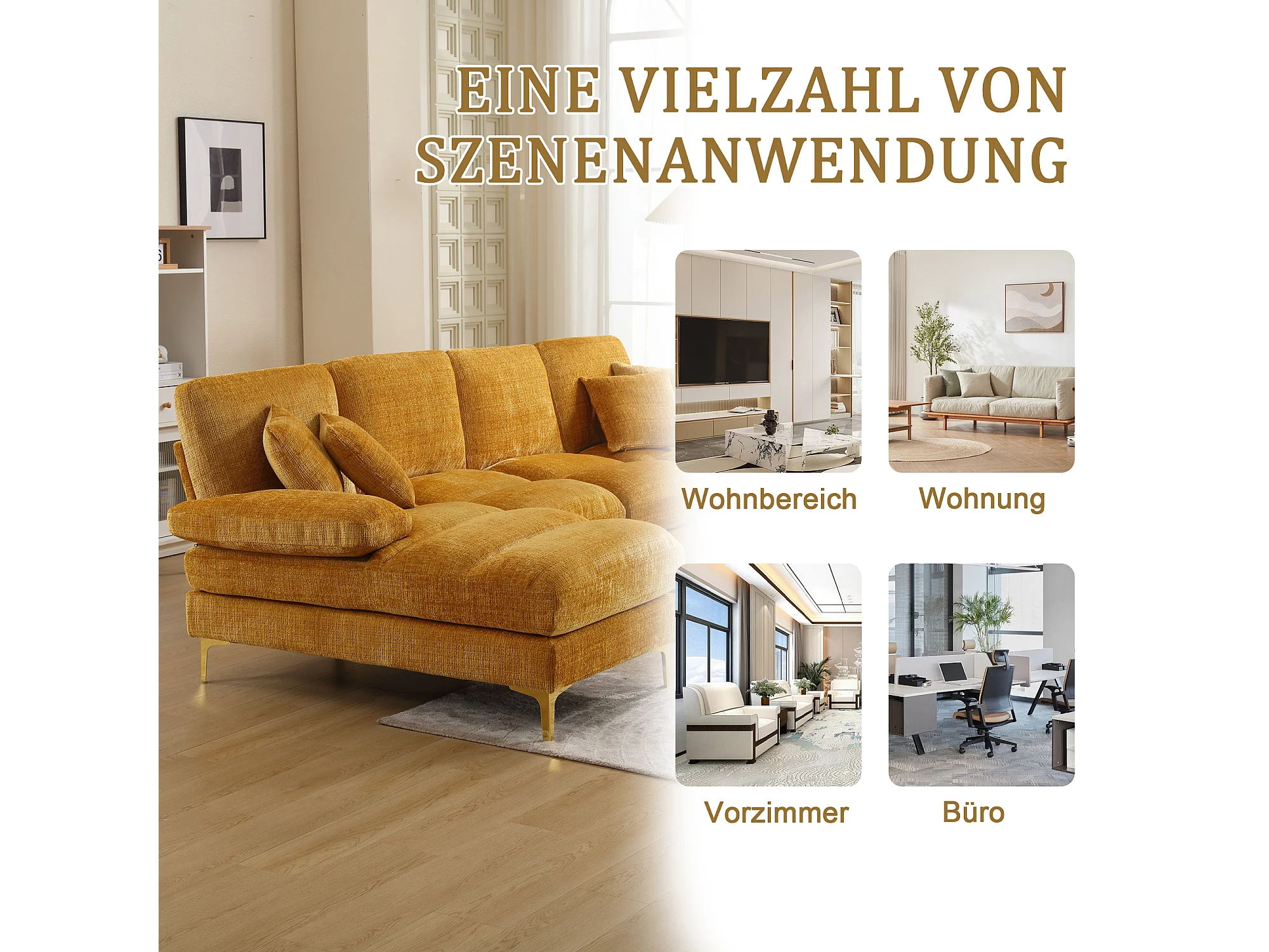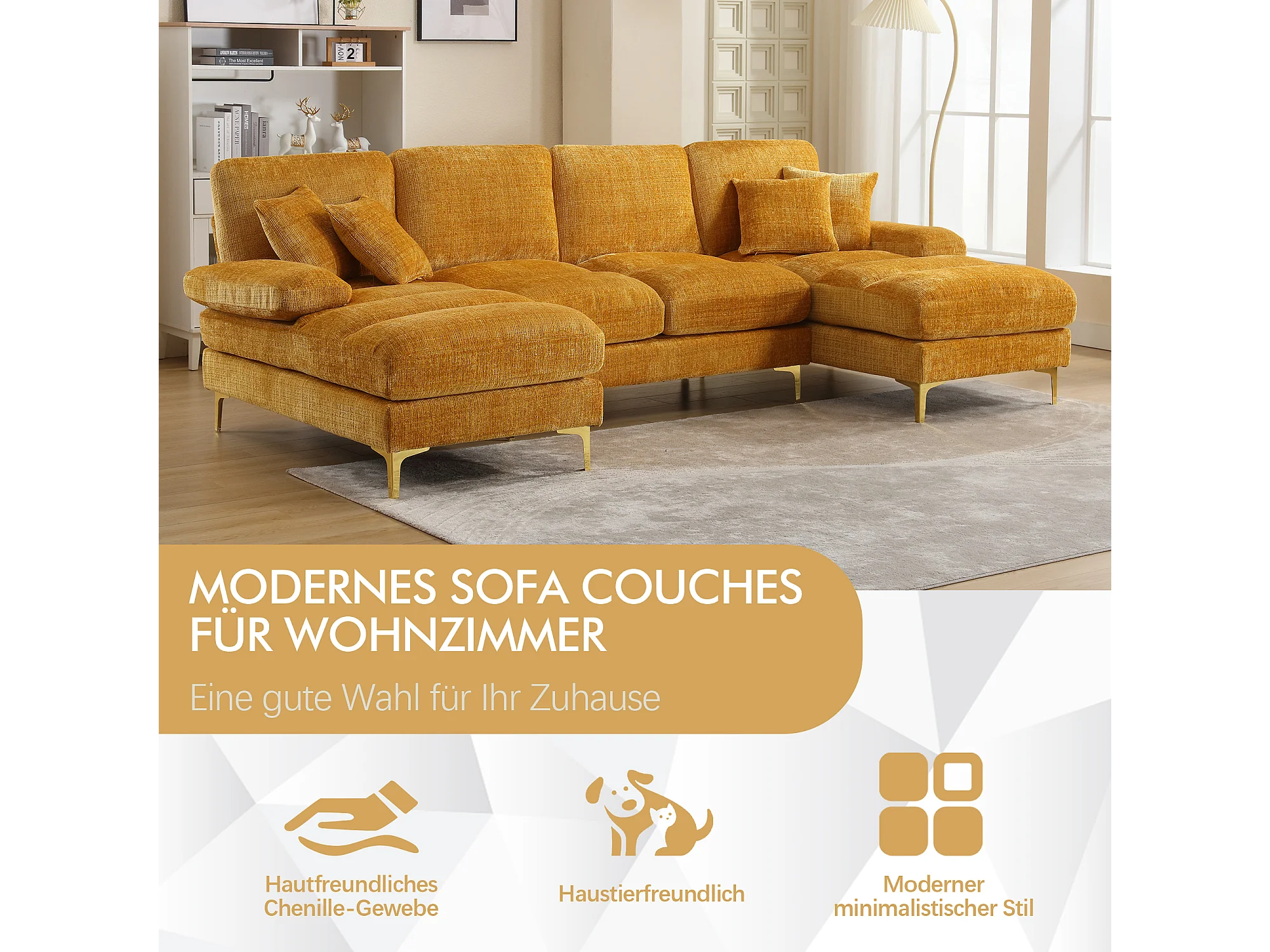 Canapé 4 Places Panoramique en Chenille Jaune à Double Couche (272x136x88 cm) - Pieds Dorés pour un Confort Exceptionnel