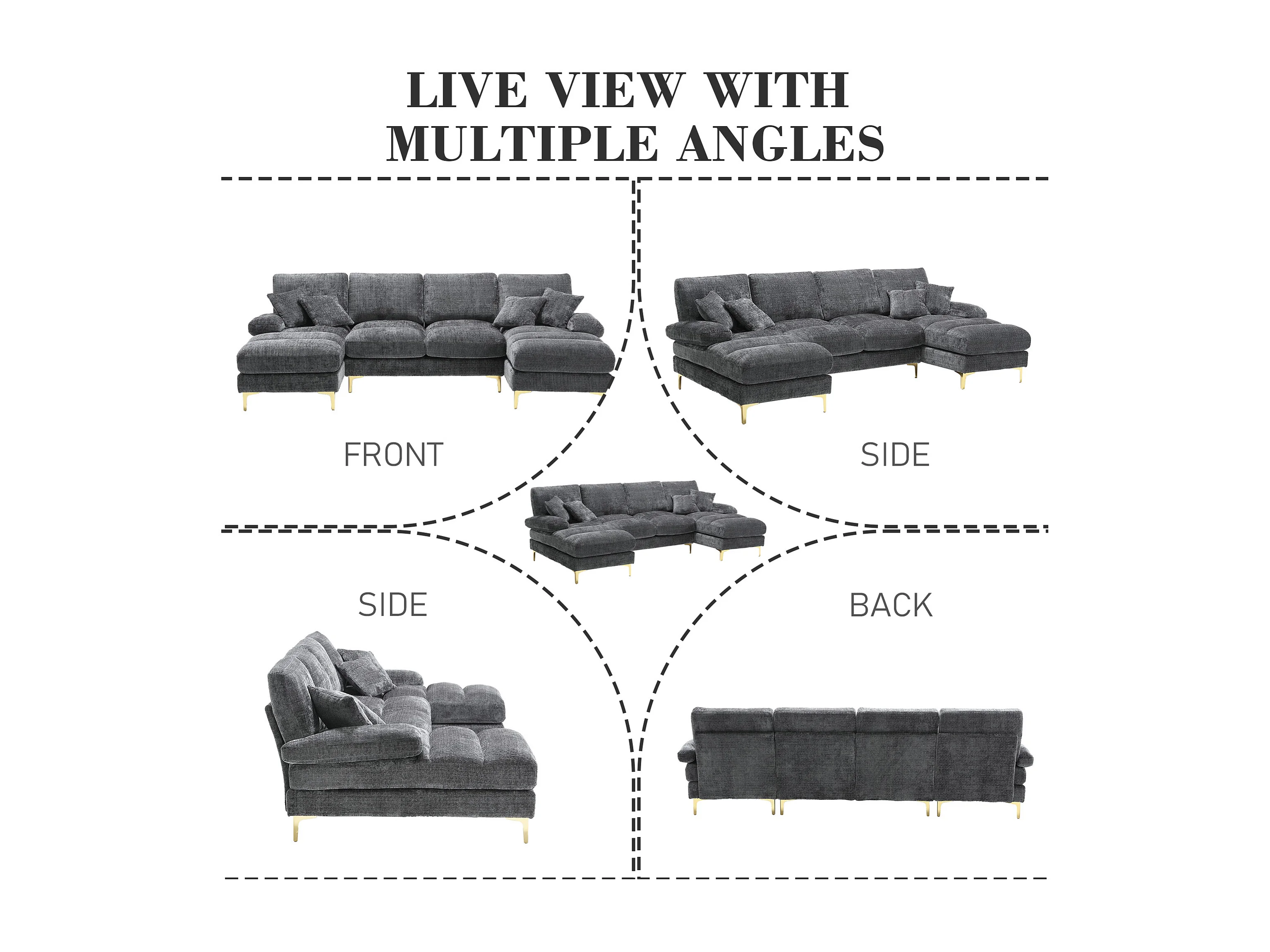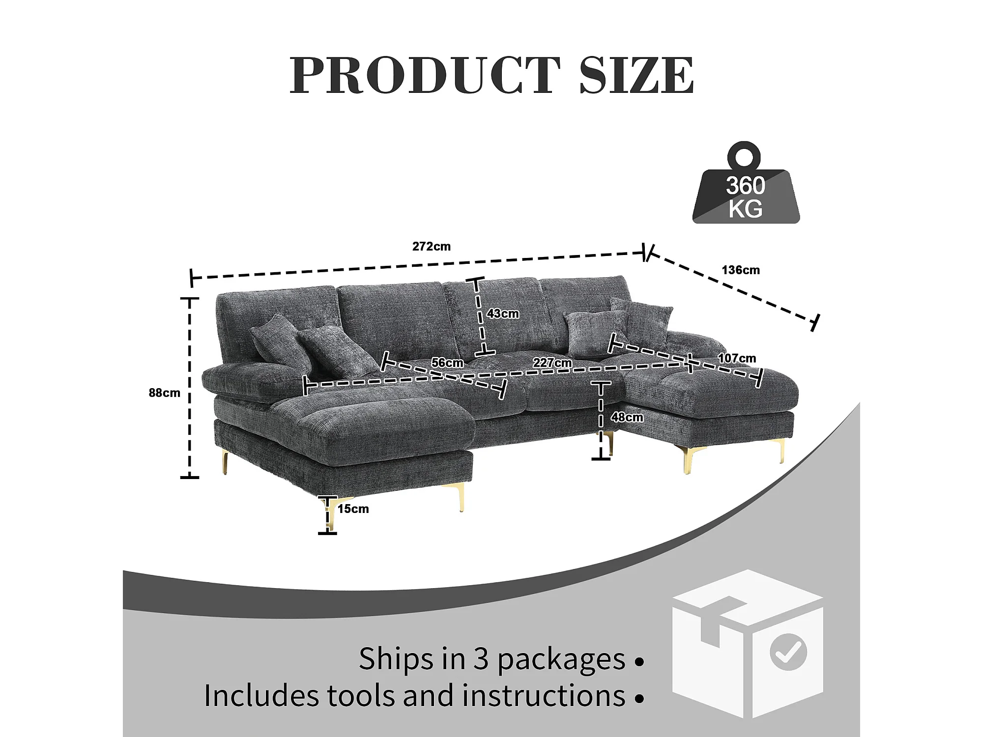 Canapé 4 Places Panoramique en Chenille Gris à Double Couche (272x136x88 cm) - Pieds Dorés pour un Confort Exceptionnel