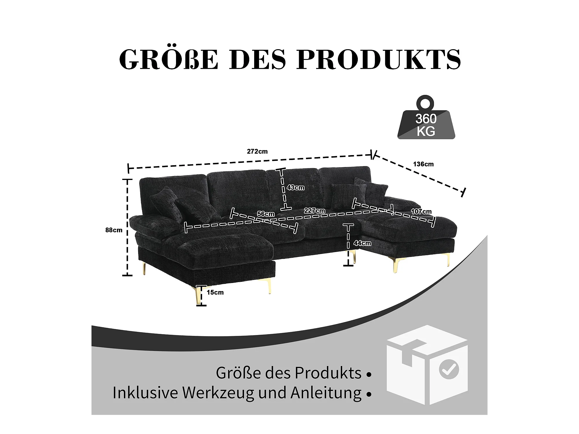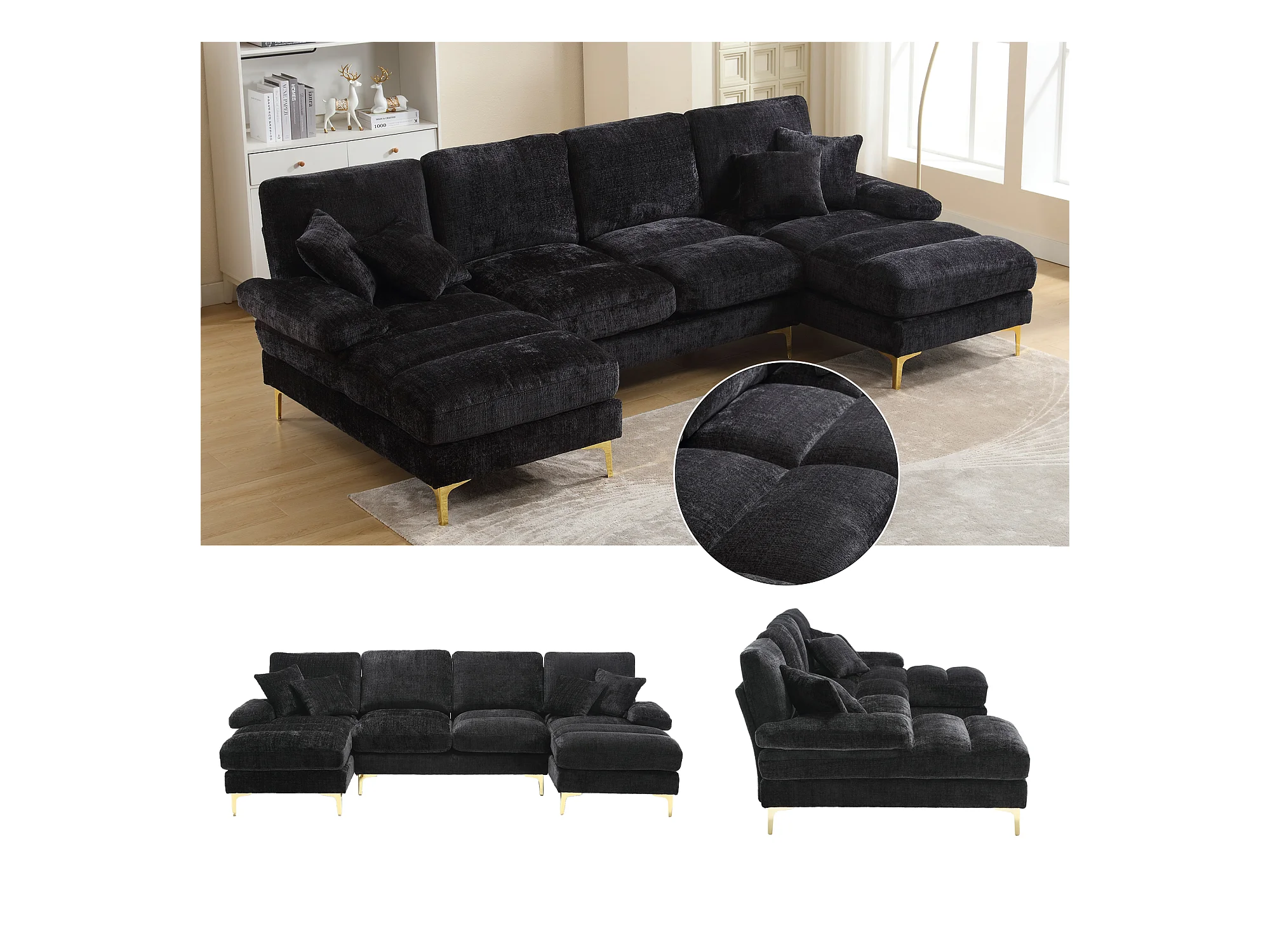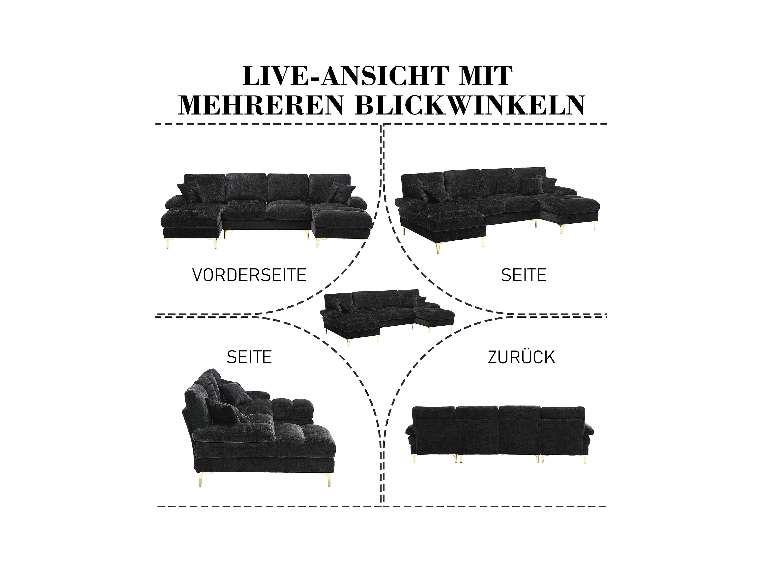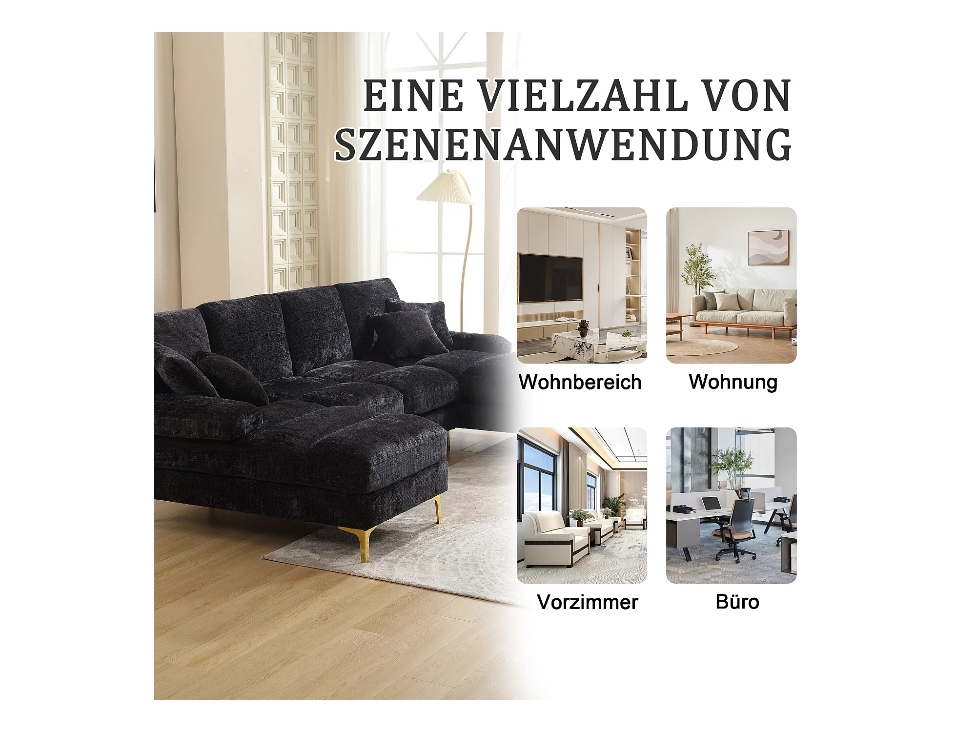 Canapé moderne en U - 272 x 136 x 88 cm - avec 2 sièges inclinables pour salon chambre - Chenille - noir
