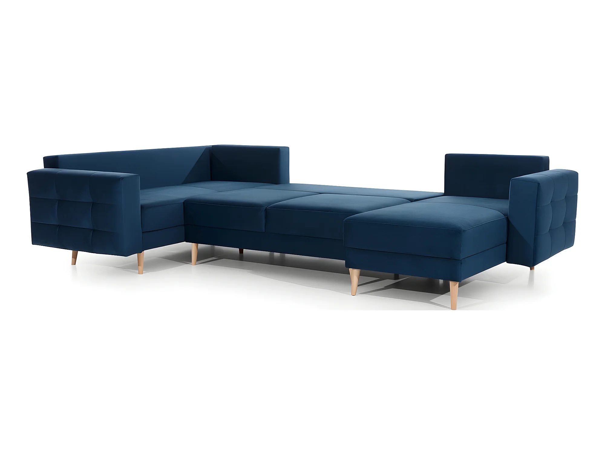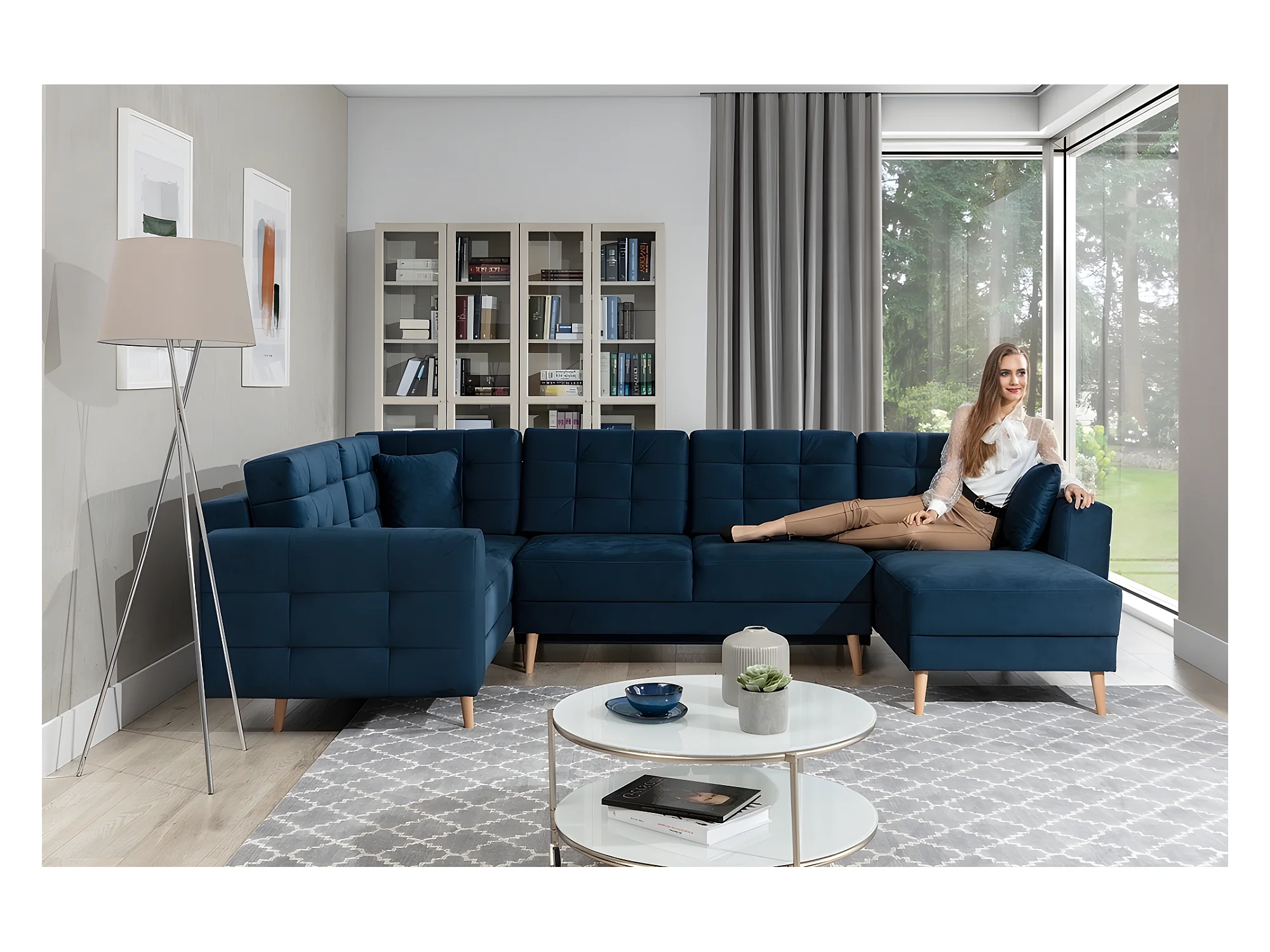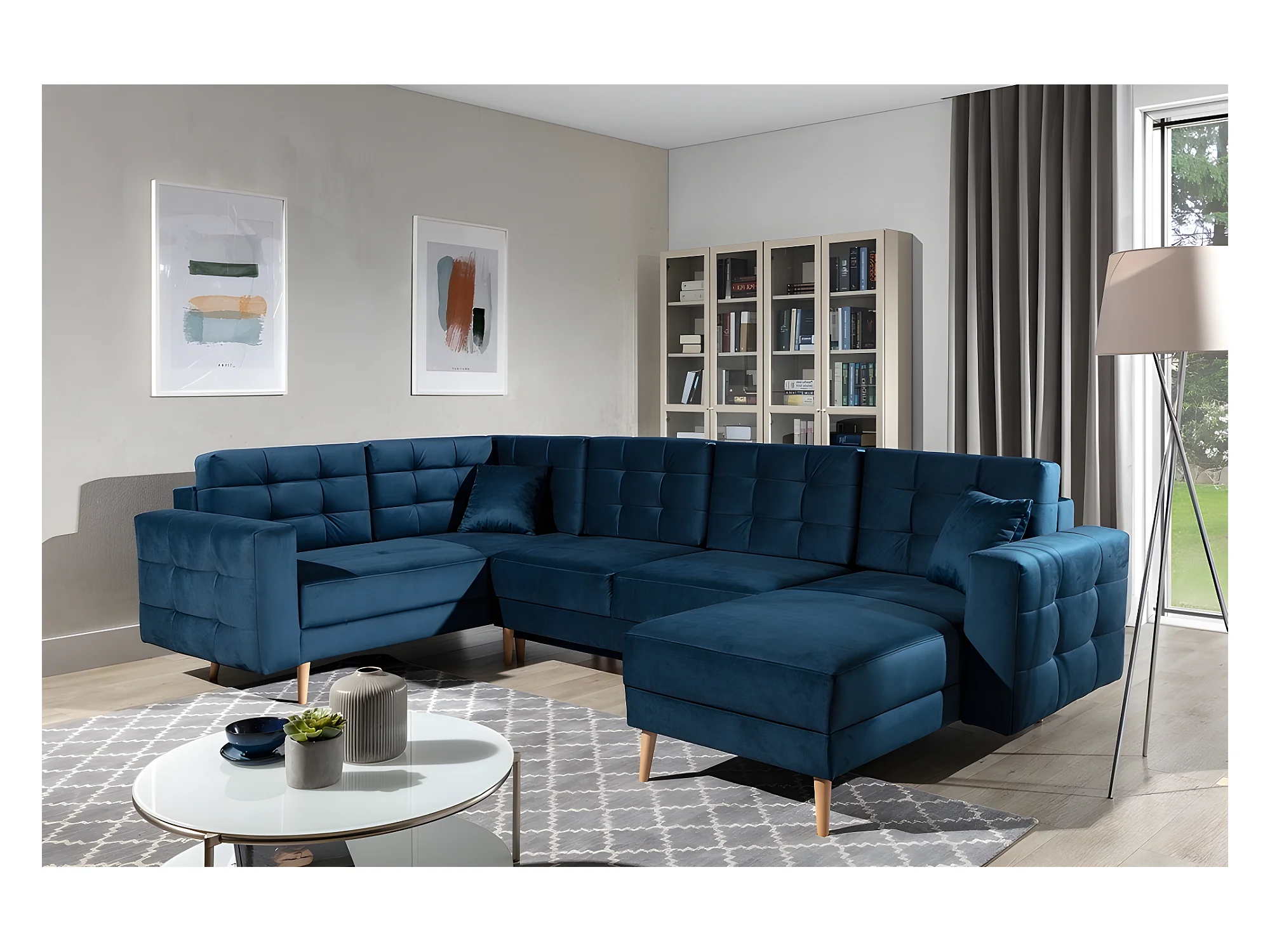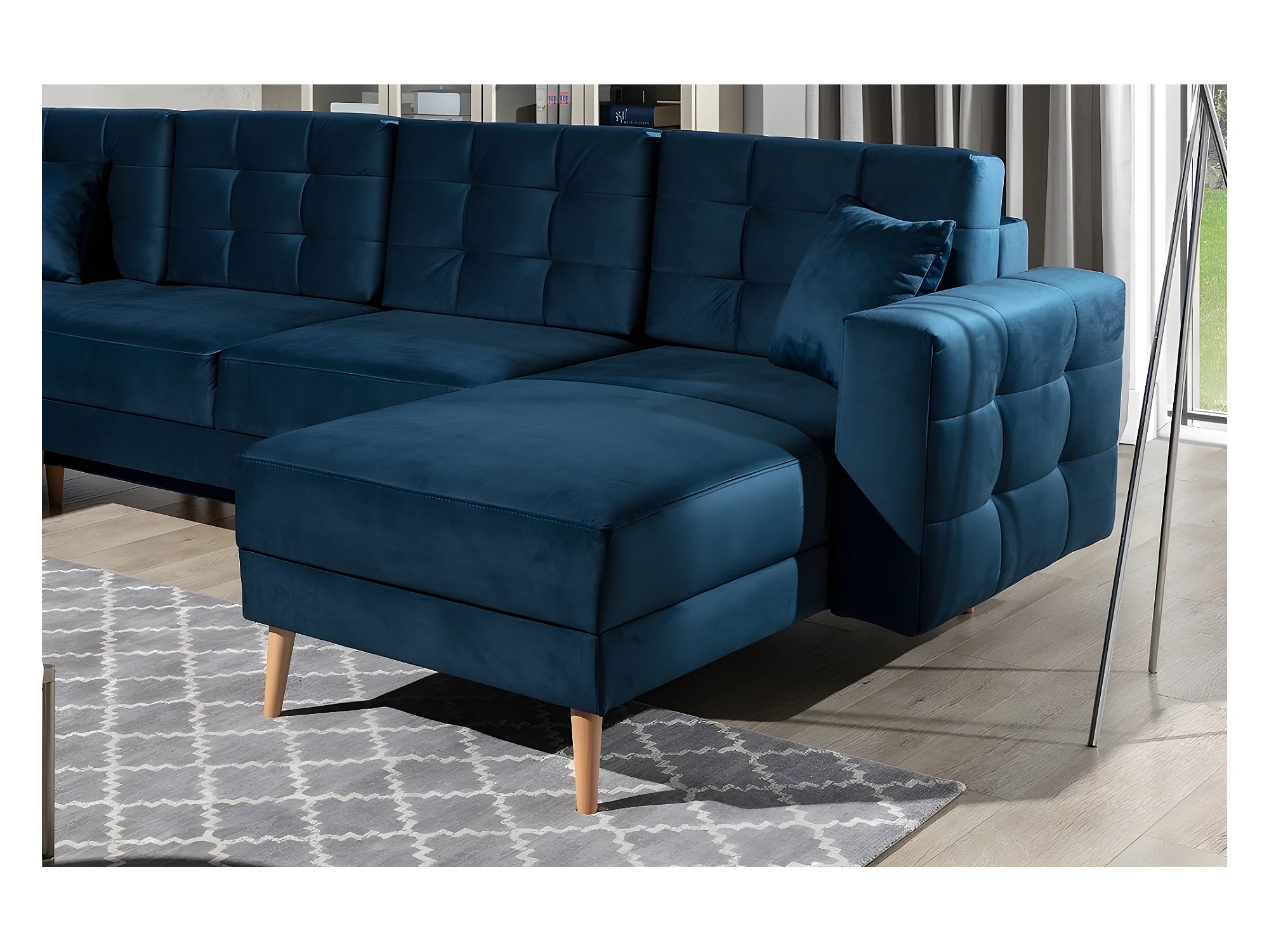 Canapé panoramique convertible - ASMA VELOURS - en tissu de qualité 5 places, bleu foncé, méridienne à droite et angle à gauche (vu de face)